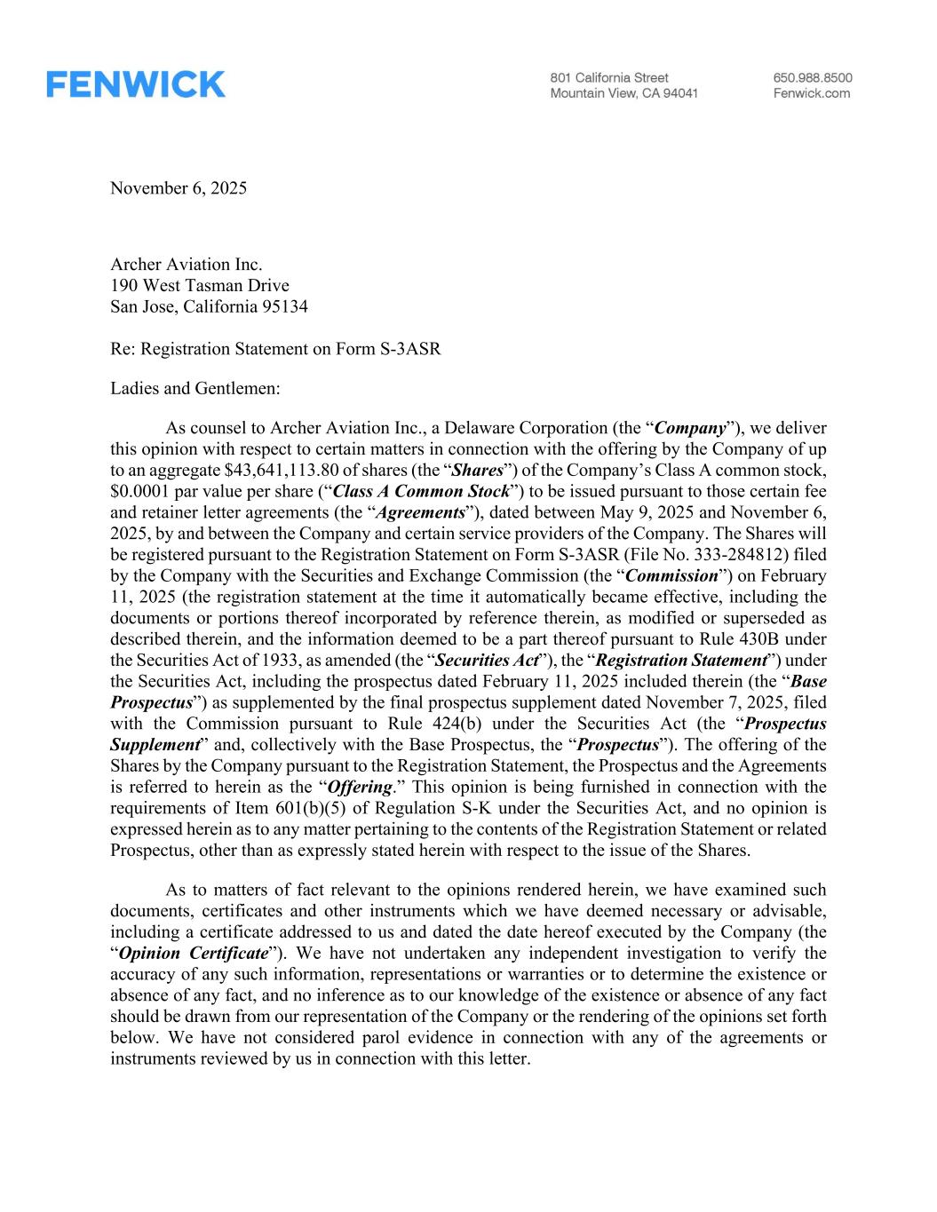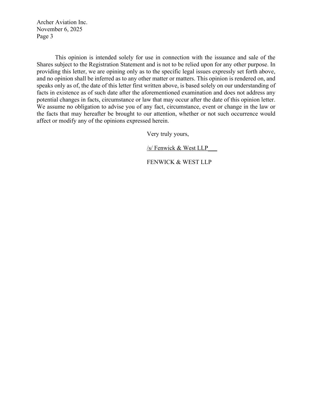 Archer Aviation Inc. November 6, 2025 Page 3 This opinion is intended solely for use in connection with the issuance and sale of the Shares subject to the Registration Statement and is not to be relied upon for any other purpose. In providing this letter, we are opining only as to the specific legal issues expressly set forth above, and no opinion shall be inferred as to any other matter or matters. This opinion is rendered on, and speaks only as of, the date of this letter first written above, is based solely on our understanding of facts in existence as of such date after the aforementioned examination and does not address any potential changes in facts, circumstance or law that may occur after the date of this opinion letter. We assume no obligation to advise you of any fact, circumstance, event or change in the law or the facts that may hereafter be brought to our attention, whether or not such occurrence would affect or modify any of the opinions expressed herein. Very truly yours, /s/ Fenwick & West LLP___ FENWICK & WEST LLP
