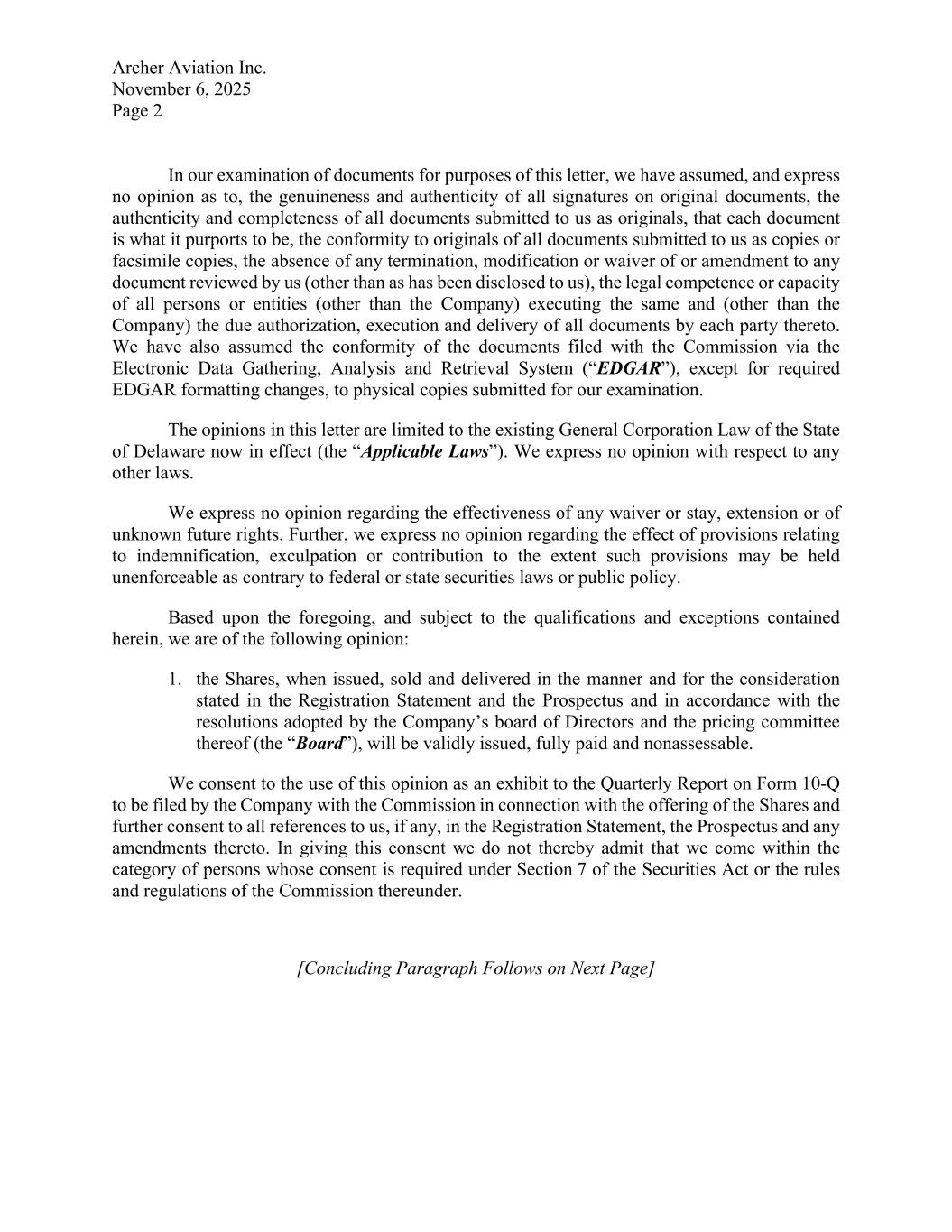 Archer Aviation Inc. November 6, 2025 Page 2 In our examination of documents for purposes of this letter, we have assumed, and express no opinion as to, the genuineness and authenticity of all signatures on original documents, the authenticity and completeness of all documents submitted to us as originals, that each document is what it purports to be, the conformity to originals of all documents submitted to us as copies or facsimile copies, the absence of any termination, modification or waiver of or amendment to any document reviewed by us (other than as has been disclosed to us), the legal competence or capacity of all persons or entities (other than the Company) executing the same and (other than the Company) the due authorization, execution and delivery of all documents by each party thereto. We have also assumed the conformity of the documents filed with the Commission via the Electronic Data Gathering, Analysis and Retrieval System (“EDGAR”), except for required EDGAR formatting changes, to physical copies submitted for our examination. The opinions in this letter are limited to the existing General Corporation Law of the State of Delaware now in effect (the “Applicable Laws”). We express no opinion with respect to any other laws. We express no opinion regarding the effectiveness of any waiver or stay, extension or of unknown future rights. Further, we express no opinion regarding the effect of provisions relating to indemnification, exculpation or contribution to the extent such provisions may be held unenforceable as contrary to federal or state securities laws or public policy. Based upon the foregoing, and subject to the qualifications and exceptions contained herein, we are of the following opinion: 1. the Shares, when issued, sold and delivered in the manner and for the consideration stated in the Registration Statement and the Prospectus and in accordance with the resolutions adopted by the Company’s board of Directors and the pricing committee thereof (the “Board”), will be validly issued, fully paid and nonassessable. We consent to the use of this opinion as an exhibit to the Quarterly Report on Form 10-Q to be filed by the Company with the Commission in connection with the offering of the Shares and further consent to all references to us, if any, in the Registration Statement, the Prospectus and any amendments thereto. In giving this consent we do not thereby admit that we come within the category of persons whose consent is required under Section 7 of the Securities Act or the rules and regulations of the Commission thereunder. [Concluding Paragraph Follows on Next Page]