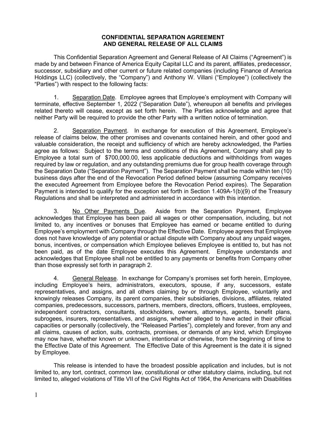 1 CONFIDENTIAL SEPARATION AGREEMENT AND GENERAL RELEASE OF ALL CLAIMS This Confidential Separation Agreement and General Release of All Claims (“Agreement”) is made by and between Finance of America Equity Capital LLC and its parent, affiliates, predecessor, successor, subsidiary and other current or future related companies (including Finance of America Holdings LLC) (collectively, the “Company”) and Anthony W. Villani (“Employee”) (collectively the “Parties”) with respect to the following facts: 1. Separation Date. Employee agrees that Employee’s employment with Company will terminate, effective September 1, 2022 (“Separation Date”), whereupon all benefits and privileges related thereto will cease, except as set forth herein. The Parties acknowledge and agree that neither Party will be required to provide the other Party with a written notice of termination. 2. Separation Payment. In exchange for execution of this Agreement, Employee’s release of claims below, the other promises and covenants contained herein, and other good and valuable consideration, the receipt and sufficiency of which are hereby acknowledged, the Parties agree as follows: Subject to the terms and conditions of this Agreement, Company shall pay to Employee a total sum of $700,000.00, less applicable deductions and withholdings from wages required by law or regulation, and any outstanding premiums due for group health coverage through the Separation Date (“Separation Payment”). The Separation Payment shall be made within ten (10) business days after the end of the Revocation Period defined below (assuming Company receives the executed Agreement from Employee before the Revocation Period expires). The Separation Payment is intended to qualify for the exception set forth in Section 1.409A-1(b)(9) of the Treasury Regulations and shall be interpreted and administered in accordance with this intention. 3. No Other Payments Due. Aside from the Separation Payment, Employee acknowledges that Employee has been paid all wages or other compensation, including, but not limited to, any incentives or bonuses that Employee has earned or became entitled to during Employee’s employment with Company through the Effective Date. Employee agrees that Employee does not have knowledge of any potential or actual dispute with Company about any unpaid wages, bonus, incentives, or compensation which Employee believes Employee is entitled to, but has not been paid, as of the date Employee executes this Agreement. Employee understands and acknowledges that Employee shall not be entitled to any payments or benefits from Company other than those expressly set forth in paragraph 2. 4. General Release. In exchange for Company’s promises set forth herein, Employee, including Employee’s heirs, administrators, executors, spouse, if any, successors, estate representatives, and assigns, and all others claiming by or through Employee, voluntarily and knowingly releases Company, its parent companies, their subsidiaries, divisions, affiliates, related companies, predecessors, successors, partners, members, directors, officers, trustees, employees, independent contractors, consultants, stockholders, owners, attorneys, agents, benefit plans, subrogees, insurers, representatives, and assigns, whether alleged to have acted in their official capacities or personally (collectively, the “Released Parties”), completely and forever, from any and all claims, causes of action, suits, contracts, promises, or demands of any kind, which Employee may now have, whether known or unknown, intentional or otherwise, from the beginning of time to the Effective Date of this Agreement. The Effective Date of this Agreement is the date it is signed by Employee. This release is intended to have the broadest possible application and includes, but is not limited to, any tort, contract, common law, constitutional or other statutory claims, including, but not limited to, alleged violations of Title VII of the Civil Rights Act of 1964, the Americans with Disabilities