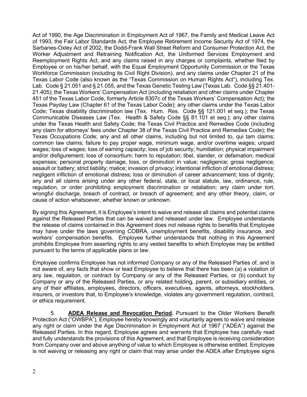 2 Act of 1990, the Age Discrimination in Employment Act of 1967, the Family and Medical Leave Act of 1993, the Fair Labor Standards Act, the Employee Retirement Income Security Act of 1974, the Sarbanes-Oxley Act of 2002, the Dodd-Frank Wall Street Reform and Consumer Protection Act, the Worker Adjustment and Retraining Notification Act, the Uniformed Services Employment and Reemployment Rights Act, and any claims raised in any charges or complaints, whether filed by Employee or on his/her behalf, with the Equal Employment Opportunity Commission or the Texas Workforce Commission (including its Civil Right Division), and any claims under Chapter 21 of the Texas Labor Code (also known as the “Texas Commission on Human Rights Act”), including Tex. Lab. Code § 21.051 and § 21.055, and the Texas Genetic Testing Law (Texas Lab. Code §§ 21.401- 21.405); the Texas Workers’ Compensation Act (including retaliation and other claims under Chapter 451 of the Texas Labor Code, formerly Article 8307c of the Texas Workers’ Compensation Act); the Texas Payday Law (Chapter 61 of the Texas Labor Code); any other claims under the Texas Labor Code; Texas disability discrimination law (Tex. Hum. Res. Code §§ 121.001 et seq.); the Texas Communicable Diseases Law (Tex. Health & Safety Code §§ 81.101 et seq.); any other claims under the Texas Health and Safety Code; the Texas Civil Practice and Remedies Code (including any claim for attorneys’ fees under Chapter 38 of the Texas Civil Practice and Remedies Code); the Texas Occupations Code; any and all other claims, including but not limited to, qui tam claims; common law claims; failure to pay proper wage, minimum wage, and/or overtime wages; unpaid wages; loss of wages; loss of earning capacity; loss of job security; humiliation; physical impairment and/or disfigurement; loss of consortium; harm to reputation; libel, slander, or defamation; medical expenses; personal property damage, loss, or diminution in value; negligence; gross negligence; assault or battery; strict liability; malice; invasion of privacy; intentional infliction of emotional distress; negligent infliction of emotional distress; loss or diminution of career advancement; loss of dignity; any and all claims arising under any other federal, state, or local statute, law, ordinance, rule, regulation, or order prohibiting employment discrimination or retaliation; any claim under tort, wrongful discharge, breach of contract, or breach of agreement; and any other theory, claim, or cause of action whatsoever, whether known or unknown. By signing this Agreement, it is Employee’s intent to waive and release all claims and potential claims against the Released Parties that can be waived and released under law. Employee understands the release of claims contained in this Agreement does not release rights to benefits that Employee may have under the laws governing COBRA, unemployment benefits, disability insurance, and workers’ compensation benefits. Employee further understands that nothing in this Agreement prohibits Employee from asserting rights to any vested benefits to which Employee may be entitled pursuant to the terms of applicable plans or law. Employee confirms Employee has not informed Company or any of the Released Parties of, and is not aware of, any facts that show or lead Employee to believe that there has been (a) a violation of any law, regulation, or contract by Company or any of the Released Parties, or (b) conduct by Company or any of the Released Parties, or any related holding, parent, or subsidiary entities, or any of their affiliates, employees, directors, officers, executives, agents, attorneys, stockholders, insurers, or investors that, to Employee’s knowledge, violates any government regulation, contract, or ethics requirement. 5. ADEA Release and Revocation Period. Pursuant to the Older Workers Benefit Protection Act (“OWBPA”), Employee hereby knowingly and voluntarily agrees to waive and release any right or claim under the Age Discrimination in Employment Act of 1967 (“ADEA”) against the Released Parties. In this regard, Employee agrees and warrants that Employee has carefully read and fully understands the provisions of this Agreement, and that Employee is receiving consideration from Company over and above anything of value to which Employee is otherwise entitled. Employee is not waiving or releasing any right or claim that may arise under the ADEA after Employee signs