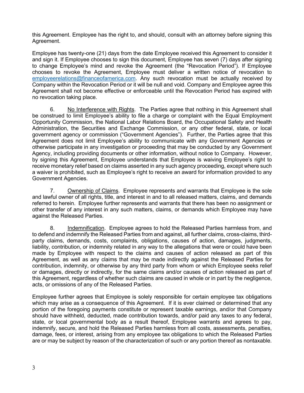 3 this Agreement. Employee has the right to, and should, consult with an attorney before signing this Agreement. Employee has twenty-one (21) days from the date Employee received this Agreement to consider it and sign it. If Employee chooses to sign this document, Employee has seven (7) days after signing to change Employee’s mind and revoke the Agreement (the “Revocation Period”). If Employee chooses to revoke the Agreement, Employee must deliver a written notice of revocation to employeerelations@financeofamerica.com. Any such revocation must be actually received by Company within the Revocation Period or it will be null and void. Company and Employee agree this Agreement shall not become effective or enforceable until the Revocation Period has expired with no revocation taking place. 6. No Interference with Rights. The Parties agree that nothing in this Agreement shall be construed to limit Employee’s ability to file a charge or complaint with the Equal Employment Opportunity Commission, the National Labor Relations Board, the Occupational Safety and Health Administration, the Securities and Exchange Commission, or any other federal, state, or local government agency or commission (“Government Agencies”). Further, the Parties agree that this Agreement does not limit Employee’s ability to communicate with any Government Agencies or otherwise participate in any investigation or proceeding that may be conducted by any Government Agency, including providing documents or other information, without notice to Company. However, by signing this Agreement, Employee understands that Employee is waiving Employee’s right to receive monetary relief based on claims asserted in any such agency proceeding, except where such a waiver is prohibited, such as Employee’s right to receive an award for information provided to any Government Agencies. 7. Ownership of Claims. Employee represents and warrants that Employee is the sole and lawful owner of all rights, title, and interest in and to all released matters, claims, and demands referred to herein. Employee further represents and warrants that there has been no assignment or other transfer of any interest in any such matters, claims, or demands which Employee may have against the Released Parties. 8. Indemnification. Employee agrees to hold the Released Parties harmless from, and to defend and indemnify the Released Parties from and against, all further claims, cross-claims, third- party claims, demands, costs, complaints, obligations, causes of action, damages, judgments, liability, contribution, or indemnity related in any way to the allegations that were or could have been made by Employee with respect to the claims and causes of action released as part of this Agreement, as well as any claims that may be made indirectly against the Released Parties for contribution, indemnity, or otherwise by any third party from whom or which Employee seeks relief or damages, directly or indirectly, for the same claims and/or causes of action released as part of this Agreement, regardless of whether such claims are caused in whole or in part by the negligence, acts, or omissions of any of the Released Parties. Employee further agrees that Employee is solely responsible for certain employee tax obligations which may arise as a consequence of this Agreement. If it is ever claimed or determined that any portion of the foregoing payments constitute or represent taxable earnings, and/or that Company should have withheld, deducted, made contribution towards, and/or paid any taxes to any federal, state, or local governmental body as a result thereof, Employee warrants and agrees to pay, indemnify, secure, and hold the Released Parties harmless from all costs, assessments, penalties, damage, fees, or interest, arising from any employee tax obligations to which the Released Parties are or may be subject by reason of the characterization of such or any portion thereof as nontaxable.