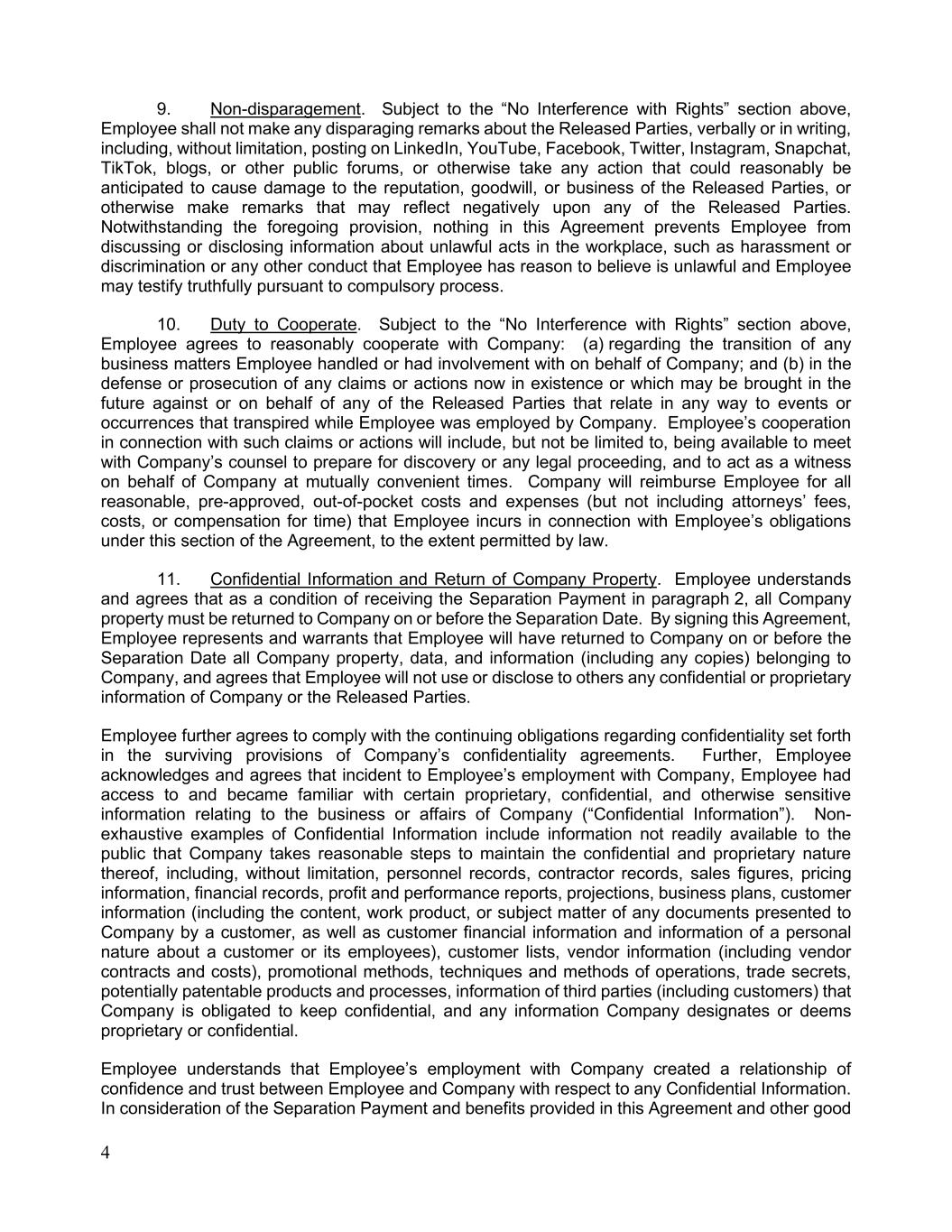 4 9. Non-disparagement. Subject to the “No Interference with Rights” section above, Employee shall not make any disparaging remarks about the Released Parties, verbally or in writing, including, without limitation, posting on LinkedIn, YouTube, Facebook, Twitter, Instagram, Snapchat, TikTok, blogs, or other public forums, or otherwise take any action that could reasonably be anticipated to cause damage to the reputation, goodwill, or business of the Released Parties, or otherwise make remarks that may reflect negatively upon any of the Released Parties. Notwithstanding the foregoing provision, nothing in this Agreement prevents Employee from discussing or disclosing information about unlawful acts in the workplace, such as harassment or discrimination or any other conduct that Employee has reason to believe is unlawful and Employee may testify truthfully pursuant to compulsory process. 10. Duty to Cooperate. Subject to the “No Interference with Rights” section above, Employee agrees to reasonably cooperate with Company: (a) regarding the transition of any business matters Employee handled or had involvement with on behalf of Company; and (b) in the defense or prosecution of any claims or actions now in existence or which may be brought in the future against or on behalf of any of the Released Parties that relate in any way to events or occurrences that transpired while Employee was employed by Company. Employee’s cooperation in connection with such claims or actions will include, but not be limited to, being available to meet with Company’s counsel to prepare for discovery or any legal proceeding, and to act as a witness on behalf of Company at mutually convenient times. Company will reimburse Employee for all reasonable, pre-approved, out-of-pocket costs and expenses (but not including attorneys’ fees, costs, or compensation for time) that Employee incurs in connection with Employee’s obligations under this section of the Agreement, to the extent permitted by law. 11. Confidential Information and Return of Company Property. Employee understands and agrees that as a condition of receiving the Separation Payment in paragraph 2, all Company property must be returned to Company on or before the Separation Date. By signing this Agreement, Employee represents and warrants that Employee will have returned to Company on or before the Separation Date all Company property, data, and information (including any copies) belonging to Company, and agrees that Employee will not use or disclose to others any confidential or proprietary information of Company or the Released Parties. Employee further agrees to comply with the continuing obligations regarding confidentiality set forth in the surviving provisions of Company’s confidentiality agreements. Further, Employee acknowledges and agrees that incident to Employee’s employment with Company, Employee had access to and became familiar with certain proprietary, confidential, and otherwise sensitive information relating to the business or affairs of Company (“Confidential Information”). Non- exhaustive examples of Confidential Information include information not readily available to the public that Company takes reasonable steps to maintain the confidential and proprietary nature thereof, including, without limitation, personnel records, contractor records, sales figures, pricing information, financial records, profit and performance reports, projections, business plans, customer information (including the content, work product, or subject matter of any documents presented to Company by a customer, as well as customer financial information and information of a personal nature about a customer or its employees), customer lists, vendor information (including vendor contracts and costs), promotional methods, techniques and methods of operations, trade secrets, potentially patentable products and processes, information of third parties (including customers) that Company is obligated to keep confidential, and any information Company designates or deems proprietary or confidential. Employee understands that Employee’s employment with Company created a relationship of confidence and trust between Employee and Company with respect to any Confidential Information. In consideration of the Separation Payment and benefits provided in this Agreement and other good