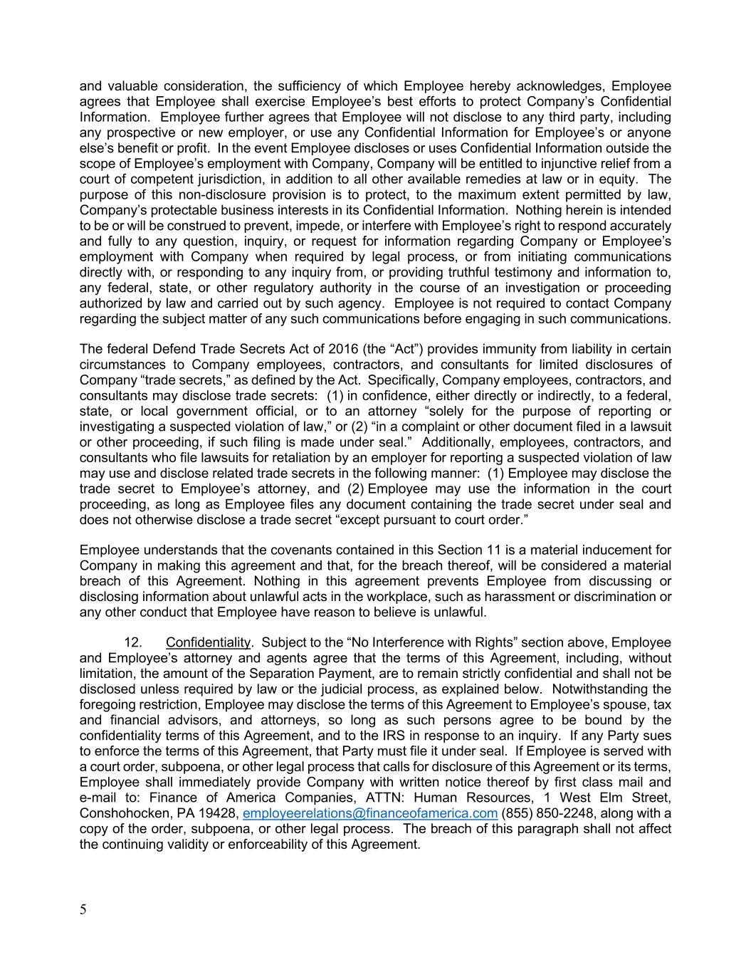 5 and valuable consideration, the sufficiency of which Employee hereby acknowledges, Employee agrees that Employee shall exercise Employee’s best efforts to protect Company’s Confidential Information. Employee further agrees that Employee will not disclose to any third party, including any prospective or new employer, or use any Confidential Information for Employee’s or anyone else’s benefit or profit. In the event Employee discloses or uses Confidential Information outside the scope of Employee’s employment with Company, Company will be entitled to injunctive relief from a court of competent jurisdiction, in addition to all other available remedies at law or in equity. The purpose of this non-disclosure provision is to protect, to the maximum extent permitted by law, Company’s protectable business interests in its Confidential Information. Nothing herein is intended to be or will be construed to prevent, impede, or interfere with Employee’s right to respond accurately and fully to any question, inquiry, or request for information regarding Company or Employee’s employment with Company when required by legal process, or from initiating communications directly with, or responding to any inquiry from, or providing truthful testimony and information to, any federal, state, or other regulatory authority in the course of an investigation or proceeding authorized by law and carried out by such agency. Employee is not required to contact Company regarding the subject matter of any such communications before engaging in such communications. The federal Defend Trade Secrets Act of 2016 (the “Act”) provides immunity from liability in certain circumstances to Company employees, contractors, and consultants for limited disclosures of Company “trade secrets,” as defined by the Act. Specifically, Company employees, contractors, and consultants may disclose trade secrets: (1) in confidence, either directly or indirectly, to a federal, state, or local government official, or to an attorney “solely for the purpose of reporting or investigating a suspected violation of law,” or (2) “in a complaint or other document filed in a lawsuit or other proceeding, if such filing is made under seal.” Additionally, employees, contractors, and consultants who file lawsuits for retaliation by an employer for reporting a suspected violation of law may use and disclose related trade secrets in the following manner: (1) Employee may disclose the trade secret to Employee’s attorney, and (2) Employee may use the information in the court proceeding, as long as Employee files any document containing the trade secret under seal and does not otherwise disclose a trade secret “except pursuant to court order.” Employee understands that the covenants contained in this Section 11 is a material inducement for Company in making this agreement and that, for the breach thereof, will be considered a material breach of this Agreement. Nothing in this agreement prevents Employee from discussing or disclosing information about unlawful acts in the workplace, such as harassment or discrimination or any other conduct that Employee have reason to believe is unlawful. 12. Confidentiality. Subject to the “No Interference with Rights” section above, Employee and Employee’s attorney and agents agree that the terms of this Agreement, including, without limitation, the amount of the Separation Payment, are to remain strictly confidential and shall not be disclosed unless required by law or the judicial process, as explained below. Notwithstanding the foregoing restriction, Employee may disclose the terms of this Agreement to Employee’s spouse, tax and financial advisors, and attorneys, so long as such persons agree to be bound by the confidentiality terms of this Agreement, and to the IRS in response to an inquiry. If any Party sues to enforce the terms of this Agreement, that Party must file it under seal. If Employee is served with a court order, subpoena, or other legal process that calls for disclosure of this Agreement or its terms, Employee shall immediately provide Company with written notice thereof by first class mail and e-mail to: Finance of America Companies, ATTN: Human Resources, 1 West Elm Street, Conshohocken, PA 19428, employeerelations@financeofamerica.com (855) 850-2248, along with a copy of the order, subpoena, or other legal process. The breach of this paragraph shall not affect the continuing validity or enforceability of this Agreement.