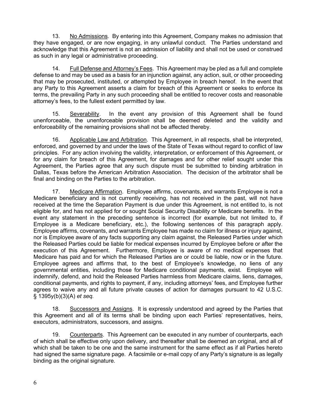 6 13. No Admissions. By entering into this Agreement, Company makes no admission that they have engaged, or are now engaging, in any unlawful conduct. The Parties understand and acknowledge that this Agreement is not an admission of liability and shall not be used or construed as such in any legal or administrative proceeding. 14. Full Defense and Attorney’s Fees. This Agreement may be pled as a full and complete defense to and may be used as a basis for an injunction against, any action, suit, or other proceeding that may be prosecuted, instituted, or attempted by Employee in breach hereof. In the event that any Party to this Agreement asserts a claim for breach of this Agreement or seeks to enforce its terms, the prevailing Party in any such proceeding shall be entitled to recover costs and reasonable attorney’s fees, to the fullest extent permitted by law. 15. Severability. In the event any provision of this Agreement shall be found unenforceable, the unenforceable provision shall be deemed deleted and the validity and enforceability of the remaining provisions shall not be affected thereby. 16. Applicable Law and Arbitration. This Agreement, in all respects, shall be interpreted, enforced, and governed by and under the laws of the State of Texas without regard to conflict of law principles. For any action involving the validity, interpretation, or enforcement of this Agreement, or for any claim for breach of this Agreement, for damages and for other relief sought under this Agreement, the Parties agree that any such dispute must be submitted to binding arbitration in Dallas, Texas before the American Arbitration Association. The decision of the arbitrator shall be final and binding on the Parties to the arbitration. 17. Medicare Affirmation. Employee affirms, covenants, and warrants Employee is not a Medicare beneficiary and is not currently receiving, has not received in the past, will not have received at the time the Separation Payment is due under this Agreement, is not entitled to, is not eligible for, and has not applied for or sought Social Security Disability or Medicare benefits. In the event any statement in the preceding sentence is incorrect (for example, but not limited to, if Employee is a Medicare beneficiary, etc.), the following sentences of this paragraph apply. Employee affirms, covenants, and warrants Employee has made no claim for illness or injury against, nor is Employee aware of any facts supporting any claim against, the Released Parties under which the Released Parties could be liable for medical expenses incurred by Employee before or after the execution of this Agreement. Furthermore, Employee is aware of no medical expenses that Medicare has paid and for which the Released Parties are or could be liable, now or in the future. Employee agrees and affirms that, to the best of Employee’s knowledge, no liens of any governmental entities, including those for Medicare conditional payments, exist. Employee will indemnify, defend, and hold the Released Parties harmless from Medicare claims, liens, damages, conditional payments, and rights to payment, if any, including attorneys’ fees, and Employee further agrees to waive any and all future private causes of action for damages pursuant to 42 U.S.C. § 1395y(b)(3)(A) et seq. 18. Successors and Assigns. It is expressly understood and agreed by the Parties that this Agreement and all of its terms shall be binding upon each Parties’ representatives, heirs, executors, administrators, successors, and assigns. 19. Counterparts. This Agreement can be executed in any number of counterparts, each of which shall be effective only upon delivery, and thereafter shall be deemed an original, and all of which shall be taken to be one and the same instrument for the same effect as if all Parties hereto had signed the same signature page. A facsimile or e-mail copy of any Party’s signature is as legally binding as the original signature.