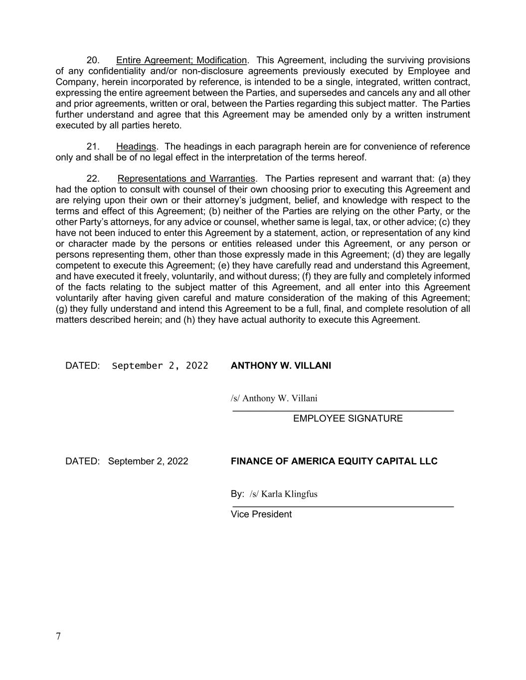 7 20. Entire Agreement; Modification. This Agreement, including the surviving provisions of any confidentiality and/or non-disclosure agreements previously executed by Employee and Company, herein incorporated by reference, is intended to be a single, integrated, written contract, expressing the entire agreement between the Parties, and supersedes and cancels any and all other and prior agreements, written or oral, between the Parties regarding this subject matter. The Parties further understand and agree that this Agreement may be amended only by a written instrument executed by all parties hereto. 21. Headings. The headings in each paragraph herein are for convenience of reference only and shall be of no legal effect in the interpretation of the terms hereof. 22. Representations and Warranties. The Parties represent and warrant that: (a) they had the option to consult with counsel of their own choosing prior to executing this Agreement and are relying upon their own or their attorney’s judgment, belief, and knowledge with respect to the terms and effect of this Agreement; (b) neither of the Parties are relying on the other Party, or the other Party’s attorneys, for any advice or counsel, whether same is legal, tax, or other advice; (c) they have not been induced to enter this Agreement by a statement, action, or representation of any kind or character made by the persons or entities released under this Agreement, or any person or persons representing them, other than those expressly made in this Agreement; (d) they are legally competent to execute this Agreement; (e) they have carefully read and understand this Agreement, and have executed it freely, voluntarily, and without duress; (f) they are fully and completely informed of the facts relating to the subject matter of this Agreement, and all enter into this Agreement voluntarily after having given careful and mature consideration of the making of this Agreement; (g) they fully understand and intend this Agreement to be a full, final, and complete resolution of all matters described herein; and (h) they have actual authority to execute this Agreement. DATED: September 2, 2022 ANTHONY W. VILLANI /s/ Anthony W. Villani _______________________________________ EMPLOYEE SIGNATURE DATED: September 2, 2022 FINANCE OF AMERICA EQUITY CAPITAL LLC By: /s/ Karla Klingfus _______________________________________ Vice President