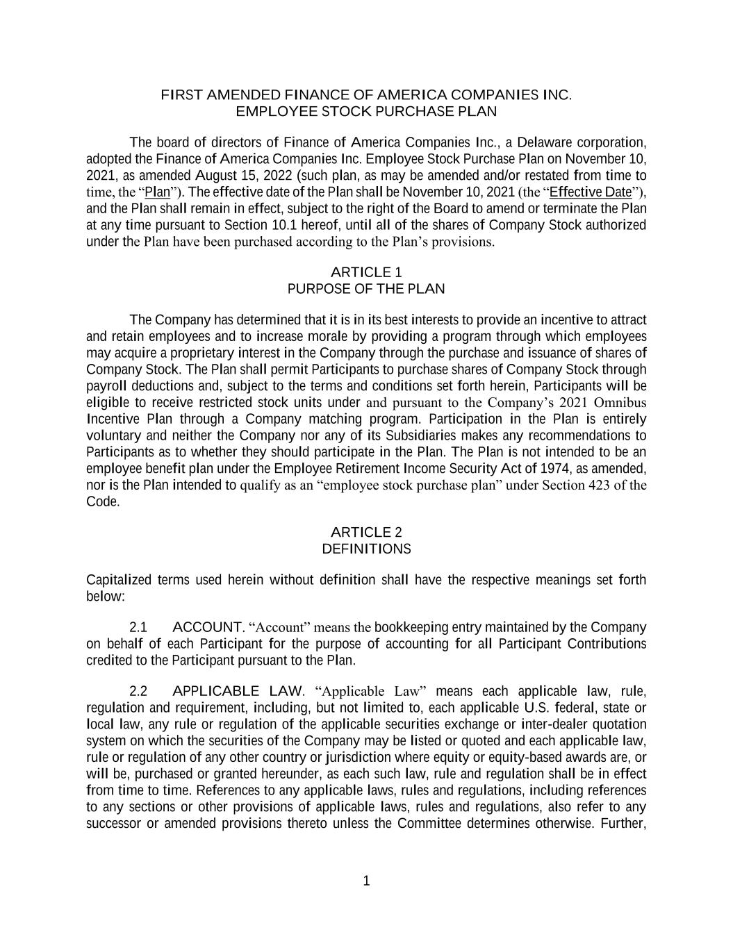 1 FIRST AMENDED FINANCE OF AMERICA COMPANIES INC. EMPLOYEE STOCK PURCHASE PLAN The board of directors of Finance of America Companies Inc., a Delaware corporation, adopted the Finance of America Companies Inc. Employee Stock Purchase Plan on November 10, 2021, as amended August 15, 2022 (such plan, as may be amended and/or restated from time to time, the “Plan”). The effective date of the Plan shall be November 10, 2021 (the “Effective Date”), and the Plan shall remain in effect, subject to the right of the Board to amend or terminate the Plan at any time pursuant to Section 10.1 hereof, until all of the shares of Company Stock authorized under the Plan have been purchased according to the Plan’s provisions. ARTICLE 1 PURPOSE OF THE PLAN The Company has determined that it is in its best interests to provide an incentive to attract and retain employees and to increase morale by providing a program through which employees may acquire a proprietary interest in the Company through the purchase and issuance of shares of Company Stock. The Plan shall permit Participants to purchase shares of Company Stock through payroll deductions and, subject to the terms and conditions set forth herein, Participants will be eligible to receive restricted stock units under and pursuant to the Company’s 2021 Omnibus Incentive Plan through a Company matching program. Participation in the Plan is entirely voluntary and neither the Company nor any of its Subsidiaries makes any recommendations to Participants as to whether they should participate in the Plan. The Plan is not intended to be an employee benefit plan under the Employee Retirement Income Security Act of 1974, as amended, nor is the Plan intended to qualify as an “employee stock purchase plan” under Section 423 of the Code. ARTICLE 2 DEFINITIONS Capitalized terms used herein without definition shall have the respective meanings set forth below: 2.1 ACCOUNT. “Account” means the bookkeeping entry maintained by the Company on behalf of each Participant for the purpose of accounting for all Participant Contributions credited to the Participant pursuant to the Plan. 2.2 APPLICABLE LAW. “Applicable Law” means each applicable law, rule, regulation and requirement, including, but not limited to, each applicable U.S. federal, state or local law, any rule or regulation of the applicable securities exchange or inter-dealer quotation system on which the securities of the Company may be listed or quoted and each applicable law, rule or regulation of any other country or jurisdiction where equity or equity-based awards are, or will be, purchased or granted hereunder, as each such law, rule and regulation shall be in effect from time to time. References to any applicable laws, rules and regulations, including references to any sections or other provisions of applicable laws, rules and regulations, also refer to any successor or amended provisions thereto unless the Committee determines otherwise. Further,