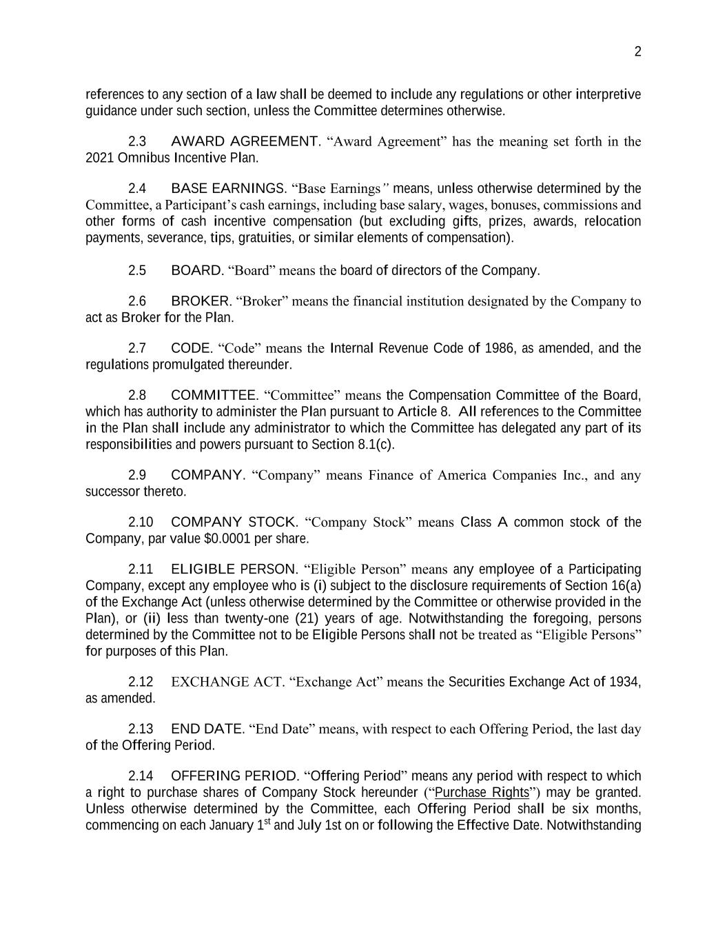 2 references to any section of a law shall be deemed to include any regulations or other interpretive guidance under such section, unless the Committee determines otherwise. 2.3 AWARD AGREEMENT. “Award Agreement” has the meaning set forth in the 2021 Omnibus Incentive Plan. 2.4 BASE EARNINGS. “Base Earnings” means, unless otherwise determined by the Committee, a Participant’s cash earnings, including base salary, wages, bonuses, commissions and other forms of cash incentive compensation (but excluding gifts, prizes, awards, relocation payments, severance, tips, gratuities, or similar elements of compensation). 2.5 BOARD. “Board” means the board of directors of the Company. 2.6 BROKER. “Broker” means the financial institution designated by the Company to act as Broker for the Plan. 2.7 CODE. “Code” means the Internal Revenue Code of 1986, as amended, and the regulations promulgated thereunder. 2.8 COMMITTEE. “Committee” means the Compensation Committee of the Board, which has authority to administer the Plan pursuant to Article 8. All references to the Committee in the Plan shall include any administrator to which the Committee has delegated any part of its responsibilities and powers pursuant to Section 8.1(c). 2.9 COMPANY. “Company” means Finance of America Companies Inc., and any successor thereto. 2.10 COMPANY STOCK. “Company Stock” means Class A common stock of the Company, par value $0.0001 per share. 2.11 ELIGIBLE PERSON. “Eligible Person” means any employee of a Participating Company, except any employee who is (i) subject to the disclosure requirements of Section 16(a) of the Exchange Act (unless otherwise determined by the Committee or otherwise provided in the Plan), or (ii) less than twenty-one (21) years of age. Notwithstanding the foregoing, persons determined by the Committee not to be Eligible Persons shall not be treated as “Eligible Persons” for purposes of this Plan. 2.12 EXCHANGE ACT. “Exchange Act” means the Securities Exchange Act of 1934, as amended. 2.13 END DATE. “End Date” means, with respect to each Offering Period, the last day of the Offering Period. 2.14 OFFERING PERIOD. “Offering Period” means any period with respect to which a right to purchase shares of Company Stock hereunder (“Purchase Rights”) may be granted. Unless otherwise determined by the Committee, each Offering Period shall be six months, commencing on each January 1st and July 1st on or following the Effective Date. Notwithstanding