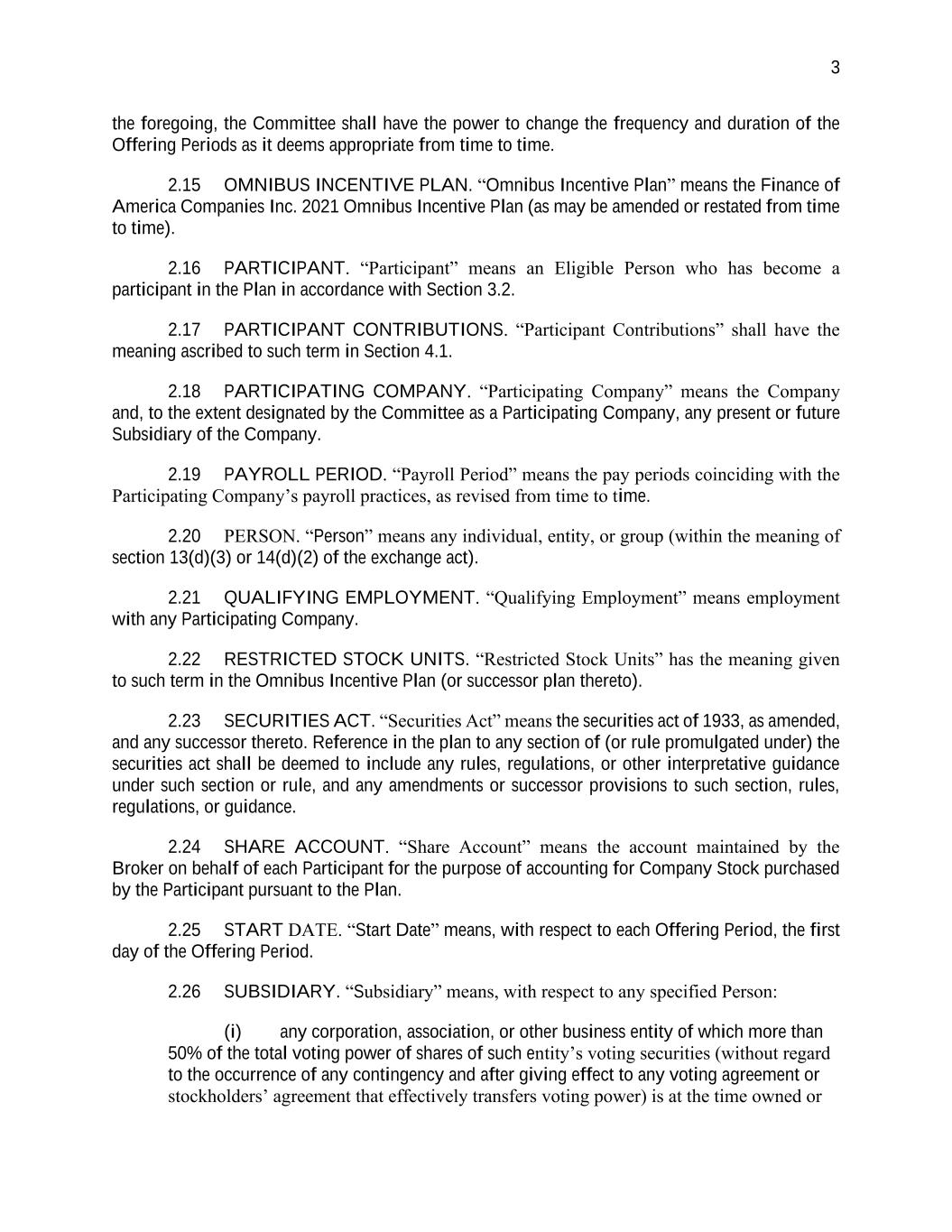 3 the foregoing, the Committee shall have the power to change the frequency and duration of the Offering Periods as it deems appropriate from time to time. 2.15 OMNIBUS INCENTIVE PLAN. “Omnibus Incentive Plan” means the Finance of America Companies Inc. 2021 Omnibus Incentive Plan (as may be amended or restated from time to time). 2.16 PARTICIPANT. “Participant” means an Eligible Person who has become a participant in the Plan in accordance with Section 3.2. 2.17 PARTICIPANT CONTRIBUTIONS. “Participant Contributions” shall have the meaning ascribed to such term in Section 4.1. 2.18 PARTICIPATING COMPANY. “Participating Company” means the Company and, to the extent designated by the Committee as a Participating Company, any present or future Subsidiary of the Company. 2.19 PAYROLL PERIOD. “Payroll Period” means the pay periods coinciding with the Participating Company’s payroll practices, as revised from time to time. 2.20 PERSON. “Person” means any individual, entity, or group (within the meaning of section 13(d)(3) or 14(d)(2) of the exchange act). 2.21 QUALIFYING EMPLOYMENT. “Qualifying Employment” means employment with any Participating Company. 2.22 RESTRICTED STOCK UNITS. “Restricted Stock Units” has the meaning given to such term in the Omnibus Incentive Plan (or successor plan thereto). 2.23 SECURITIES ACT. “Securities Act” means the securities act of 1933, as amended, and any successor thereto. Reference in the plan to any section of (or rule promulgated under) the securities act shall be deemed to include any rules, regulations, or other interpretative guidance under such section or rule, and any amendments or successor provisions to such section, rules, regulations, or guidance. 2.24 SHARE ACCOUNT. “Share Account” means the account maintained by the Broker on behalf of each Participant for the purpose of accounting for Company Stock purchased by the Participant pursuant to the Plan. 2.25 START DATE. “Start Date” means, with respect to each Offering Period, the first day of the Offering Period. 2.26 SUBSIDIARY. “Subsidiary” means, with respect to any specified Person: (i) any corporation, association, or other business entity of which more than 50% of the total voting power of shares of such entity’s voting securities (without regard to the occurrence of any contingency and after giving effect to any voting agreement or stockholders’ agreement that effectively transfers voting power) is at the time owned or