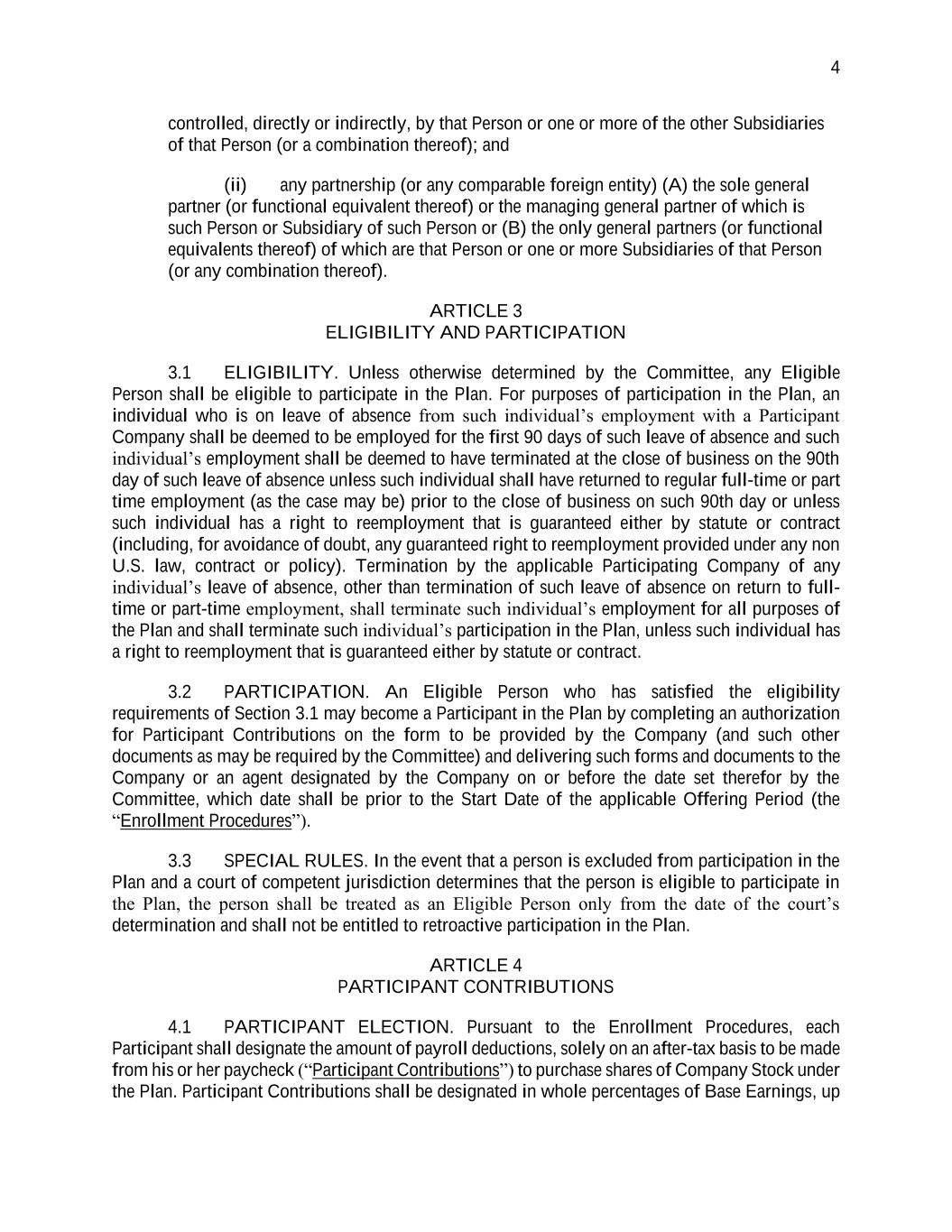 4 controlled, directly or indirectly, by that Person or one or more of the other Subsidiaries of that Person (or a combination thereof); and (ii) any partnership (or any comparable foreign entity) (A) the sole general partner (or functional equivalent thereof) or the managing general partner of which is such Person or Subsidiary of such Person or (B) the only general partners (or functional equivalents thereof) of which are that Person or one or more Subsidiaries of that Person (or any combination thereof). ARTICLE 3 ELIGIBILITY AND PARTICIPATION 3.1 ELIGIBILITY. Unless otherwise determined by the Committee, any Eligible Person shall be eligible to participate in the Plan. For purposes of participation in the Plan, an individual who is on leave of absence from such individual’s employment with a Participant Company shall be deemed to be employed for the first 90 days of such leave of absence and such individual’s employment shall be deemed to have terminated at the close of business on the 90th day of such leave of absence unless such individual shall have returned to regular full-time or part time employment (as the case may be) prior to the close of business on such 90th day or unless such individual has a right to reemployment that is guaranteed either by statute or contract (including, for avoidance of doubt, any guaranteed right to reemployment provided under any non U.S. law, contract or policy). Termination by the applicable Participating Company of any individual’s leave of absence, other than termination of such leave of absence on return to full- time or part-time employment, shall terminate such individual’s employment for all purposes of the Plan and shall terminate such individual’s participation in the Plan, unless such individual has a right to reemployment that is guaranteed either by statute or contract. 3.2 PARTICIPATION. An Eligible Person who has satisfied the eligibility requirements of Section 3.1 may become a Participant in the Plan by completing an authorization for Participant Contributions on the form to be provided by the Company (and such other documents as may be required by the Committee) and delivering such forms and documents to the Company or an agent designated by the Company on or before the date set therefor by the Committee, which date shall be prior to the Start Date of the applicable Offering Period (the “Enrollment Procedures”). 3.3 SPECIAL RULES. In the event that a person is excluded from participation in the Plan and a court of competent jurisdiction determines that the person is eligible to participate in the Plan, the person shall be treated as an Eligible Person only from the date of the court’s determination and shall not be entitled to retroactive participation in the Plan. ARTICLE 4 PARTICIPANT CONTRIBUTIONS 4.1 PARTICIPANT ELECTION. Pursuant to the Enrollment Procedures, each Participant shall designate the amount of payroll deductions, solely on an after-tax basis to be made from his or her paycheck (“Participant Contributions”) to purchase shares of Company Stock under the Plan. Participant Contributions shall be designated in whole percentages of Base Earnings, up