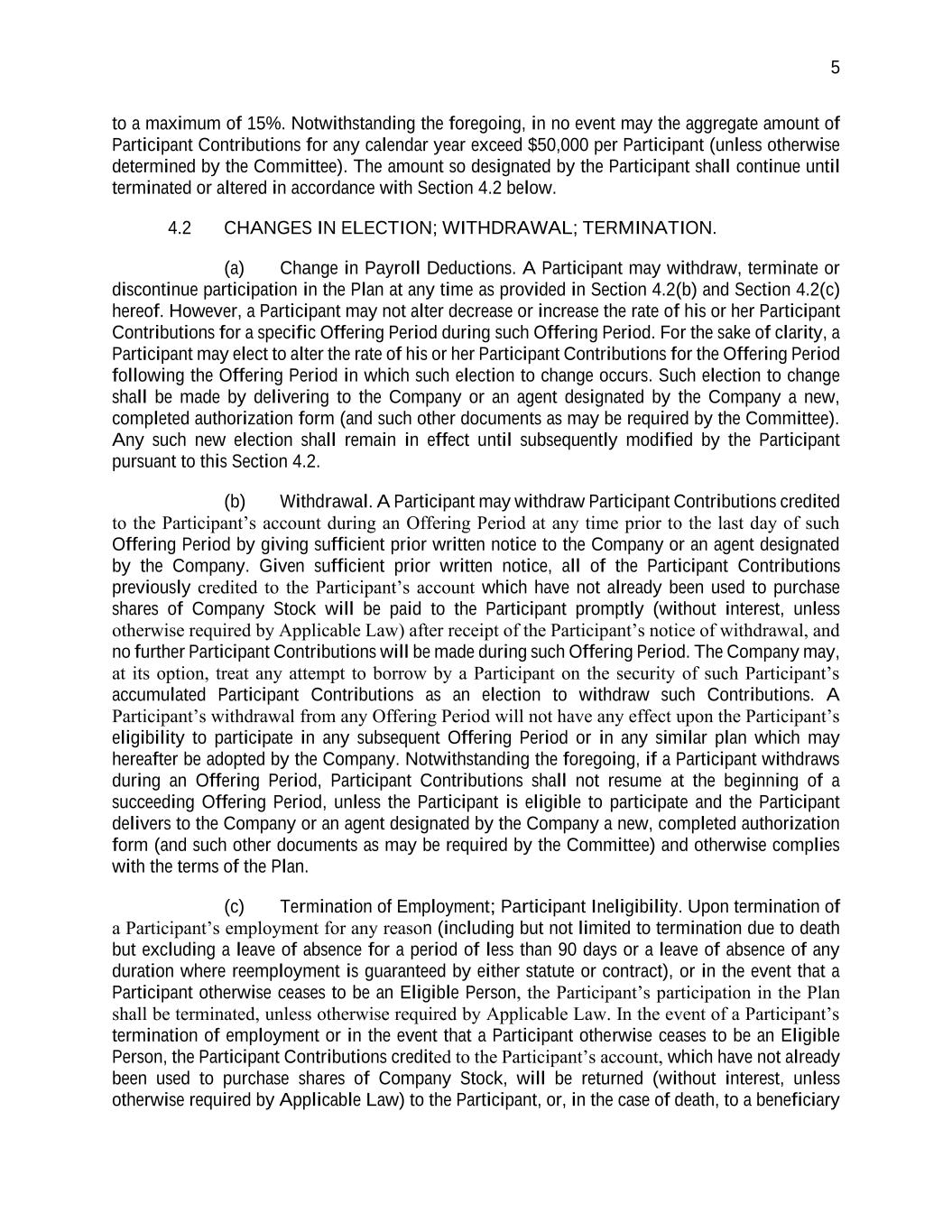 5 to a maximum of 15%. Notwithstanding the foregoing, in no event may the aggregate amount of Participant Contributions for any calendar year exceed $50,000 per Participant (unless otherwise determined by the Committee). The amount so designated by the Participant shall continue until terminated or altered in accordance with Section 4.2 below. 4.2 CHANGES IN ELECTION; WITHDRAWAL; TERMINATION. (a) Change in Payroll Deductions. A Participant may withdraw, terminate or discontinue participation in the Plan at any time as provided in Section 4.2(b) and Section 4.2(c) hereof. However, a Participant may not alter decrease or increase the rate of his or her Participant Contributions for a specific Offering Period during such Offering Period. For the sake of clarity, a Participant may elect to alter the rate of his or her Participant Contributions for the Offering Period following the Offering Period in which such election to change occurs. Such election to change shall be made by delivering to the Company or an agent designated by the Company a new, completed authorization form (and such other documents as may be required by the Committee). Any such new election shall remain in effect until subsequently modified by the Participant pursuant to this Section 4.2. (b) Withdrawal. A Participant may withdraw Participant Contributions credited to the Participant’s account during an Offering Period at any time prior to the last day of such Offering Period by giving sufficient prior written notice to the Company or an agent designated by the Company. Given sufficient prior written notice, all of the Participant Contributions previously credited to the Participant’s account which have not already been used to purchase shares of Company Stock will be paid to the Participant promptly (without interest, unless otherwise required by Applicable Law) after receipt of the Participant’s notice of withdrawal, and no further Participant Contributions will be made during such Offering Period. The Company may, at its option, treat any attempt to borrow by a Participant on the security of such Participant’s accumulated Participant Contributions as an election to withdraw such Contributions. A Participant’s withdrawal from any Offering Period will not have any effect upon the Participant’s eligibility to participate in any subsequent Offering Period or in any similar plan which may hereafter be adopted by the Company. Notwithstanding the foregoing, if a Participant withdraws during an Offering Period, Participant Contributions shall not resume at the beginning of a succeeding Offering Period, unless the Participant is eligible to participate and the Participant delivers to the Company or an agent designated by the Company a new, completed authorization form (and such other documents as may be required by the Committee) and otherwise complies with the terms of the Plan. (c) Termination of Employment; Participant Ineligibility. Upon termination of a Participant’s employment for any reason (including but not limited to termination due to death but excluding a leave of absence for a period of less than 90 days or a leave of absence of any duration where reemployment is guaranteed by either statute or contract), or in the event that a Participant otherwise ceases to be an Eligible Person, the Participant’s participation in the Plan shall be terminated, unless otherwise required by Applicable Law. In the event of a Participant’s termination of employment or in the event that a Participant otherwise ceases to be an Eligible Person, the Participant Contributions credited to the Participant’s account, which have not already been used to purchase shares of Company Stock, will be returned (without interest, unless otherwise required by Applicable Law) to the Participant, or, in the case of death, to a beneficiary