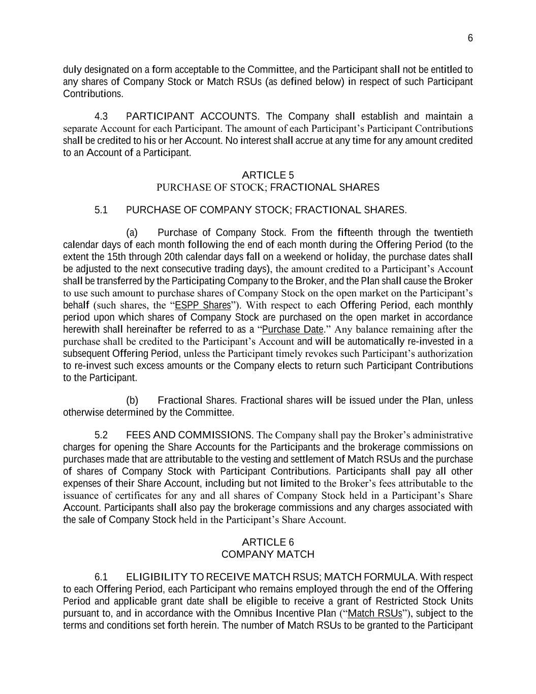 6 duly designated on a form acceptable to the Committee, and the Participant shall not be entitled to any shares of Company Stock or Match RSUs (as defined below) in respect of such Participant Contributions. 4.3 PARTICIPANT ACCOUNTS. The Company shall establish and maintain a separate Account for each Participant. The amount of each Participant’s Participant Contributions shall be credited to his or her Account. No interest shall accrue at any time for any amount credited to an Account of a Participant. ARTICLE 5 PURCHASE OF STOCK; FRACTIONAL SHARES 5.1 PURCHASE OF COMPANY STOCK; FRACTIONAL SHARES. (a) Purchase of Company Stock. From the fifteenth through the twentieth calendar days of each month following the end of each month during the Offering Period (to the extent the 15th through 20th calendar days fall on a weekend or holiday, the purchase dates shall be adjusted to the next consecutive trading days), the amount credited to a Participant’s Account shall be transferred by the Participating Company to the Broker, and the Plan shall cause the Broker to use such amount to purchase shares of Company Stock on the open market on the Participant’s behalf (such shares, the “ESPP Shares”). With respect to each Offering Period, each monthly period upon which shares of Company Stock are purchased on the open market in accordance herewith shall hereinafter be referred to as a “Purchase Date.” Any balance remaining after the purchase shall be credited to the Participant’s Account and will be automatically re-invested in a subsequent Offering Period, unless the Participant timely revokes such Participant’s authorization to re-invest such excess amounts or the Company elects to return such Participant Contributions to the Participant. (b) Fractional Shares. Fractional shares will be issued under the Plan, unless otherwise determined by the Committee. 5.2 FEES AND COMMISSIONS. The Company shall pay the Broker’s administrative charges for opening the Share Accounts for the Participants and the brokerage commissions on purchases made that are attributable to the vesting and settlement of Match RSUs and the purchase of shares of Company Stock with Participant Contributions. Participants shall pay all other expenses of their Share Account, including but not limited to the Broker’s fees attributable to the issuance of certificates for any and all shares of Company Stock held in a Participant’s Share Account. Participants shall also pay the brokerage commissions and any charges associated with the sale of Company Stock held in the Participant’s Share Account. ARTICLE 6 COMPANY MATCH 6.1 ELIGIBILITY TO RECEIVE MATCH RSUS; MATCH FORMULA. With respect to each Offering Period, each Participant who remains employed through the end of the Offering Period and applicable grant date shall be eligible to receive a grant of Restricted Stock Units pursuant to, and in accordance with the Omnibus Incentive Plan (“Match RSUs”), subject to the terms and conditions set forth herein. The number of Match RSUs to be granted to the Participant