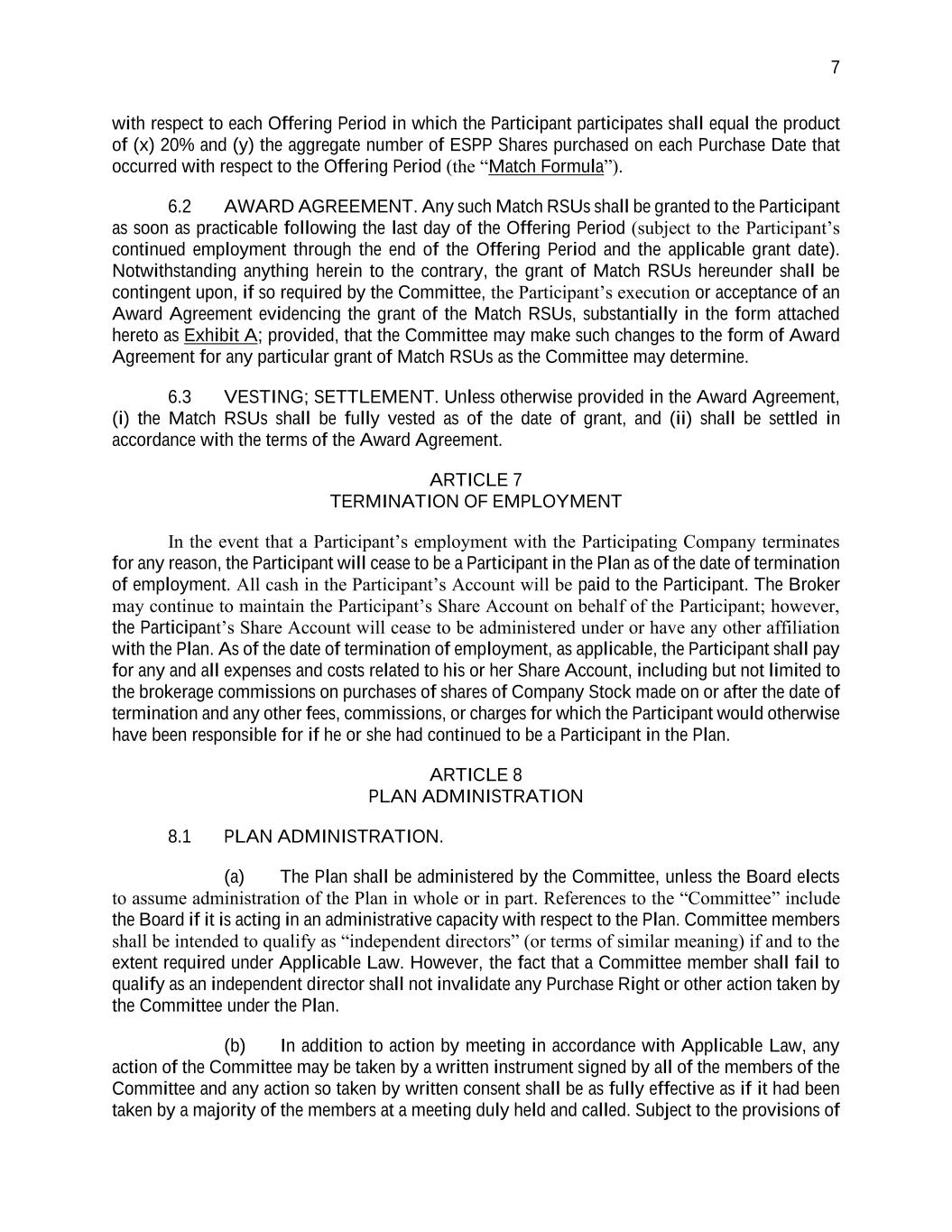 7 with respect to each Offering Period in which the Participant participates shall equal the product of (x) 20% and (y) the aggregate number of ESPP Shares purchased on each Purchase Date that occurred with respect to the Offering Period (the “Match Formula”). 6.2 AWARD AGREEMENT. Any such Match RSUs shall be granted to the Participant as soon as practicable following the last day of the Offering Period (subject to the Participant’s continued employment through the end of the Offering Period and the applicable grant date). Notwithstanding anything herein to the contrary, the grant of Match RSUs hereunder shall be contingent upon, if so required by the Committee, the Participant’s execution or acceptance of an Award Agreement evidencing the grant of the Match RSUs, substantially in the form attached hereto as Exhibit A; provided, that the Committee may make such changes to the form of Award Agreement for any particular grant of Match RSUs as the Committee may determine. 6.3 VESTING; SETTLEMENT. Unless otherwise provided in the Award Agreement, (i) the Match RSUs shall be fully vested as of the date of grant, and (ii) shall be settled in accordance with the terms of the Award Agreement. ARTICLE 7 TERMINATION OF EMPLOYMENT In the event that a Participant’s employment with the Participating Company terminates for any reason, the Participant will cease to be a Participant in the Plan as of the date of termination of employment. All cash in the Participant’s Account will be paid to the Participant. The Broker may continue to maintain the Participant’s Share Account on behalf of the Participant; however, the Participant’s Share Account will cease to be administered under or have any other affiliation with the Plan. As of the date of termination of employment, as applicable, the Participant shall pay for any and all expenses and costs related to his or her Share Account, including but not limited to the brokerage commissions on purchases of shares of Company Stock made on or after the date of termination and any other fees, commissions, or charges for which the Participant would otherwise have been responsible for if he or she had continued to be a Participant in the Plan. ARTICLE 8 PLAN ADMINISTRATION 8.1 PLAN ADMINISTRATION. (a) The Plan shall be administered by the Committee, unless the Board elects to assume administration of the Plan in whole or in part. References to the “Committee” include the Board if it is acting in an administrative capacity with respect to the Plan. Committee members shall be intended to qualify as “independent directors” (or terms of similar meaning) if and to the extent required under Applicable Law. However, the fact that a Committee member shall fail to qualify as an independent director shall not invalidate any Purchase Right or other action taken by the Committee under the Plan. (b) In addition to action by meeting in accordance with Applicable Law, any action of the Committee may be taken by a written instrument signed by all of the members of the Committee and any action so taken by written consent shall be as fully effective as if it had been taken by a majority of the members at a meeting duly held and called. Subject to the provisions of