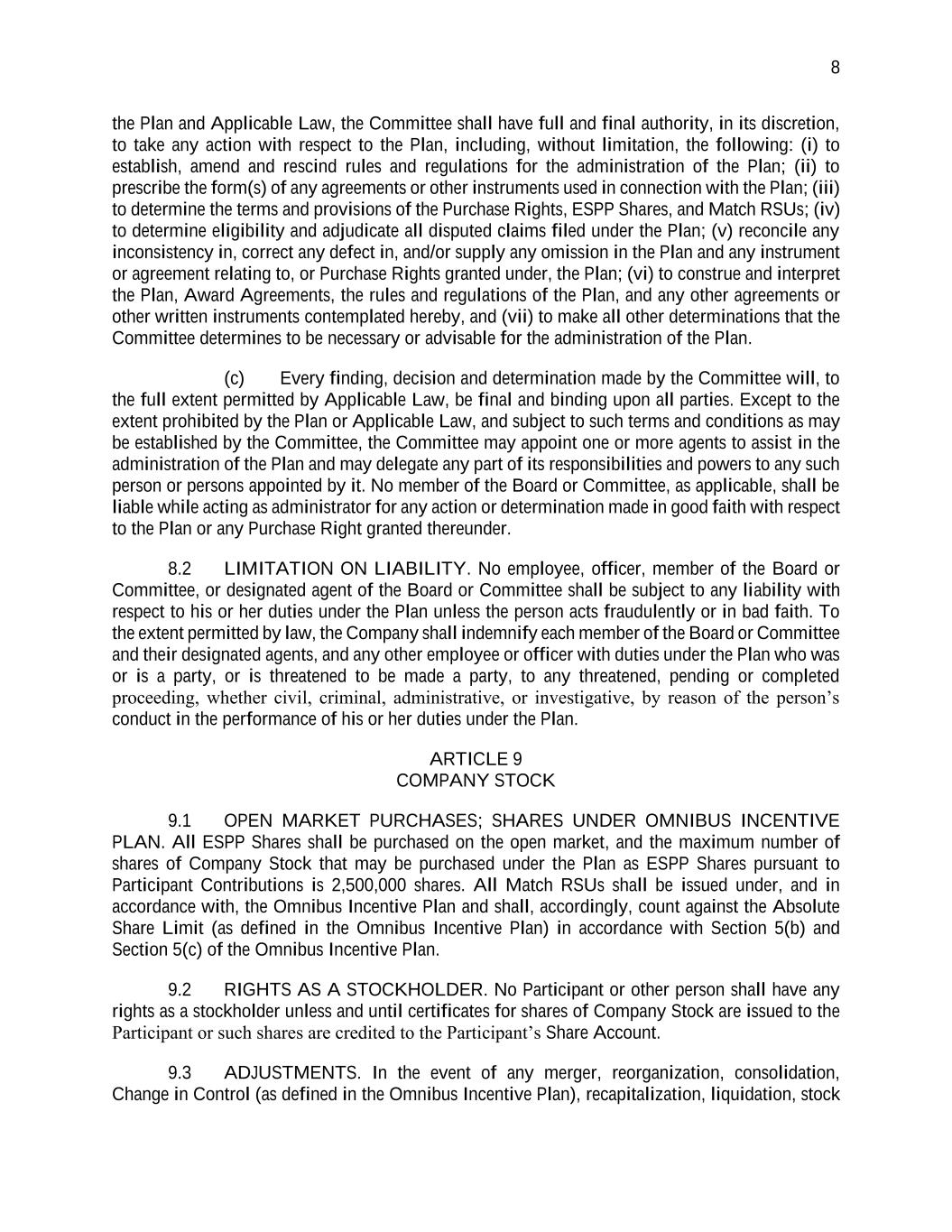 8 the Plan and Applicable Law, the Committee shall have full and final authority, in its discretion, to take any action with respect to the Plan, including, without limitation, the following: (i) to establish, amend and rescind rules and regulations for the administration of the Plan; (ii) to prescribe the form(s) of any agreements or other instruments used in connection with the Plan; (iii) to determine the terms and provisions of the Purchase Rights, ESPP Shares, and Match RSUs; (iv) to determine eligibility and adjudicate all disputed claims filed under the Plan; (v) reconcile any inconsistency in, correct any defect in, and/or supply any omission in the Plan and any instrument or agreement relating to, or Purchase Rights granted under, the Plan; (vi) to construe and interpret the Plan, Award Agreements, the rules and regulations of the Plan, and any other agreements or other written instruments contemplated hereby, and (vii) to make all other determinations that the Committee determines to be necessary or advisable for the administration of the Plan. (c) Every finding, decision and determination made by the Committee will, to the full extent permitted by Applicable Law, be final and binding upon all parties. Except to the extent prohibited by the Plan or Applicable Law, and subject to such terms and conditions as may be established by the Committee, the Committee may appoint one or more agents to assist in the administration of the Plan and may delegate any part of its responsibilities and powers to any such person or persons appointed by it. No member of the Board or Committee, as applicable, shall be liable while acting as administrator for any action or determination made in good faith with respect to the Plan or any Purchase Right granted thereunder. 8.2 LIMITATION ON LIABILITY. No employee, officer, member of the Board or Committee, or designated agent of the Board or Committee shall be subject to any liability with respect to his or her duties under the Plan unless the person acts fraudulently or in bad faith. To the extent permitted by law, the Company shall indemnify each member of the Board or Committee and their designated agents, and any other employee or officer with duties under the Plan who was or is a party, or is threatened to be made a party, to any threatened, pending or completed proceeding, whether civil, criminal, administrative, or investigative, by reason of the person’s conduct in the performance of his or her duties under the Plan. ARTICLE 9 COMPANY STOCK 9.1 OPEN MARKET PURCHASES; SHARES UNDER OMNIBUS INCENTIVE PLAN. All ESPP Shares shall be purchased on the open market, and the maximum number of shares of Company Stock that may be purchased under the Plan as ESPP Shares pursuant to Participant Contributions is 2,500,000 shares. All Match RSUs shall be issued under, and in accordance with, the Omnibus Incentive Plan and shall, accordingly, count against the Absolute Share Limit (as defined in the Omnibus Incentive Plan) in accordance with Section 5(b) and Section 5(c) of the Omnibus Incentive Plan. 9.2 RIGHTS AS A STOCKHOLDER. No Participant or other person shall have any rights as a stockholder unless and until certificates for shares of Company Stock are issued to the Participant or such shares are credited to the Participant’s Share Account. 9.3 ADJUSTMENTS. In the event of any merger, reorganization, consolidation, Change in Control (as defined in the Omnibus Incentive Plan), recapitalization, liquidation, stock