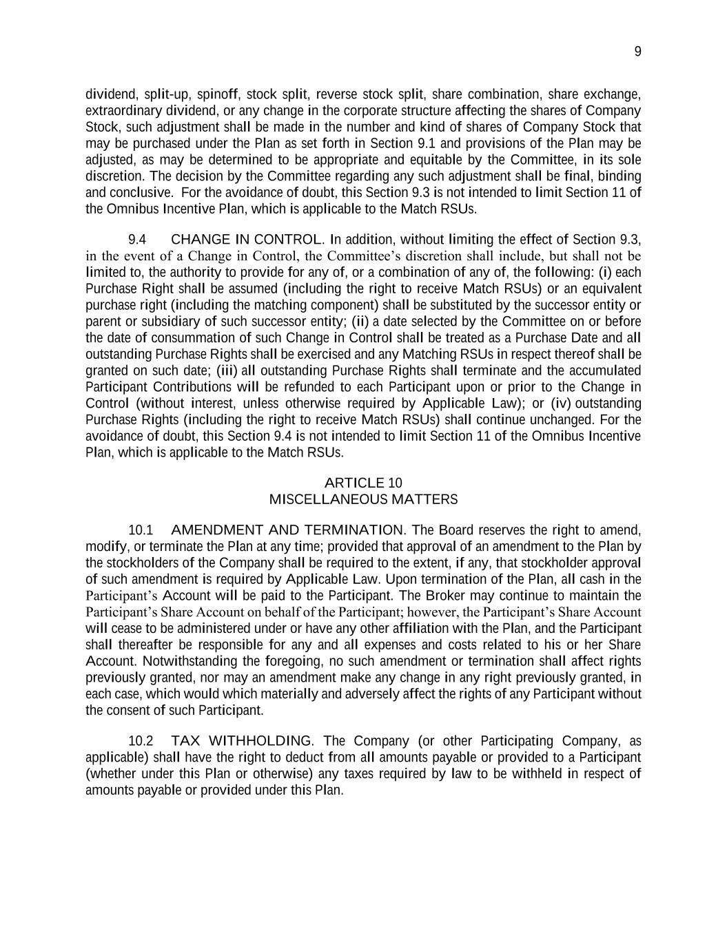 9 dividend, split-up, spinoff, stock split, reverse stock split, share combination, share exchange, extraordinary dividend, or any change in the corporate structure affecting the shares of Company Stock, such adjustment shall be made in the number and kind of shares of Company Stock that may be purchased under the Plan as set forth in Section 9.1 and provisions of the Plan may be adjusted, as may be determined to be appropriate and equitable by the Committee, in its sole discretion. The decision by the Committee regarding any such adjustment shall be final, binding and conclusive. For the avoidance of doubt, this Section 9.3 is not intended to limit Section 11 of the Omnibus Incentive Plan, which is applicable to the Match RSUs. 9.4 CHANGE IN CONTROL. In addition, without limiting the effect of Section 9.3, in the event of a Change in Control, the Committee’s discretion shall include, but shall not be limited to, the authority to provide for any of, or a combination of any of, the following: (i) each Purchase Right shall be assumed (including the right to receive Match RSUs) or an equivalent purchase right (including the matching component) shall be substituted by the successor entity or parent or subsidiary of such successor entity; (ii) a date selected by the Committee on or before the date of consummation of such Change in Control shall be treated as a Purchase Date and all outstanding Purchase Rights shall be exercised and any Matching RSUs in respect thereof shall be granted on such date; (iii) all outstanding Purchase Rights shall terminate and the accumulated Participant Contributions will be refunded to each Participant upon or prior to the Change in Control (without interest, unless otherwise required by Applicable Law); or (iv) outstanding Purchase Rights (including the right to receive Match RSUs) shall continue unchanged. For the avoidance of doubt, this Section 9.4 is not intended to limit Section 11 of the Omnibus Incentive Plan, which is applicable to the Match RSUs. ARTICLE 10 MISCELLANEOUS MATTERS 10.1 AMENDMENT AND TERMINATION. The Board reserves the right to amend, modify, or terminate the Plan at any time; provided that approval of an amendment to the Plan by the stockholders of the Company shall be required to the extent, if any, that stockholder approval of such amendment is required by Applicable Law. Upon termination of the Plan, all cash in the Participant’s Account will be paid to the Participant. The Broker may continue to maintain the Participant’s Share Account on behalf of the Participant; however, the Participant’s Share Account will cease to be administered under or have any other affiliation with the Plan, and the Participant shall thereafter be responsible for any and all expenses and costs related to his or her Share Account. Notwithstanding the foregoing, no such amendment or termination shall affect rights previously granted, nor may an amendment make any change in any right previously granted, in each case, which would which materially and adversely affect the rights of any Participant without the consent of such Participant. 10.2 TAX WITHHOLDING. The Company (or other Participating Company, as applicable) shall have the right to deduct from all amounts payable or provided to a Participant (whether under this Plan or otherwise) any taxes required by law to be withheld in respect of amounts payable or provided under this Plan.