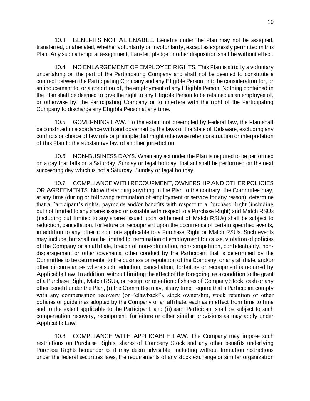 10 10.3 BENEFITS NOT ALIENABLE. Benefits under the Plan may not be assigned, transferred, or alienated, whether voluntarily or involuntarily, except as expressly permitted in this Plan. Any such attempt at assignment, transfer, pledge or other disposition shall be without effect. 10.4 NO ENLARGEMENT OF EMPLOYEE RIGHTS. This Plan is strictly a voluntary undertaking on the part of the Participating Company and shall not be deemed to constitute a contract between the Participating Company and any Eligible Person or to be consideration for, or an inducement to, or a condition of, the employment of any Eligible Person. Nothing contained in the Plan shall be deemed to give the right to any Eligible Person to be retained as an employee of, or otherwise by, the Participating Company or to interfere with the right of the Participating Company to discharge any Eligible Person at any time. 10.5 GOVERNING LAW. To the extent not preempted by Federal law, the Plan shall be construed in accordance with and governed by the laws of the State of Delaware, excluding any conflicts or choice of law rule or principle that might otherwise refer construction or interpretation of this Plan to the substantive law of another jurisdiction. 10.6 NON-BUSINESS DAYS. When any act under the Plan is required to be performed on a day that falls on a Saturday, Sunday or legal holiday, that act shall be performed on the next succeeding day which is not a Saturday, Sunday or legal holiday. 10.7 COMPLIANCE WITH RECOUPMENT, OWNERSHIP AND OTHER POLICIES OR AGREEMENTS. Notwithstanding anything in the Plan to the contrary, the Committee may, at any time (during or following termination of employment or service for any reason), determine that a Participant’s rights, payments and/or benefits with respect to a Purchase Right (including but not limited to any shares issued or issuable with respect to a Purchase Right) and Match RSUs (including but limited to any shares issued upon settlement of Match RSUs) shall be subject to reduction, cancellation, forfeiture or recoupment upon the occurrence of certain specified events, in addition to any other conditions applicable to a Purchase Right or Match RSUs. Such events may include, but shall not be limited to, termination of employment for cause, violation of policies of the Company or an affiliate, breach of non-solicitation, non-competition, confidentiality, non- disparagement or other covenants, other conduct by the Participant that is determined by the Committee to be detrimental to the business or reputation of the Company, or any affiliate, and/or other circumstances where such reduction, cancellation, forfeiture or recoupment is required by Applicable Law. In addition, without limiting the effect of the foregoing, as a condition to the grant of a Purchase Right, Match RSUs, or receipt or retention of shares of Company Stock, cash or any other benefit under the Plan, (i) the Committee may, at any time, require that a Participant comply with any compensation recovery (or “clawback”), stock ownership, stock retention or other policies or guidelines adopted by the Company or an affiliate, each as in effect from time to time and to the extent applicable to the Participant, and (ii) each Participant shall be subject to such compensation recovery, recoupment, forfeiture or other similar provisions as may apply under Applicable Law. 10.8 COMPLIANCE WITH APPLICABLE LAW. The Company may impose such restrictions on Purchase Rights, shares of Company Stock and any other benefits underlying Purchase Rights hereunder as it may deem advisable, including without limitation restrictions under the federal securities laws, the requirements of any stock exchange or similar organization