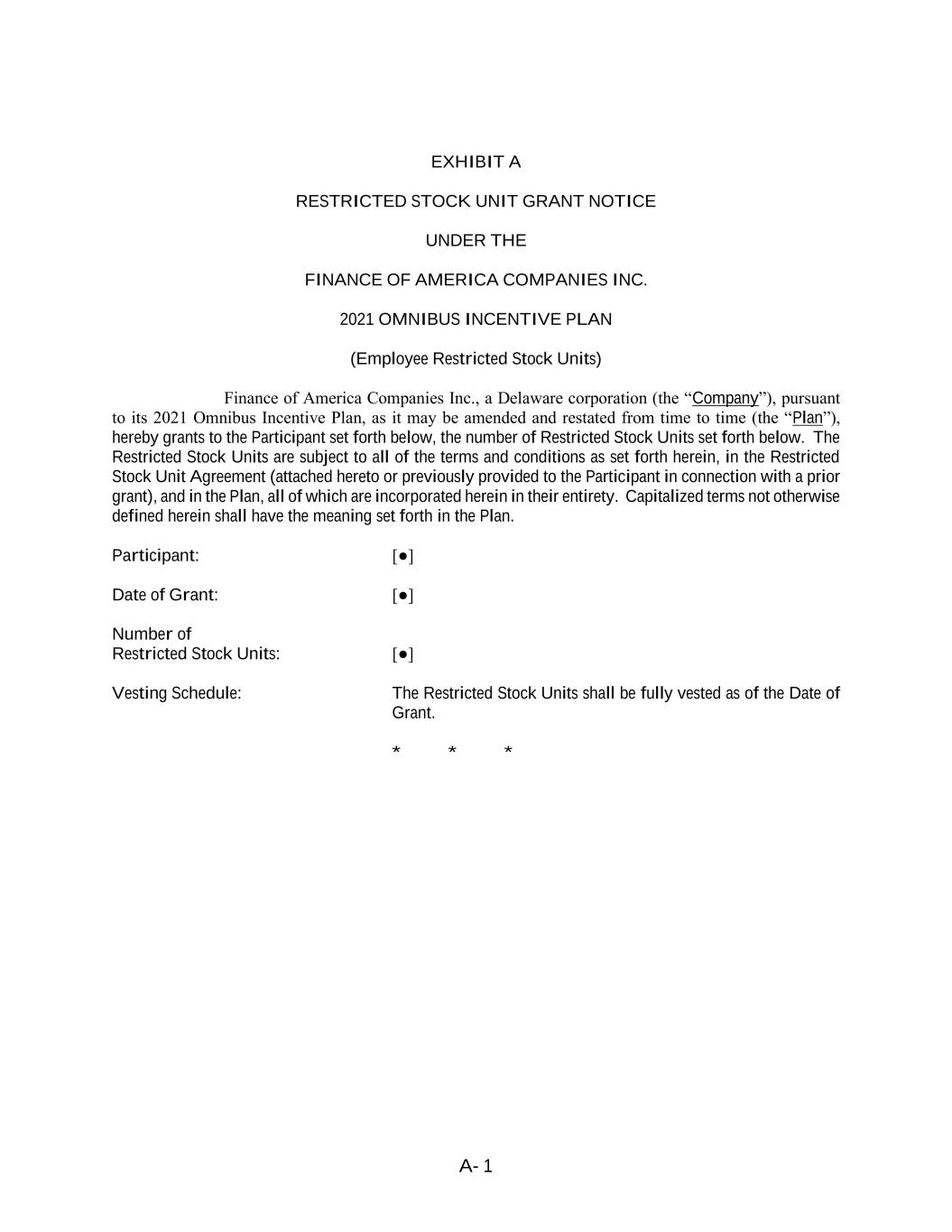 A- 1 EXHIBIT A RESTRICTED STOCK UNIT GRANT NOTICE UNDER THE FINANCE OF AMERICA COMPANIES INC. 2021 OMNIBUS INCENTIVE PLAN (Employee Restricted Stock Units) Finance of America Companies Inc., a Delaware corporation (the “Company”), pursuant to its 2021 Omnibus Incentive Plan, as it may be amended and restated from time to time (the “Plan”), hereby grants to the Participant set forth below, the number of Restricted Stock Units set forth below. The Restricted Stock Units are subject to all of the terms and conditions as set forth herein, in the Restricted Stock Unit Agreement (attached hereto or previously provided to the Participant in connection with a prior grant), and in the Plan, all of which are incorporated herein in their entirety. Capitalized terms not otherwise defined herein shall have the meaning set forth in the Plan. Participant: [●] Date of Grant: [●] Number of Restricted Stock Units: [●] Vesting Schedule: The Restricted Stock Units shall be fully vested as of the Date of Grant. * * *
