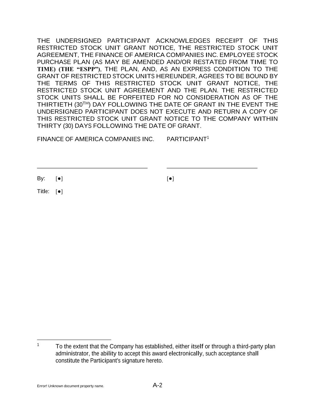 Error! Unknown document property name. A-2 THE UNDERSIGNED PARTICIPANT ACKNOWLEDGES RECEIPT OF THIS RESTRICTED STOCK UNIT GRANT NOTICE, THE RESTRICTED STOCK UNIT AGREEMENT, THE FINANCE OF AMERICA COMPANIES INC. EMPLOYEE STOCK PURCHASE PLAN (AS MAY BE AMENDED AND/OR RESTATED FROM TIME TO TIME) (THE “ESPP”), THE PLAN, AND, AS AN EXPRESS CONDITION TO THE GRANT OF RESTRICTED STOCK UNITS HEREUNDER, AGREES TO BE BOUND BY THE TERMS OF THIS RESTRICTED STOCK UNIT GRANT NOTICE, THE RESTRICTED STOCK UNIT AGREEMENT AND THE PLAN. THE RESTRICTED STOCK UNITS SHALL BE FORFEITED FOR NO CONSIDERATION AS OF THE THIRTIETH (30TH) DAY FOLLOWING THE DATE OF GRANT IN THE EVENT THE UNDERSIGNED PARTICIPANT DOES NOT EXECUTE AND RETURN A COPY OF THIS RESTRICTED STOCK UNIT GRANT NOTICE TO THE COMPANY WITHIN THIRTY (30) DAYS FOLLOWING THE DATE OF GRANT. FINANCE OF AMERICA COMPANIES INC. PARTICIPANT1 _______________________________________ ________________________________ By: [●] [●] Title: [●] 1 To the extent that the Company has established, either itself or through a third-party plan administrator, the ability to accept this award electronically, such acceptance shall constitute the Participant's signature hereto.