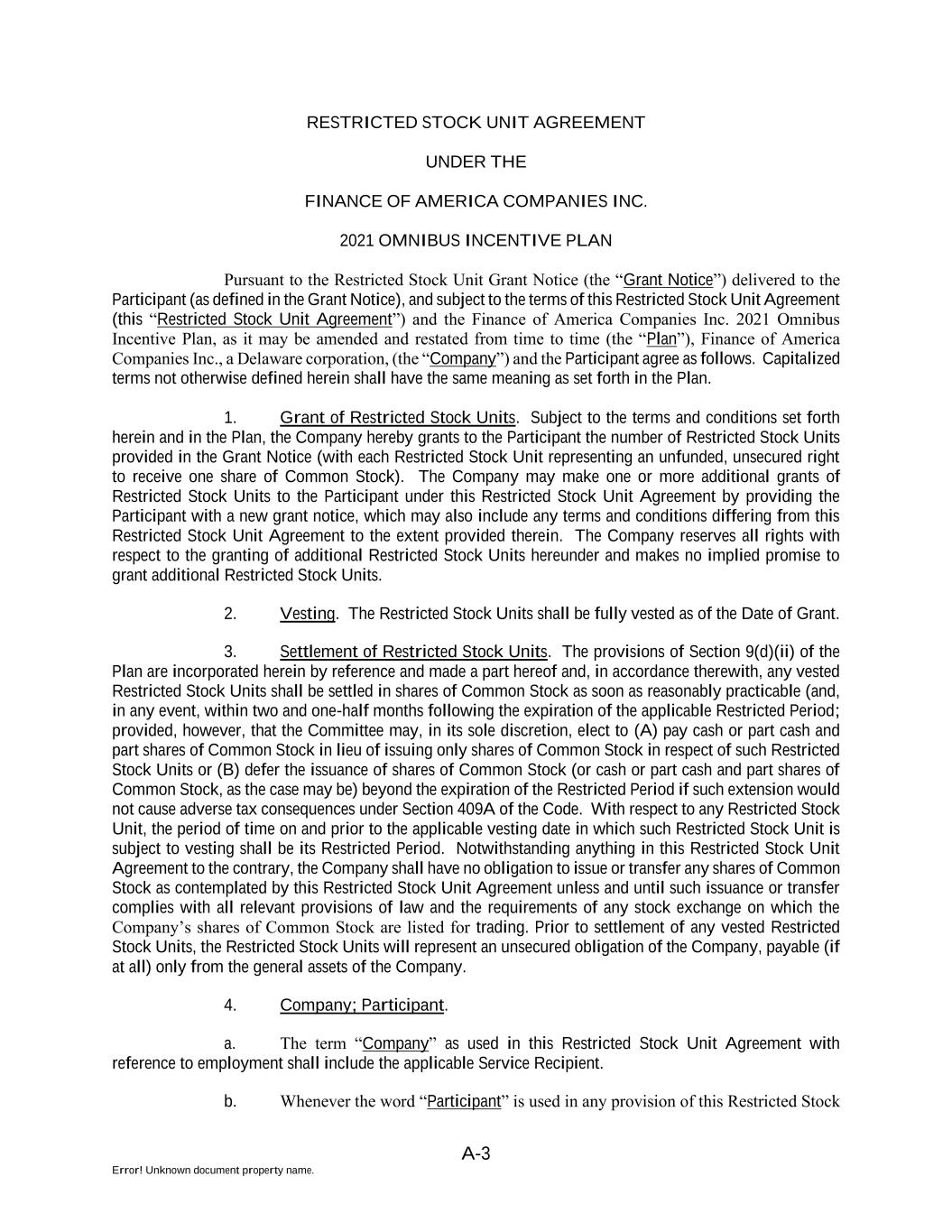 A-3 Error! Unknown document property name. RESTRICTED STOCK UNIT AGREEMENT UNDER THE FINANCE OF AMERICA COMPANIES INC. 2021 OMNIBUS INCENTIVE PLAN Pursuant to the Restricted Stock Unit Grant Notice (the “Grant Notice”) delivered to the Participant (as defined in the Grant Notice), and subject to the terms of this Restricted Stock Unit Agreement (this “Restricted Stock Unit Agreement”) and the Finance of America Companies Inc. 2021 Omnibus Incentive Plan, as it may be amended and restated from time to time (the “Plan”), Finance of America Companies Inc., a Delaware corporation, (the “Company”) and the Participant agree as follows. Capitalized terms not otherwise defined herein shall have the same meaning as set forth in the Plan. 1. Grant of Restricted Stock Units. Subject to the terms and conditions set forth herein and in the Plan, the Company hereby grants to the Participant the number of Restricted Stock Units provided in the Grant Notice (with each Restricted Stock Unit representing an unfunded, unsecured right to receive one share of Common Stock). The Company may make one or more additional grants of Restricted Stock Units to the Participant under this Restricted Stock Unit Agreement by providing the Participant with a new grant notice, which may also include any terms and conditions differing from this Restricted Stock Unit Agreement to the extent provided therein. The Company reserves all rights with respect to the granting of additional Restricted Stock Units hereunder and makes no implied promise to grant additional Restricted Stock Units. 2. Vesting. The Restricted Stock Units shall be fully vested as of the Date of Grant. 3. Settlement of Restricted Stock Units. The provisions of Section 9(d)(ii) of the Plan are incorporated herein by reference and made a part hereof and, in accordance therewith, any vested Restricted Stock Units shall be settled in shares of Common Stock as soon as reasonably practicable (and, in any event, within two and one-half months following the expiration of the applicable Restricted Period; provided, however, that the Committee may, in its sole discretion, elect to (A) pay cash or part cash and part shares of Common Stock in lieu of issuing only shares of Common Stock in respect of such Restricted Stock Units or (B) defer the issuance of shares of Common Stock (or cash or part cash and part shares of Common Stock, as the case may be) beyond the expiration of the Restricted Period if such extension would not cause adverse tax consequences under Section 409A of the Code. With respect to any Restricted Stock Unit, the period of time on and prior to the applicable vesting date in which such Restricted Stock Unit is subject to vesting shall be its Restricted Period. Notwithstanding anything in this Restricted Stock Unit Agreement to the contrary, the Company shall have no obligation to issue or transfer any shares of Common Stock as contemplated by this Restricted Stock Unit Agreement unless and until such issuance or transfer complies with all relevant provisions of law and the requirements of any stock exchange on which the Company’s shares of Common Stock are listed for trading. Prior to settlement of any vested Restricted Stock Units, the Restricted Stock Units will represent an unsecured obligation of the Company, payable (if at all) only from the general assets of the Company. 4. Company; Participant. a. The term “Company” as used in this Restricted Stock Unit Agreement with reference to employment shall include the applicable Service Recipient. b. Whenever the word “Participant” is used in any provision of this Restricted Stock
