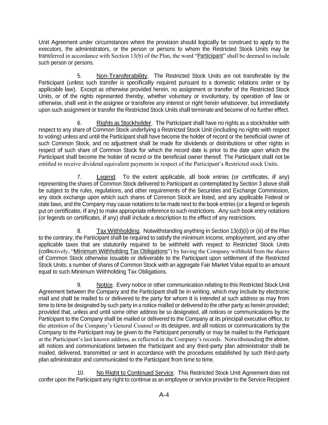 A-4 Unit Agreement under circumstances where the provision should logically be construed to apply to the executors, the administrators, or the person or persons to whom the Restricted Stock Units may be transferred in accordance with Section 13(b) of the Plan, the word “Participant” shall be deemed to include such person or persons. 5. Non-Transferability. The Restricted Stock Units are not transferable by the Participant (unless such transfer is specifically required pursuant to a domestic relations order or by applicable law). Except as otherwise provided herein, no assignment or transfer of the Restricted Stock Units, or of the rights represented thereby, whether voluntary or involuntary, by operation of law or otherwise, shall vest in the assignee or transferee any interest or right herein whatsoever, but immediately upon such assignment or transfer the Restricted Stock Units shall terminate and become of no further effect. 6. Rights as Stockholder. The Participant shall have no rights as a stockholder with respect to any share of Common Stock underlying a Restricted Stock Unit (including no rights with respect to voting) unless and until the Participant shall have become the holder of record or the beneficial owner of such Common Stock, and no adjustment shall be made for dividends or distributions or other rights in respect of such share of Common Stock for which the record date is prior to the date upon which the Participant shall become the holder of record or the beneficial owner thereof. The Participant shall not be entitled to receive dividend equivalent payments in respect of the Participant’s Restricted stock Units. 7. Legend. To the extent applicable, all book entries (or certificates, if any) representing the shares of Common Stock delivered to Participant as contemplated by Section 3 above shall be subject to the rules, regulations, and other requirements of the Securities and Exchange Commission, any stock exchange upon which such shares of Common Stock are listed, and any applicable Federal or state laws, and the Company may cause notations to be made next to the book entries (or a legend or legends put on certificates, if any) to make appropriate reference to such restrictions. Any such book entry notations (or legends on certificates, if any) shall include a description to the effect of any restrictions. 8. Tax Withholding. Notwithstanding anything in Section 13(d)(i) or (ii) of the Plan to the contrary, the Participant shall be required to satisfy the minimum income, employment, and any other applicable taxes that are statutorily required to be withheld with respect to Restricted Stock Units (collectively, “Minimum Withholding Tax Obligations”) by having the Company withhold from the shares of Common Stock otherwise issuable or deliverable to the Participant upon settlement of the Restricted Stock Units, a number of shares of Common Stock with an aggregate Fair Market Value equal to an amount equal to such Minimum Withholding Tax Obligations. 9. Notice. Every notice or other communication relating to this Restricted Stock Unit Agreement between the Company and the Participant shall be in writing, which may include by electronic mail and shall be mailed to or delivered to the party for whom it is intended at such address as may from time to time be designated by such party in a notice mailed or delivered to the other party as herein provided; provided that, unless and until some other address be so designated, all notices or communications by the Participant to the Company shall be mailed or delivered to the Company at its principal executive office, to the attention of the Company’s General Counsel or its designee, and all notices or communications by the Company to the Participant may be given to the Participant personally or may be mailed to the Participant at the Participant’s last known address, as reflected in the Company’s records. Notwithstanding the above, all notices and communications between the Participant and any third-party plan administrator shall be mailed, delivered, transmitted or sent in accordance with the procedures established by such third-party plan administrator and communicated to the Participant from time to time. 10. No Right to Continued Service. This Restricted Stock Unit Agreement does not confer upon the Participant any right to continue as an employee or service provider to the Service Recipient
