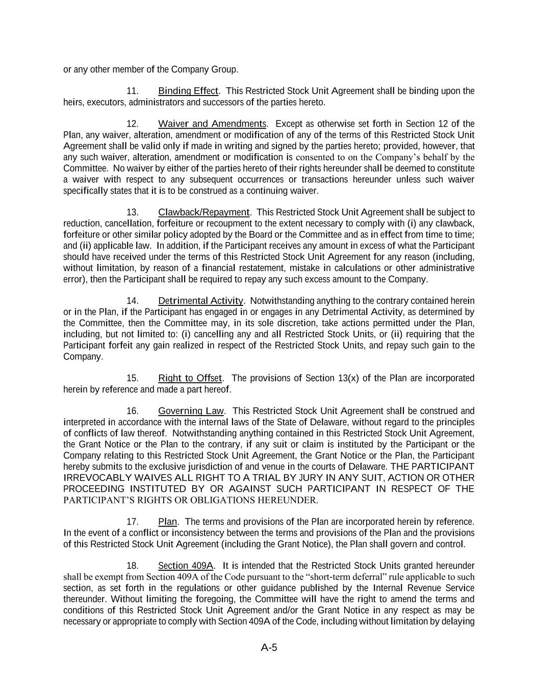A-5 or any other member of the Company Group. 11. Binding Effect. This Restricted Stock Unit Agreement shall be binding upon the heirs, executors, administrators and successors of the parties hereto. 12. Waiver and Amendments. Except as otherwise set forth in Section 12 of the Plan, any waiver, alteration, amendment or modification of any of the terms of this Restricted Stock Unit Agreement shall be valid only if made in writing and signed by the parties hereto; provided, however, that any such waiver, alteration, amendment or modification is consented to on the Company’s behalf by the Committee. No waiver by either of the parties hereto of their rights hereunder shall be deemed to constitute a waiver with respect to any subsequent occurrences or transactions hereunder unless such waiver specifically states that it is to be construed as a continuing waiver. 13. Clawback/Repayment. This Restricted Stock Unit Agreement shall be subject to reduction, cancellation, forfeiture or recoupment to the extent necessary to comply with (i) any clawback, forfeiture or other similar policy adopted by the Board or the Committee and as in effect from time to time; and (ii) applicable law. In addition, if the Participant receives any amount in excess of what the Participant should have received under the terms of this Restricted Stock Unit Agreement for any reason (including, without limitation, by reason of a financial restatement, mistake in calculations or other administrative error), then the Participant shall be required to repay any such excess amount to the Company. 14. Detrimental Activity. Notwithstanding anything to the contrary contained herein or in the Plan, if the Participant has engaged in or engages in any Detrimental Activity, as determined by the Committee, then the Committee may, in its sole discretion, take actions permitted under the Plan, including, but not limited to: (i) cancelling any and all Restricted Stock Units, or (ii) requiring that the Participant forfeit any gain realized in respect of the Restricted Stock Units, and repay such gain to the Company. 15. Right to Offset. The provisions of Section 13(x) of the Plan are incorporated herein by reference and made a part hereof. 16. Governing Law. This Restricted Stock Unit Agreement shall be construed and interpreted in accordance with the internal laws of the State of Delaware, without regard to the principles of conflicts of law thereof. Notwithstanding anything contained in this Restricted Stock Unit Agreement, the Grant Notice or the Plan to the contrary, if any suit or claim is instituted by the Participant or the Company relating to this Restricted Stock Unit Agreement, the Grant Notice or the Plan, the Participant hereby submits to the exclusive jurisdiction of and venue in the courts of Delaware. THE PARTICIPANT IRREVOCABLY WAIVES ALL RIGHT TO A TRIAL BY JURY IN ANY SUIT, ACTION OR OTHER PROCEEDING INSTITUTED BY OR AGAINST SUCH PARTICIPANT IN RESPECT OF THE PARTICIPANT’S RIGHTS OR OBLIGATIONS HEREUNDER. 17. Plan. The terms and provisions of the Plan are incorporated herein by reference. In the event of a conflict or inconsistency between the terms and provisions of the Plan and the provisions of this Restricted Stock Unit Agreement (including the Grant Notice), the Plan shall govern and control. 18. Section 409A. It is intended that the Restricted Stock Units granted hereunder shall be exempt from Section 409A of the Code pursuant to the “short-term deferral” rule applicable to such section, as set forth in the regulations or other guidance published by the Internal Revenue Service thereunder. Without limiting the foregoing, the Committee will have the right to amend the terms and conditions of this Restricted Stock Unit Agreement and/or the Grant Notice in any respect as may be necessary or appropriate to comply with Section 409A of the Code, including without limitation by delaying