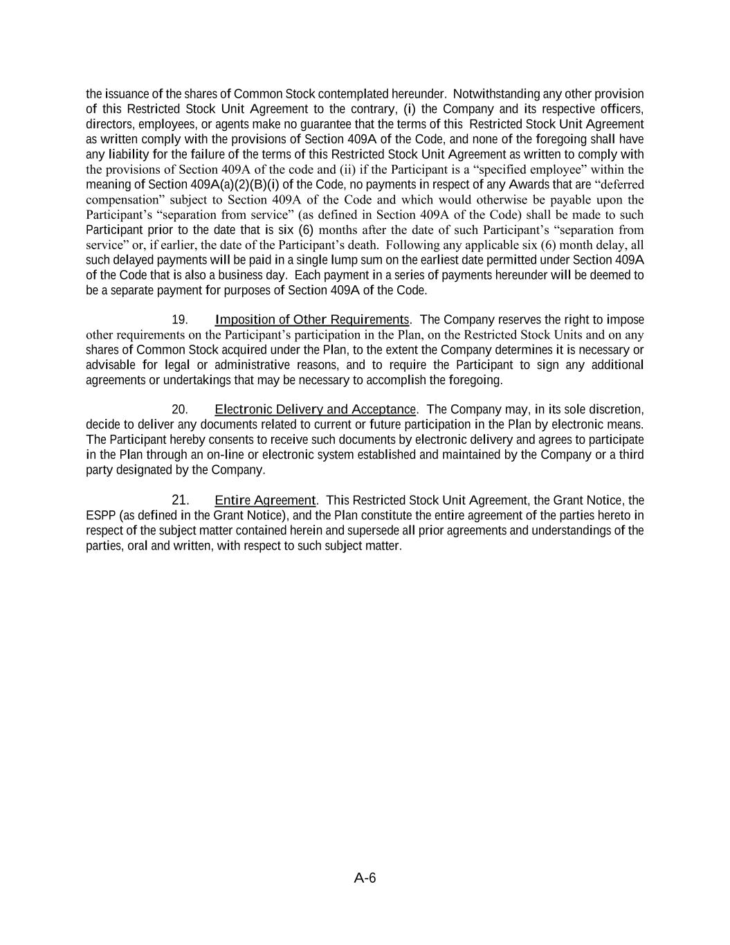 A-6 the issuance of the shares of Common Stock contemplated hereunder. Notwithstanding any other provision of this Restricted Stock Unit Agreement to the contrary, (i) the Company and its respective officers, directors, employees, or agents make no guarantee that the terms of this Restricted Stock Unit Agreement as written comply with the provisions of Section 409A of the Code, and none of the foregoing shall have any liability for the failure of the terms of this Restricted Stock Unit Agreement as written to comply with the provisions of Section 409A of the code and (ii) if the Participant is a “specified employee” within the meaning of Section 409A(a)(2)(B)(i) of the Code, no payments in respect of any Awards that are “deferred compensation” subject to Section 409A of the Code and which would otherwise be payable upon the Participant’s “separation from service” (as defined in Section 409A of the Code) shall be made to such Participant prior to the date that is six (6) months after the date of such Participant’s “separation from service” or, if earlier, the date of the Participant’s death. Following any applicable six (6) month delay, all such delayed payments will be paid in a single lump sum on the earliest date permitted under Section 409A of the Code that is also a business day. Each payment in a series of payments hereunder will be deemed to be a separate payment for purposes of Section 409A of the Code. 19. Imposition of Other Requirements. The Company reserves the right to impose other requirements on the Participant’s participation in the Plan, on the Restricted Stock Units and on any shares of Common Stock acquired under the Plan, to the extent the Company determines it is necessary or advisable for legal or administrative reasons, and to require the Participant to sign any additional agreements or undertakings that may be necessary to accomplish the foregoing. 20. Electronic Delivery and Acceptance. The Company may, in its sole discretion, decide to deliver any documents related to current or future participation in the Plan by electronic means. The Participant hereby consents to receive such documents by electronic delivery and agrees to participate in the Plan through an on-line or electronic system established and maintained by the Company or a third party designated by the Company. 21. Entire Agreement. This Restricted Stock Unit Agreement, the Grant Notice, the ESPP (as defined in the Grant Notice), and the Plan constitute the entire agreement of the parties hereto in respect of the subject matter contained herein and supersede all prior agreements and understandings of the parties, oral and written, with respect to such subject matter.