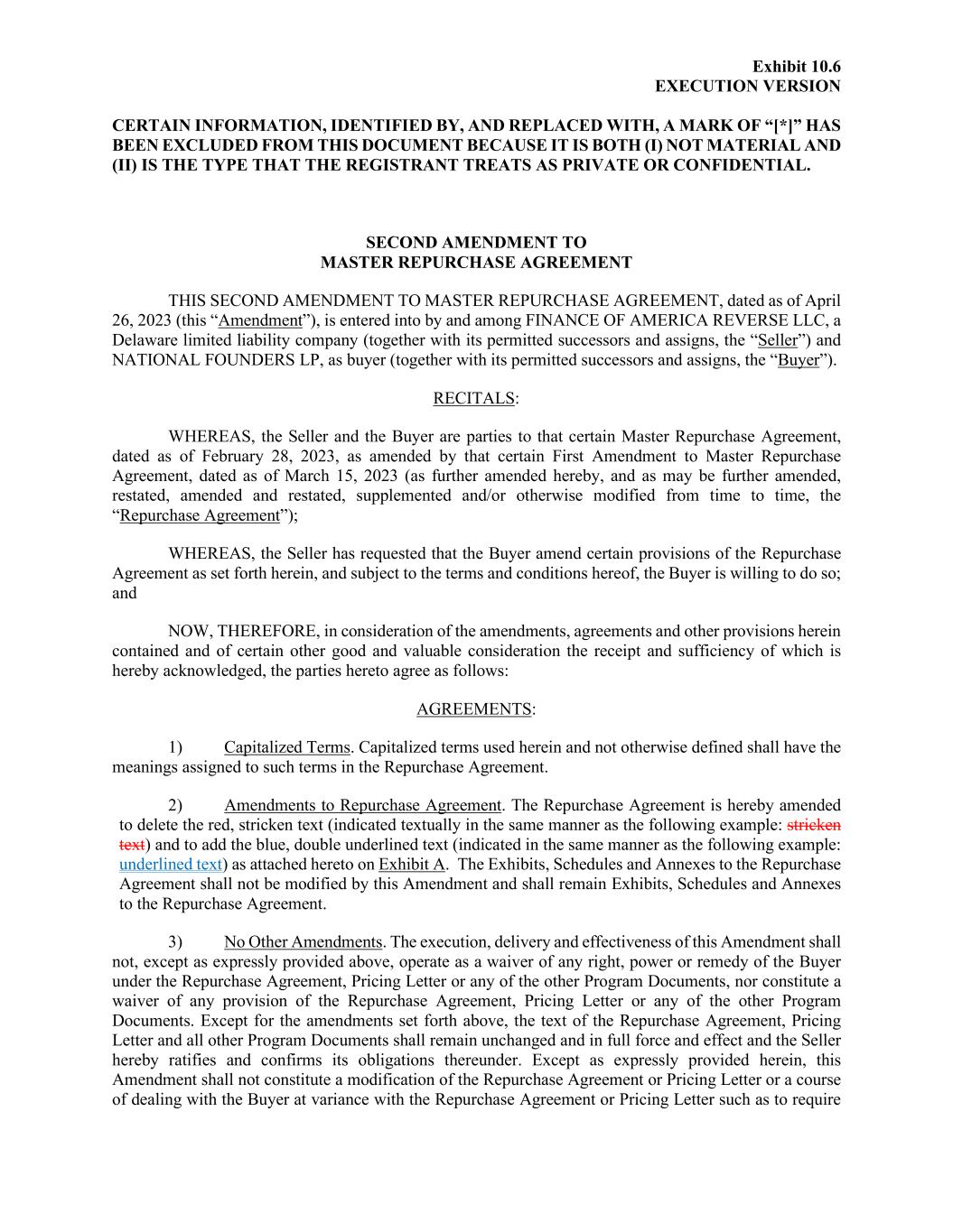 Exhibit 10.6 EXECUTION VERSION CERTAIN INFORMATION, IDENTIFIED BY, AND REPLACED WITH, A MARK OF “[*]” HAS BEEN EXCLUDED FROM THIS DOCUMENT BECAUSE IT IS BOTH (I) NOT MATERIAL AND (II) IS THE TYPE THAT THE REGISTRANT TREATS AS PRIVATE OR CONFIDENTIAL. SECOND AMENDMENT TO MASTER REPURCHASE AGREEMENT THIS SECOND AMENDMENT TO MASTER REPURCHASE AGREEMENT, dated as of April 26, 2023 (this “Amendment”), is entered into by and among FINANCE OF AMERICA REVERSE LLC, a Delaware limited liability company (together with its permitted successors and assigns, the “Seller”) and NATIONAL FOUNDERS LP, as buyer (together with its permitted successors and assigns, the “Buyer”). RECITALS: WHEREAS, the Seller and the Buyer are parties to that certain Master Repurchase Agreement, dated as of February 28, 2023, as amended by that certain First Amendment to Master Repurchase Agreement, dated as of March 15, 2023 (as further amended hereby, and as may be further amended, restated, amended and restated, supplemented and/or otherwise modified from time to time, the “Repurchase Agreement”); WHEREAS, the Seller has requested that the Buyer amend certain provisions of the Repurchase Agreement as set forth herein, and subject to the terms and conditions hereof, the Buyer is willing to do so; and NOW, THEREFORE, in consideration of the amendments, agreements and other provisions herein contained and of certain other good and valuable consideration the receipt and sufficiency of which is hereby acknowledged, the parties hereto agree as follows: AGREEMENTS: 1) Capitalized Terms. Capitalized terms used herein and not otherwise defined shall have the meanings assigned to such terms in the Repurchase Agreement. 2) Amendments to Repurchase Agreement. The Repurchase Agreement is hereby amended to delete the red, stricken text (indicated textually in the same manner as the following example: stricken text) and to add the blue, double underlined text (indicated in the same manner as the following example: underlined text) as attached hereto on Exhibit A. The Exhibits, Schedules and Annexes to the Repurchase Agreement shall not be modified by this Amendment and shall remain Exhibits, Schedules and Annexes to the Repurchase Agreement. 3) No Other Amendments. The execution, delivery and effectiveness of this Amendment shall not, except as expressly provided above, operate as a waiver of any right, power or remedy of the Buyer under the Repurchase Agreement, Pricing Letter or any of the other Program Documents, nor constitute a waiver of any provision of the Repurchase Agreement, Pricing Letter or any of the other Program Documents. Except for the amendments set forth above, the text of the Repurchase Agreement, Pricing Letter and all other Program Documents shall remain unchanged and in full force and effect and the Seller hereby ratifies and confirms its obligations thereunder. Except as expressly provided herein, this Amendment shall not constitute a modification of the Repurchase Agreement or Pricing Letter or a course of dealing with the Buyer at variance with the Repurchase Agreement or Pricing Letter such as to require