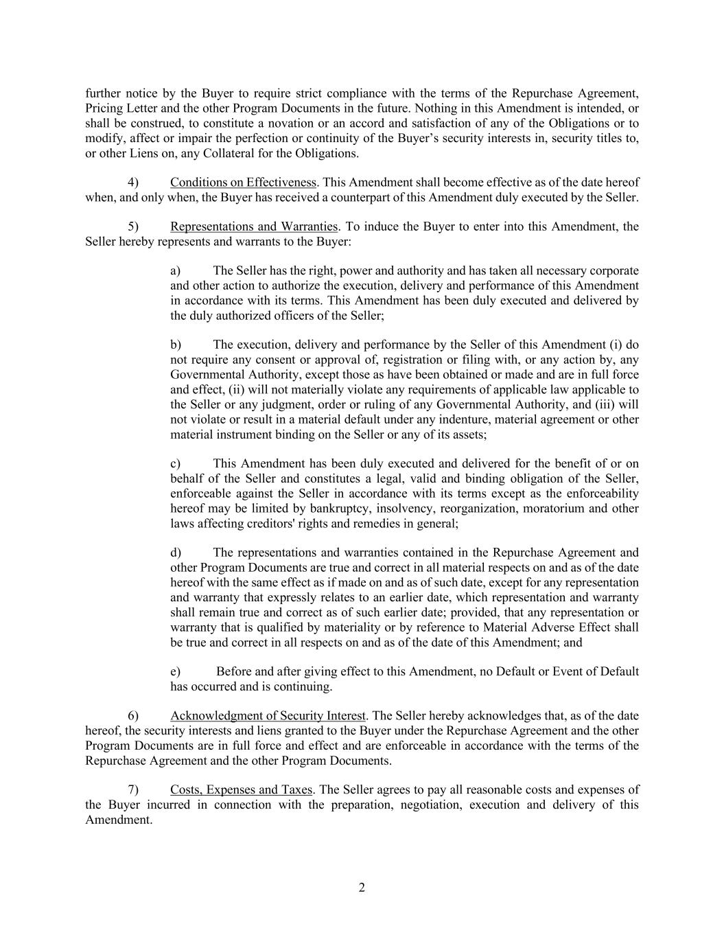 2 further notice by the Buyer to require strict compliance with the terms of the Repurchase Agreement, Pricing Letter and the other Program Documents in the future. Nothing in this Amendment is intended, or shall be construed, to constitute a novation or an accord and satisfaction of any of the Obligations or to modify, affect or impair the perfection or continuity of the Buyer’s security interests in, security titles to, or other Liens on, any Collateral for the Obligations. 4) Conditions on Effectiveness. This Amendment shall become effective as of the date hereof when, and only when, the Buyer has received a counterpart of this Amendment duly executed by the Seller. 5) Representations and Warranties. To induce the Buyer to enter into this Amendment, the Seller hereby represents and warrants to the Buyer: a) The Seller has the right, power and authority and has taken all necessary corporate and other action to authorize the execution, delivery and performance of this Amendment in accordance with its terms. This Amendment has been duly executed and delivered by the duly authorized officers of the Seller; b) The execution, delivery and performance by the Seller of this Amendment (i) do not require any consent or approval of, registration or filing with, or any action by, any Governmental Authority, except those as have been obtained or made and are in full force and effect, (ii) will not materially violate any requirements of applicable law applicable to the Seller or any judgment, order or ruling of any Governmental Authority, and (iii) will not violate or result in a material default under any indenture, material agreement or other material instrument binding on the Seller or any of its assets; c) This Amendment has been duly executed and delivered for the benefit of or on behalf of the Seller and constitutes a legal, valid and binding obligation of the Seller, enforceable against the Seller in accordance with its terms except as the enforceability hereof may be limited by bankruptcy, insolvency, reorganization, moratorium and other laws affecting creditors' rights and remedies in general; d) The representations and warranties contained in the Repurchase Agreement and other Program Documents are true and correct in all material respects on and as of the date hereof with the same effect as if made on and as of such date, except for any representation and warranty that expressly relates to an earlier date, which representation and warranty shall remain true and correct as of such earlier date; provided, that any representation or warranty that is qualified by materiality or by reference to Material Adverse Effect shall be true and correct in all respects on and as of the date of this Amendment; and e) Before and after giving effect to this Amendment, no Default or Event of Default has occurred and is continuing. 6) Acknowledgment of Security Interest. The Seller hereby acknowledges that, as of the date hereof, the security interests and liens granted to the Buyer under the Repurchase Agreement and the other Program Documents are in full force and effect and are enforceable in accordance with the terms of the Repurchase Agreement and the other Program Documents. 7) Costs, Expenses and Taxes. The Seller agrees to pay all reasonable costs and expenses of the Buyer incurred in connection with the preparation, negotiation, execution and delivery of this Amendment.