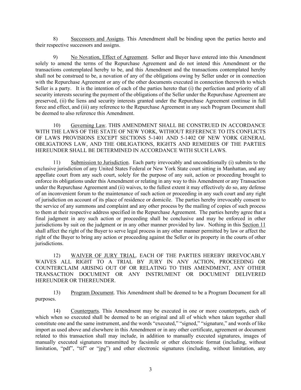 3 8) Successors and Assigns. This Amendment shall be binding upon the parties hereto and their respective successors and assigns. 9) No Novation, Effect of Agreement. Seller and Buyer have entered into this Amendment solely to amend the terms of the Repurchase Agreement and do not intend this Amendment or the transactions contemplated hereby to be, and this Amendment and the transactions contemplated hereby shall not be construed to be, a novation of any of the obligations owing by Seller under or in connection with the Repurchase Agreement or any of the other documents executed in connection therewith to which Seller is a party. It is the intention of each of the parties hereto that (i) the perfection and priority of all security interests securing the payment of the obligations of the Seller under the Repurchase Agreement are preserved, (ii) the liens and security interests granted under the Repurchase Agreement continue in full force and effect, and (iii) any reference to the Repurchase Agreement in any such Program Document shall be deemed to also reference this Amendment. 10) Governing Law. THIS AMENDMENT SHALL BE CONSTRUED IN ACCORDANCE WITH THE LAWS OF THE STATE OF NEW YORK, WITHOUT REFERENCE TO ITS CONFLICTS OF LAWS PROVISIONS EXCEPT SECTIONS 5-1401 AND 5-1402 OF NEW YORK GENERAL OBLIGATIONS LAW, AND THE OBLIGATIONS, RIGHTS AND REMEDIES OF THE PARTIES HEREUNDER SHALL BE DETERMINED IN ACCORDANCE WITH SUCH LAWS. 11) Submission to Jurisdiction. Each party irrevocably and unconditionally (i) submits to the exclusive jurisdiction of any United States Federal or New York State court sitting in Manhattan, and any appellate court from any such court, solely for the purpose of any suit, action or proceeding brought to enforce its obligations under this Amendment or relating in any way to this Amendment or any Transaction under the Repurchase Agreement and (ii) waives, to the fullest extent it may effectively do so, any defense of an inconvenient forum to the maintenance of such action or proceeding in any such court and any right of jurisdiction on account of its place of residence or domicile. The parties hereby irrevocably consent to the service of any summons and complaint and any other process by the mailing of copies of such process to them at their respective address specified in the Repurchase Agreement. The parties hereby agree that a final judgment in any such action or proceeding shall be conclusive and may be enforced in other jurisdictions by suit on the judgment or in any other manner provided by law. Nothing in this Section 11 shall affect the right of the Buyer to serve legal process in any other manner permitted by law or affect the right of the Buyer to bring any action or proceeding against the Seller or its property in the courts of other jurisdictions. 12) WAIVER OF JURY TRIAL. EACH OF THE PARTIES HEREBY IRREVOCABLY WAIVES ALL RIGHT TO A TRIAL BY JURY IN ANY ACTION, PROCEEDING OR COUNTERCLAIM ARISING OUT OF OR RELATING TO THIS AMENDMENT, ANY OTHER TRANSACTION DOCUMENT OR ANY INSTRUMENT OR DOCUMENT DELIVERED HEREUNDER OR THEREUNDER. 13) Program Document. This Amendment shall be deemed to be a Program Document for all purposes. 14) Counterparts. This Amendment may be executed in one or more counterparts, each of which when so executed shall be deemed to be an original and all of which when taken together shall constitute one and the same instrument, and the words “executed,” “signed,” “signature,” and words of like import as used above and elsewhere in this Amendment or in any other certificate, agreement or document related to this transaction shall may include, in addition to manually executed signatures, images of manually executed signatures transmitted by facsimile or other electronic format (including, without limitation, “pdf”, “tif” or “jpg”) and other electronic signatures (including, without limitation, any