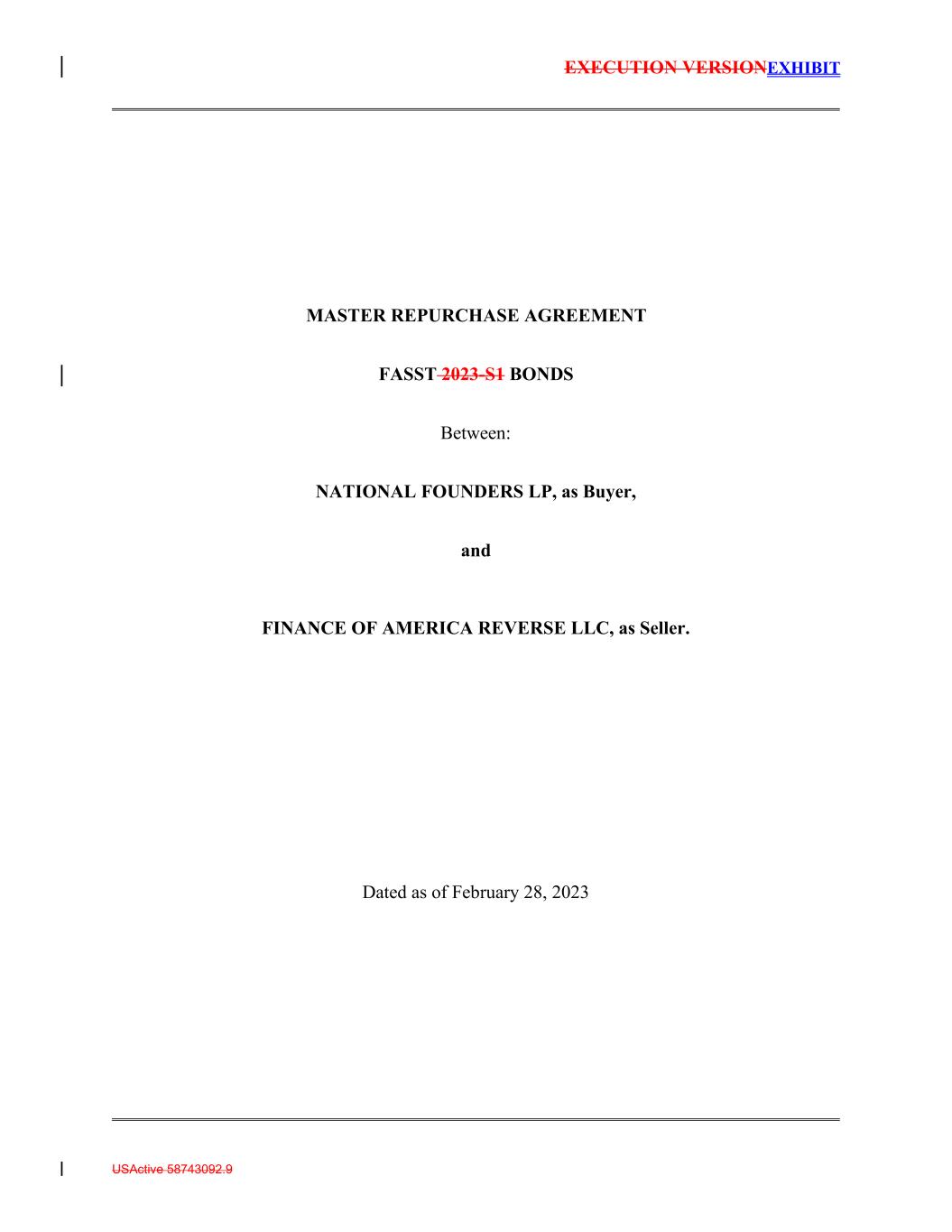 USActive 58743092.9 EXECUTION VERSIONEXHIBIT MASTER REPURCHASE AGREEMENT FASST 2023-S1 BONDS Between: NATIONAL FOUNDERS LP, as Buyer, and FINANCE OF AMERICA REVERSE LLC, as Seller. Dated as of February 28, 2023