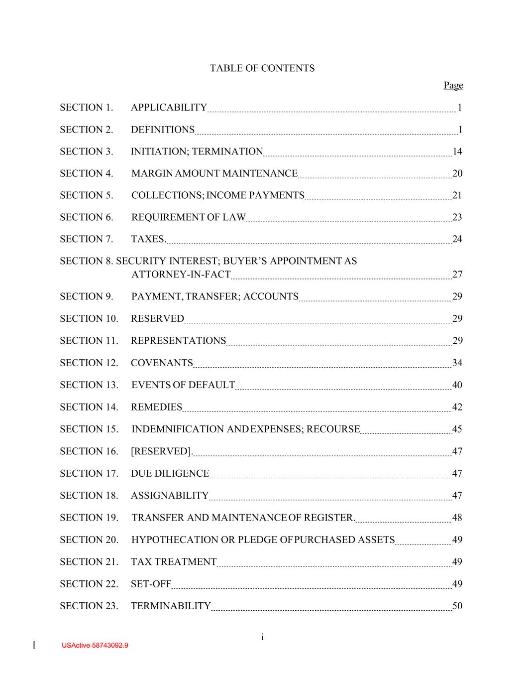 i USActive 58743092.9 TABLE OF CONTENTS Page SECTION 1. APPLICABILITY 1 SECTION 2. DEFINITIONS 1 SECTION 3. INITIATION; TERMINATION 14 SECTION 4. MARGIN AMOUNT MAINTENANCE 20 SECTION 5. COLLECTIONS; INCOME PAYMENTS 21 SECTION 6. REQUIREMENT OF LAW 23 SECTION 7. TAXES. 24 SECTION 8. SECURITY INTEREST; BUYER’S APPOINTMENT AS ATTORNEY-IN-FACT 27 SECTION 9. PAYMENT, TRANSFER; ACCOUNTS 29 SECTION 10. RESERVED 29 SECTION 11. REPRESENTATIONS 29 SECTION 12. COVENANTS 34 SECTION 13. EVENTS OF DEFAULT 40 SECTION 14. REMEDIES 42 SECTION 15. INDEMNIFICATION AND EXPENSES; RECOURSE 45 SECTION 16. [RESERVED]. 47 SECTION 17. DUE DILIGENCE 47 SECTION 18. ASSIGNABILITY 47 SECTION 19. TRANSFER AND MAINTENANCE OF REGISTER. 48 SECTION 20. HYPOTHECATION OR PLEDGE OF PURCHASED ASSETS 49 SECTION 21. TAX TREATMENT 49 SECTION 22. SET-OFF 49 SECTION 23. TERMINABILITY 50