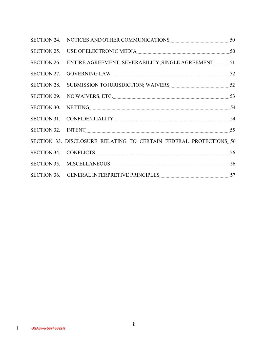 ii USActive 58743092.9 SECTION 24. NOTICES AND OTHER COMMUNICATIONS 50 SECTION 25. USE OF ELECTRONIC MEDIA 50 SECTION 26. ENTIRE AGREEMENT; SEVERABILITY; SINGLE AGREEMENT 51 SECTION 27. GOVERNING LAW 52 SECTION 28. SUBMISSION TO JURISDICTION; WAIVERS 52 SECTION 29. NO WAIVERS, ETC. 53 SECTION 30. NETTING 54 SECTION 31. CONFIDENTIALITY 54 SECTION 32. INTENT 55 SECTION 33. DISCLOSURE RELATING TO CERTAIN FEDERAL PROTECTIONS 56 SECTION 34. CONFLICTS 56 SECTION 35. MISCELLANEOUS 56 SECTION 36. GENERAL INTERPRETIVE PRINCIPLES 57