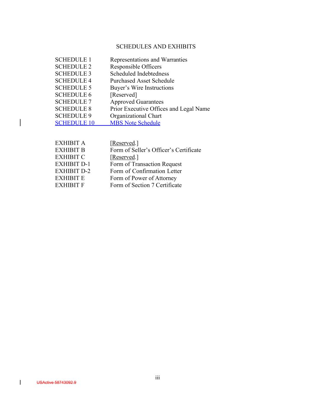 USActive 58743092.9 SCHEDULES AND EXHIBITS SCHEDULE 1 Representations and Warranties SCHEDULE 2 Responsible Officers SCHEDULE 3 Scheduled Indebtedness SCHEDULE 4 Purchased Asset Schedule SCHEDULE 5 Buyer’s Wire Instructions SCHEDULE 6 [Reserved] SCHEDULE 7 Approved Guarantees SCHEDULE 8 Prior Executive Offices and Legal Name SCHEDULE 9 Organizational Chart SCHEDULE 10 MBS Note Schedule EXHIBIT A [Reserved.] EXHIBIT B Form of Seller’s Officer’s Certificate EXHIBIT C [Reserved.] EXHIBIT D-1 Form of Transaction Request EXHIBIT D-2 Form of Confirmation Letter EXHIBIT E Form of Power of Attorney EXHIBIT F Form of Section 7 Certificate iii