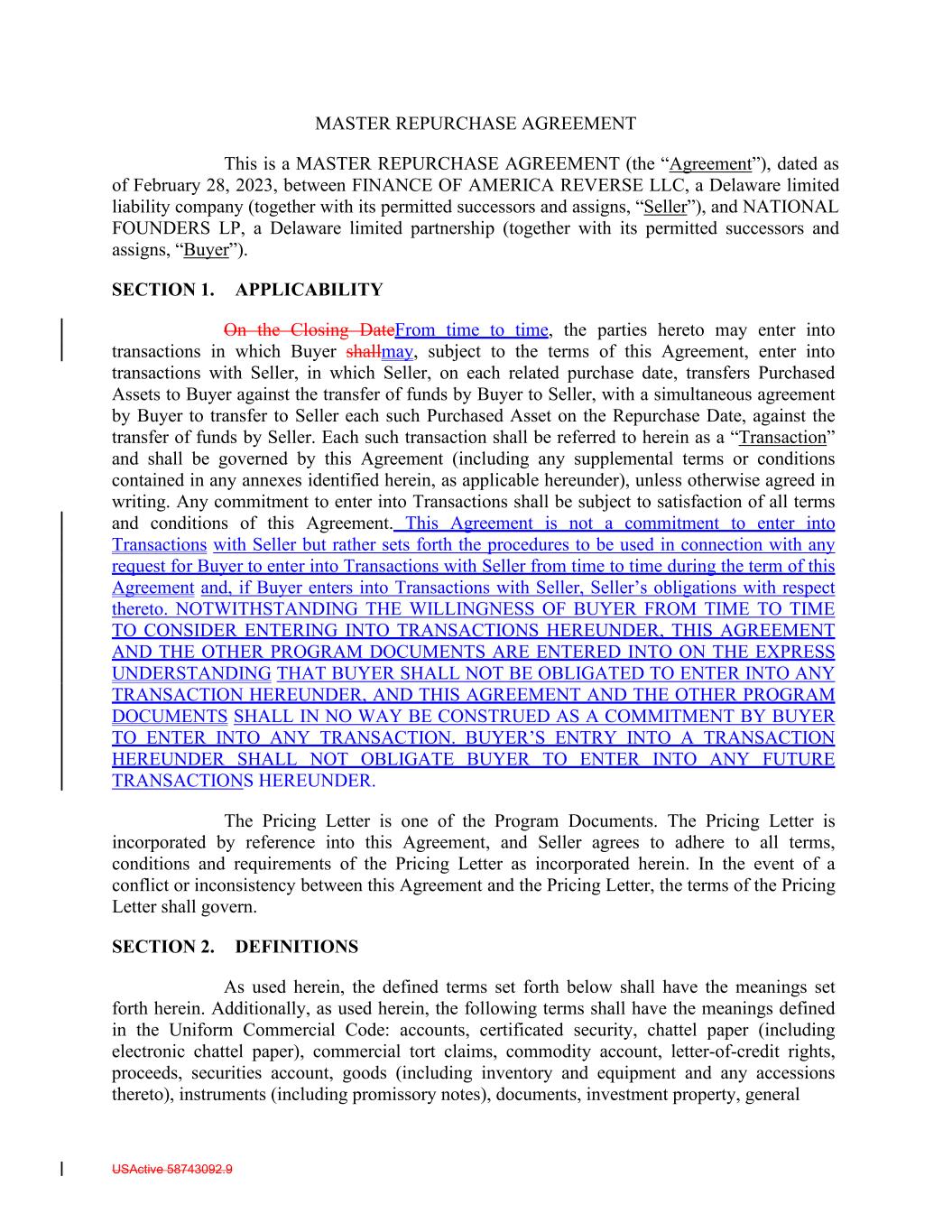 USActive 58743092.9 MASTER REPURCHASE AGREEMENT This is a MASTER REPURCHASE AGREEMENT (the “Agreement”), dated as of February 28, 2023, between FINANCE OF AMERICA REVERSE LLC, a Delaware limited liability company (together with its permitted successors and assigns, “Seller”), and NATIONAL FOUNDERS LP, a Delaware limited partnership (together with its permitted successors and assigns, “Buyer”). SECTION 1. APPLICABILITY On the Closing DateFrom time to time, the parties hereto may enter into transactions in which Buyer shallmay, subject to the terms of this Agreement, enter into transactions with Seller, in which Seller, on each related purchase date, transfers Purchased Assets to Buyer against the transfer of funds by Buyer to Seller, with a simultaneous agreement by Buyer to transfer to Seller each such Purchased Asset on the Repurchase Date, against the transfer of funds by Seller. Each such transaction shall be referred to herein as a “Transaction” and shall be governed by this Agreement (including any supplemental terms or conditions contained in any annexes identified herein, as applicable hereunder), unless otherwise agreed in writing. Any commitment to enter into Transactions shall be subject to satisfaction of all terms and conditions of this Agreement. This Agreement is not a commitment to enter into Transactions with Seller but rather sets forth the procedures to be used in connection with any request for Buyer to enter into Transactions with Seller from time to time during the term of this Agreement and, if Buyer enters into Transactions with Seller, Seller’s obligations with respect thereto. NOTWITHSTANDING THE WILLINGNESS OF BUYER FROM TIME TO TIME TO CONSIDER ENTERING INTO TRANSACTIONS HEREUNDER, THIS AGREEMENT AND THE OTHER PROGRAM DOCUMENTS ARE ENTERED INTO ON THE EXPRESS UNDERSTANDING THAT BUYER SHALL NOT BE OBLIGATED TO ENTER INTO ANY TRANSACTION HEREUNDER, AND THIS AGREEMENT AND THE OTHER PROGRAM DOCUMENTS SHALL IN NO WAY BE CONSTRUED AS A COMMITMENT BY BUYER TO ENTER INTO ANY TRANSACTION. BUYER’S ENTRY INTO A TRANSACTION HEREUNDER SHALL NOT OBLIGATE BUYER TO ENTER INTO ANY FUTURE TRANSACTIONS HEREUNDER. The Pricing Letter is one of the Program Documents. The Pricing Letter is incorporated by reference into this Agreement, and Seller agrees to adhere to all terms, conditions and requirements of the Pricing Letter as incorporated herein. In the event of a conflict or inconsistency between this Agreement and the Pricing Letter, the terms of the Pricing Letter shall govern. SECTION 2. DEFINITIONS As used herein, the defined terms set forth below shall have the meanings set forth herein. Additionally, as used herein, the following terms shall have the meanings defined in the Uniform Commercial Code: accounts, certificated security, chattel paper (including electronic chattel paper), commercial tort claims, commodity account, letter-of-credit rights, proceeds, securities account, goods (including inventory and equipment and any accessions thereto), instruments (including promissory notes), documents, investment property, general