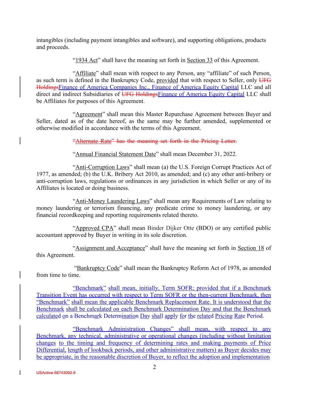 2 USActive 58743092.9 intangibles (including payment intangibles and software), and supporting obligations, products and proceeds. “1934 Act” shall have the meaning set forth in Section 33 of this Agreement. “Affiliate” shall mean with respect to any Person, any “affiliate” of such Person, as such term is defined in the Bankruptcy Code, provided that with respect to Seller, only UFG HoldingsFinance of America Companies Inc., Finance of America Equity Capital LLC and all direct and indirect Subsidiaries of UFG HoldingsFinance of America Equity Capital LLC shall be Affiliates for purposes of this Agreement. “Agreement” shall mean this Master Repurchase Agreement between Buyer and Seller, dated as of the date hereof, as the same may be further amended, supplemented or otherwise modified in accordance with the terms of this Agreement. “Alternate Rate” has the meaning set forth in the Pricing Letter. “Annual Financial Statement Date” shall mean December 31, 2022. “Anti-Corruption Laws” shall mean (a) the U.S. Foreign Corrupt Practices Act of 1977, as amended; (b) the U.K. Bribery Act 2010, as amended; and (c) any other anti-bribery or anti-corruption laws, regulations or ordinances in any jurisdiction in which Seller or any of its Affiliates is located or doing business. “Anti-Money Laundering Laws” shall mean any Requirements of Law relating to money laundering or terrorism financing, any predicate crime to money laundering, or any financial recordkeeping and reporting requirements related thereto. “Approved CPA” shall mean Binder Dijker Otte (BDO) or any certified public accountant approved by Buyer in writing in its sole discretion. “Assignment and Acceptance” shall have the meaning set forth in Section 18 of this Agreement. “Bankruptcy Code” shall mean the Bankruptcy Reform Act of 1978, as amended from time to time. “Benchmark” shall mean, initially, Term SOFR; provided that if a Benchmark Transition Event has occurred with respect to Term SOFR or the then-current Benchmark, then “Benchmark” shall mean the applicable Benchmark Replacement Rate. It is understood that the Benchmark shall be calculated on each Benchmark Determination Day and that the Benchmark calculated on a Benchmark Determination Day shall apply for the related Pricing Rate Period. “Benchmark Administration Changes” shall mean, with respect to any Benchmark, any technical, administrative or operational changes (including without limitation changes to the timing and frequency of determining rates and making payments of Price Differential, length of lookback periods, and other administrative matters) as Buyer decides may be appropriate, in the reasonable discretion of Buyer, to reflect the adoption and implementation