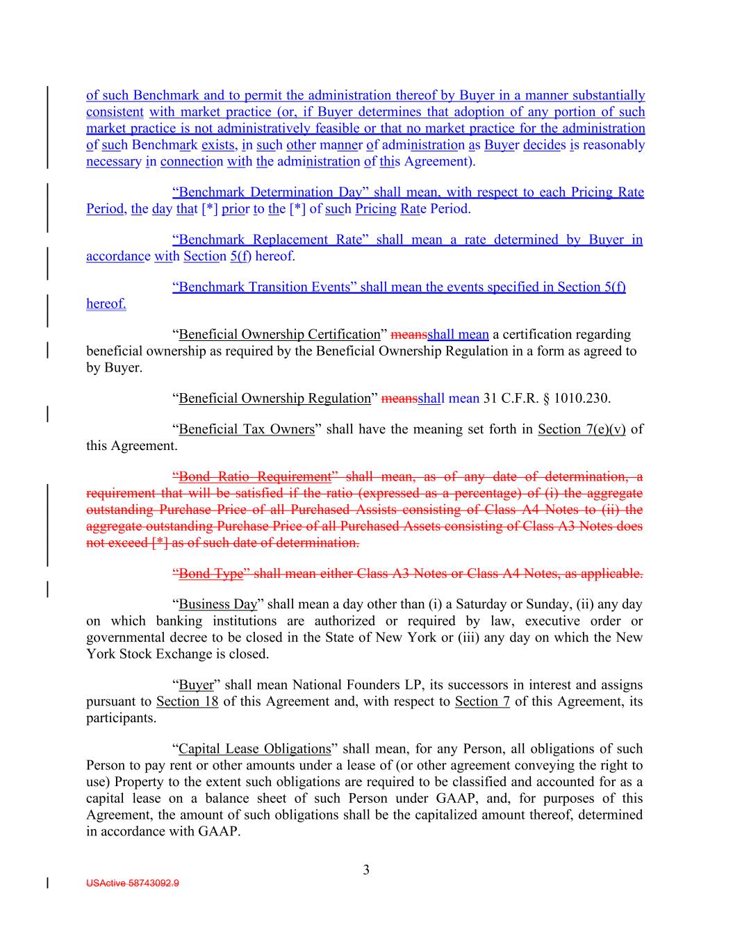 3 USActive 58743092.9 of such Benchmark and to permit the administration thereof by Buyer in a manner substantially consistent with market practice (or, if Buyer determines that adoption of any portion of such market practice is not administratively feasible or that no market practice for the administration of such Benchmark exists, in such other manner of administration as Buyer decides is reasonably necessary in connection with the administration of this Agreement). “Benchmark Determination Day” shall mean, with respect to each Pricing Rate Period, the day that [*] prior to the [*] of such Pricing Rate Period. “Benchmark Replacement Rate” shall mean a rate determined by Buyer in accordance with Section 5(f) hereof. “Benchmark Transition Events” shall mean the events specified in Section 5(f) hereof. “Beneficial Ownership Certification” meansshall mean a certification regarding beneficial ownership as required by the Beneficial Ownership Regulation in a form as agreed to by Buyer. “Beneficial Ownership Regulation” meansshall mean 31 C.F.R. § 1010.230. “Beneficial Tax Owners” shall have the meaning set forth in Section 7(e)(v) of this Agreement. “Bond Ratio Requirement” shall mean, as of any date of determination, a requirement that will be satisfied if the ratio (expressed as a percentage) of (i) the aggregate outstanding Purchase Price of all Purchased Assists consisting of Class A4 Notes to (ii) the aggregate outstanding Purchase Price of all Purchased Assets consisting of Class A3 Notes does not exceed [*] as of such date of determination. “Bond Type” shall mean either Class A3 Notes or Class A4 Notes, as applicable. “Business Day” shall mean a day other than (i) a Saturday or Sunday, (ii) any day on which banking institutions are authorized or required by law, executive order or governmental decree to be closed in the State of New York or (iii) any day on which the New York Stock Exchange is closed. “Buyer” shall mean National Founders LP, its successors in interest and assigns pursuant to Section 18 of this Agreement and, with respect to Section 7 of this Agreement, its participants. “Capital Lease Obligations” shall mean, for any Person, all obligations of such Person to pay rent or other amounts under a lease of (or other agreement conveying the right to use) Property to the extent such obligations are required to be classified and accounted for as a capital lease on a balance sheet of such Person under GAAP, and, for purposes of this Agreement, the amount of such obligations shall be the capitalized amount thereof, determined in accordance with GAAP.