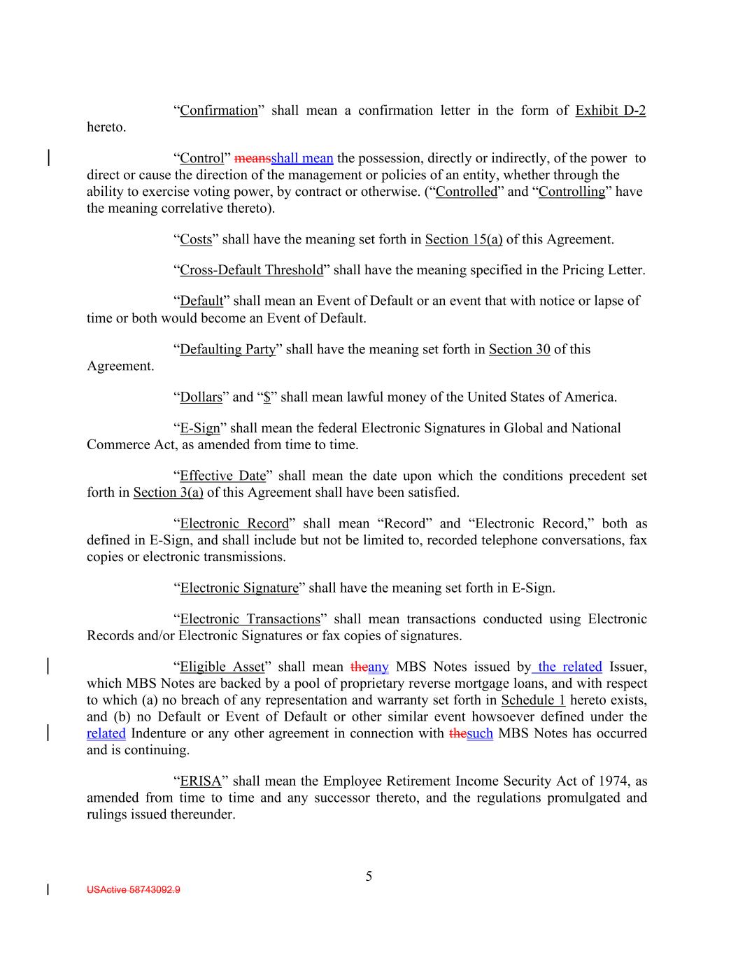5 USActive 58743092.9 hereto. “Confirmation” shall mean a confirmation letter in the form of Exhibit D-2 “Control” meansshall mean the possession, directly or indirectly, of the power to direct or cause the direction of the management or policies of an entity, whether through the ability to exercise voting power, by contract or otherwise. (“Controlled” and “Controlling” have the meaning correlative thereto). “Costs” shall have the meaning set forth in Section 15(a) of this Agreement. “Cross-Default Threshold” shall have the meaning specified in the Pricing Letter. “Default” shall mean an Event of Default or an event that with notice or lapse of time or both would become an Event of Default. “Defaulting Party” shall have the meaning set forth in Section 30 of this Agreement. “Dollars” and “$” shall mean lawful money of the United States of America. “E-Sign” shall mean the federal Electronic Signatures in Global and National Commerce Act, as amended from time to time. “Effective Date” shall mean the date upon which the conditions precedent set forth in Section 3(a) of this Agreement shall have been satisfied. “Electronic Record” shall mean “Record” and “Electronic Record,” both as defined in E-Sign, and shall include but not be limited to, recorded telephone conversations, fax copies or electronic transmissions. “Electronic Signature” shall have the meaning set forth in E-Sign. “Electronic Transactions” shall mean transactions conducted using Electronic Records and/or Electronic Signatures or fax copies of signatures. “Eligible Asset” shall mean theany MBS Notes issued by the related Issuer, which MBS Notes are backed by a pool of proprietary reverse mortgage loans, and with respect to which (a) no breach of any representation and warranty set forth in Schedule 1 hereto exists, and (b) no Default or Event of Default or other similar event howsoever defined under the related Indenture or any other agreement in connection with thesuch MBS Notes has occurred and is continuing. “ERISA” shall mean the Employee Retirement Income Security Act of 1974, as amended from time to time and any successor thereto, and the regulations promulgated and rulings issued thereunder.