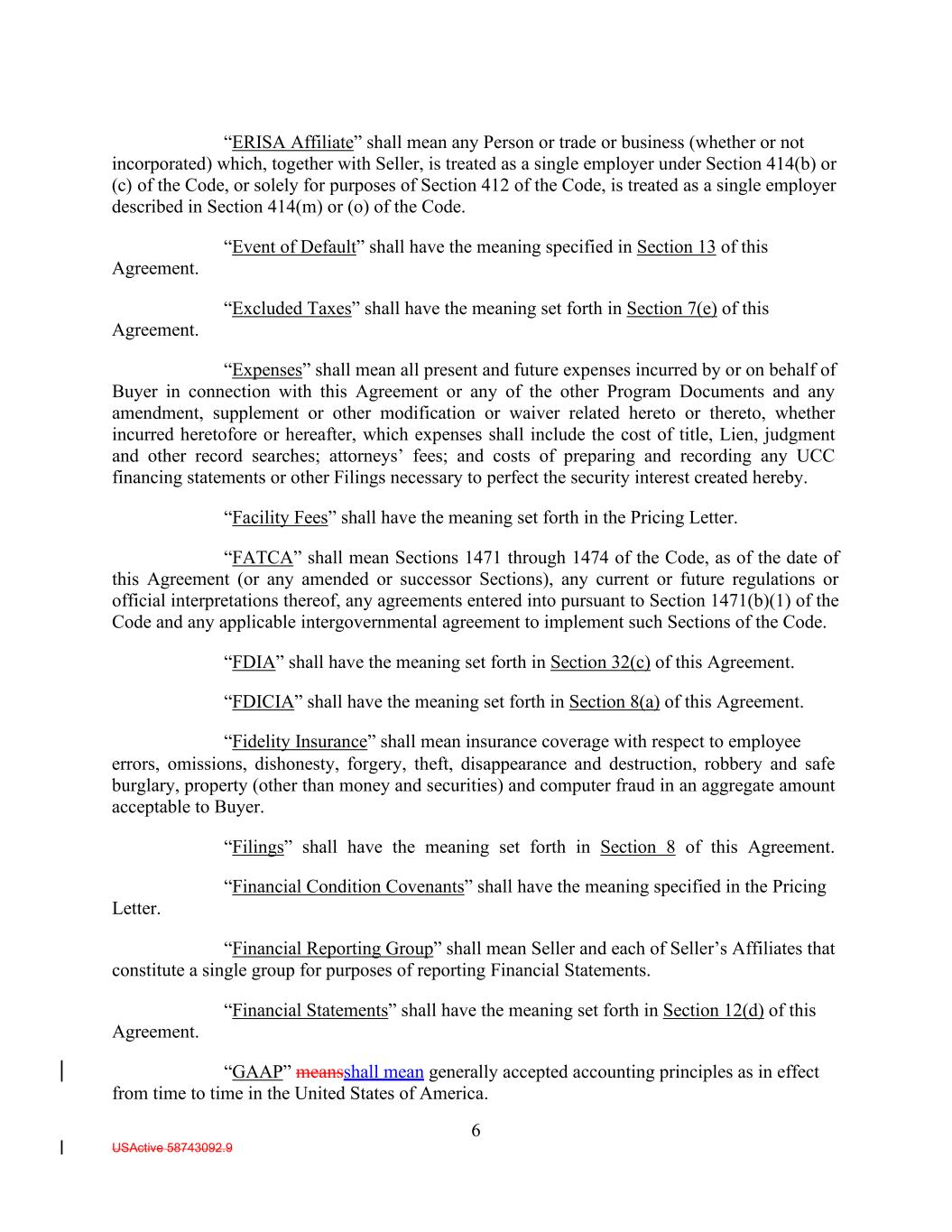 6 USActive 58743092.9 “ERISA Affiliate” shall mean any Person or trade or business (whether or not incorporated) which, together with Seller, is treated as a single employer under Section 414(b) or (c) of the Code, or solely for purposes of Section 412 of the Code, is treated as a single employer described in Section 414(m) or (o) of the Code. “Event of Default” shall have the meaning specified in Section 13 of this Agreement. Agreement. “Excluded Taxes” shall have the meaning set forth in Section 7(e) of this “Expenses” shall mean all present and future expenses incurred by or on behalf of Buyer in connection with this Agreement or any of the other Program Documents and any amendment, supplement or other modification or waiver related hereto or thereto, whether incurred heretofore or hereafter, which expenses shall include the cost of title, Lien, judgment and other record searches; attorneys’ fees; and costs of preparing and recording any UCC financing statements or other Filings necessary to perfect the security interest created hereby. “Facility Fees” shall have the meaning set forth in the Pricing Letter. “FATCA” shall mean Sections 1471 through 1474 of the Code, as of the date of this Agreement (or any amended or successor Sections), any current or future regulations or official interpretations thereof, any agreements entered into pursuant to Section 1471(b)(1) of the Code and any applicable intergovernmental agreement to implement such Sections of the Code. “FDIA” shall have the meaning set forth in Section 32(c) of this Agreement. “FDICIA” shall have the meaning set forth in Section 8(a) of this Agreement. “Fidelity Insurance” shall mean insurance coverage with respect to employee errors, omissions, dishonesty, forgery, theft, disappearance and destruction, robbery and safe burglary, property (other than money and securities) and computer fraud in an aggregate amount acceptable to Buyer. “Filings” shall have the meaning set forth in Section 8 of this Agreement. “Financial Condition Covenants” shall have the meaning specified in the Pricing Letter. “Financial Reporting Group” shall mean Seller and each of Seller’s Affiliates that constitute a single group for purposes of reporting Financial Statements. “Financial Statements” shall have the meaning set forth in Section 12(d) of this Agreement. “GAAP” meansshall mean generally accepted accounting principles as in effect from time to time in the United States of America.