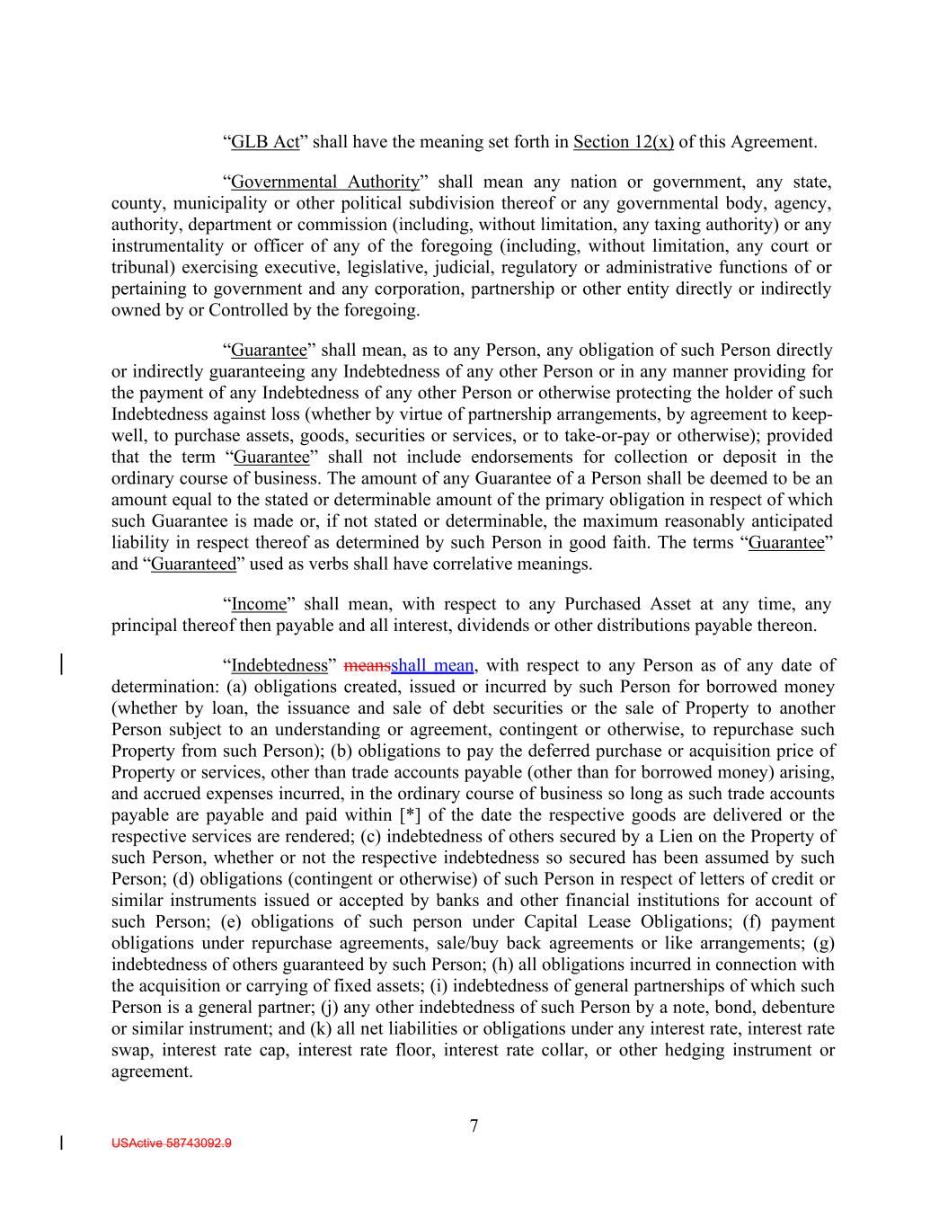 7 USActive 58743092.9 “GLB Act” shall have the meaning set forth in Section 12(x) of this Agreement. “Governmental Authority” shall mean any nation or government, any state, county, municipality or other political subdivision thereof or any governmental body, agency, authority, department or commission (including, without limitation, any taxing authority) or any instrumentality or officer of any of the foregoing (including, without limitation, any court or tribunal) exercising executive, legislative, judicial, regulatory or administrative functions of or pertaining to government and any corporation, partnership or other entity directly or indirectly owned by or Controlled by the foregoing. “Guarantee” shall mean, as to any Person, any obligation of such Person directly or indirectly guaranteeing any Indebtedness of any other Person or in any manner providing for the payment of any Indebtedness of any other Person or otherwise protecting the holder of such Indebtedness against loss (whether by virtue of partnership arrangements, by agreement to keep- well, to purchase assets, goods, securities or services, or to take-or-pay or otherwise); provided that the term “Guarantee” shall not include endorsements for collection or deposit in the ordinary course of business. The amount of any Guarantee of a Person shall be deemed to be an amount equal to the stated or determinable amount of the primary obligation in respect of which such Guarantee is made or, if not stated or determinable, the maximum reasonably anticipated liability in respect thereof as determined by such Person in good faith. The terms “Guarantee” and “Guaranteed” used as verbs shall have correlative meanings. “Income” shall mean, with respect to any Purchased Asset at any time, any principal thereof then payable and all interest, dividends or other distributions payable thereon. “Indebtedness” meansshall mean, with respect to any Person as of any date of determination: (a) obligations created, issued or incurred by such Person for borrowed money (whether by loan, the issuance and sale of debt securities or the sale of Property to another Person subject to an understanding or agreement, contingent or otherwise, to repurchase such Property from such Person); (b) obligations to pay the deferred purchase or acquisition price of Property or services, other than trade accounts payable (other than for borrowed money) arising, and accrued expenses incurred, in the ordinary course of business so long as such trade accounts payable are payable and paid within [*] of the date the respective goods are delivered or the respective services are rendered; (c) indebtedness of others secured by a Lien on the Property of such Person, whether or not the respective indebtedness so secured has been assumed by such Person; (d) obligations (contingent or otherwise) of such Person in respect of letters of credit or similar instruments issued or accepted by banks and other financial institutions for account of such Person; (e) obligations of such person under Capital Lease Obligations; (f) payment obligations under repurchase agreements, sale/buy back agreements or like arrangements; (g) indebtedness of others guaranteed by such Person; (h) all obligations incurred in connection with the acquisition or carrying of fixed assets; (i) indebtedness of general partnerships of which such Person is a general partner; (j) any other indebtedness of such Person by a note, bond, debenture or similar instrument; and (k) all net liabilities or obligations under any interest rate, interest rate swap, interest rate cap, interest rate floor, interest rate collar, or other hedging instrument or agreement.