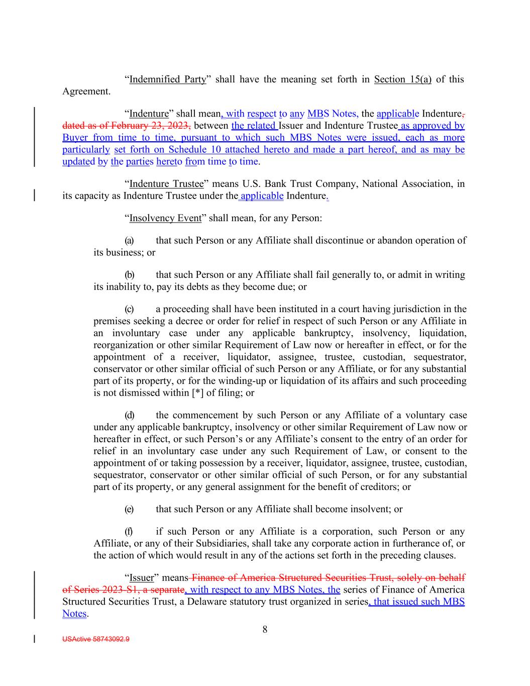8 USActive 58743092.9 Agreement. “Indemnified Party” shall have the meaning set forth in Section 15(a) of this “Indenture” shall mean, with respect to any MBS Notes, the applicable Indenture, dated as of February 23, 2023, between the related Issuer and Indenture Trustee as approved by Buyer from time to time, pursuant to which such MBS Notes were issued, each as more particularly set forth on Schedule 10 attached hereto and made a part hereof, and as may be updated by the parties hereto from time to time. “Indenture Trustee” means U.S. Bank Trust Company, National Association, in its capacity as Indenture Trustee under the applicable Indenture. “Insolvency Event” shall mean, for any Person: (a) that such Person or any Affiliate shall discontinue or abandon operation of its business; or (b) that such Person or any Affiliate shall fail generally to, or admit in writing its inability to, pay its debts as they become due; or (c) a proceeding shall have been instituted in a court having jurisdiction in the premises seeking a decree or order for relief in respect of such Person or any Affiliate in an involuntary case under any applicable bankruptcy, insolvency, liquidation, reorganization or other similar Requirement of Law now or hereafter in effect, or for the appointment of a receiver, liquidator, assignee, trustee, custodian, sequestrator, conservator or other similar official of such Person or any Affiliate, or for any substantial part of its property, or for the winding-up or liquidation of its affairs and such proceeding is not dismissed within [*] of filing; or (d) the commencement by such Person or any Affiliate of a voluntary case under any applicable bankruptcy, insolvency or other similar Requirement of Law now or hereafter in effect, or such Person’s or any Affiliate’s consent to the entry of an order for relief in an involuntary case under any such Requirement of Law, or consent to the appointment of or taking possession by a receiver, liquidator, assignee, trustee, custodian, sequestrator, conservator or other similar official of such Person, or for any substantial part of its property, or any general assignment for the benefit of creditors; or (e) that such Person or any Affiliate shall become insolvent; or (f) if such Person or any Affiliate is a corporation, such Person or any Affiliate, or any of their Subsidiaries, shall take any corporate action in furtherance of, or the action of which would result in any of the actions set forth in the preceding clauses. “Issuer” means Finance of America Structured Securities Trust, solely on behalf of Series 2023-S1, a separate, with respect to any MBS Notes, the series of Finance of America Structured Securities Trust, a Delaware statutory trust organized in series, that issued such MBS Notes.