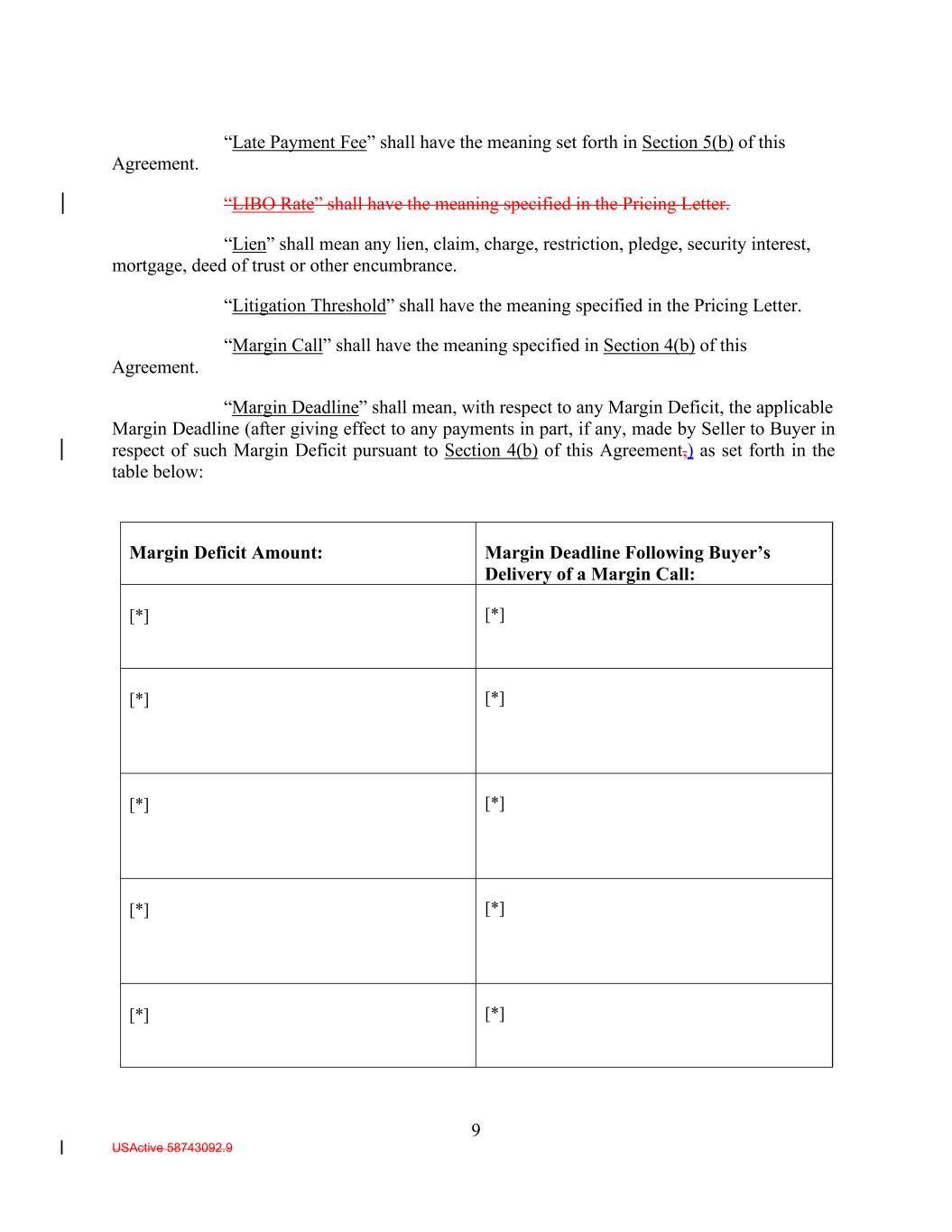 9 USActive 58743092.9 Agreement. “Late Payment Fee” shall have the meaning set forth in Section 5(b) of this “LIBO Rate” shall have the meaning specified in the Pricing Letter. “Lien” shall mean any lien, claim, charge, restriction, pledge, security interest, mortgage, deed of trust or other encumbrance. “Litigation Threshold” shall have the meaning specified in the Pricing Letter. “Margin Call” shall have the meaning specified in Section 4(b) of this Agreement. “Margin Deadline” shall mean, with respect to any Margin Deficit, the applicable Margin Deadline (after giving effect to any payments in part, if any, made by Seller to Buyer in respect of such Margin Deficit pursuant to Section 4(b) of this Agreement,) as set forth in the table below: Margin Deficit Amount: Margin Deadline Following Buyer’s Delivery of a Margin Call: [*] [*] [*] [*] [*] [*] [*] [*] [*] [*]