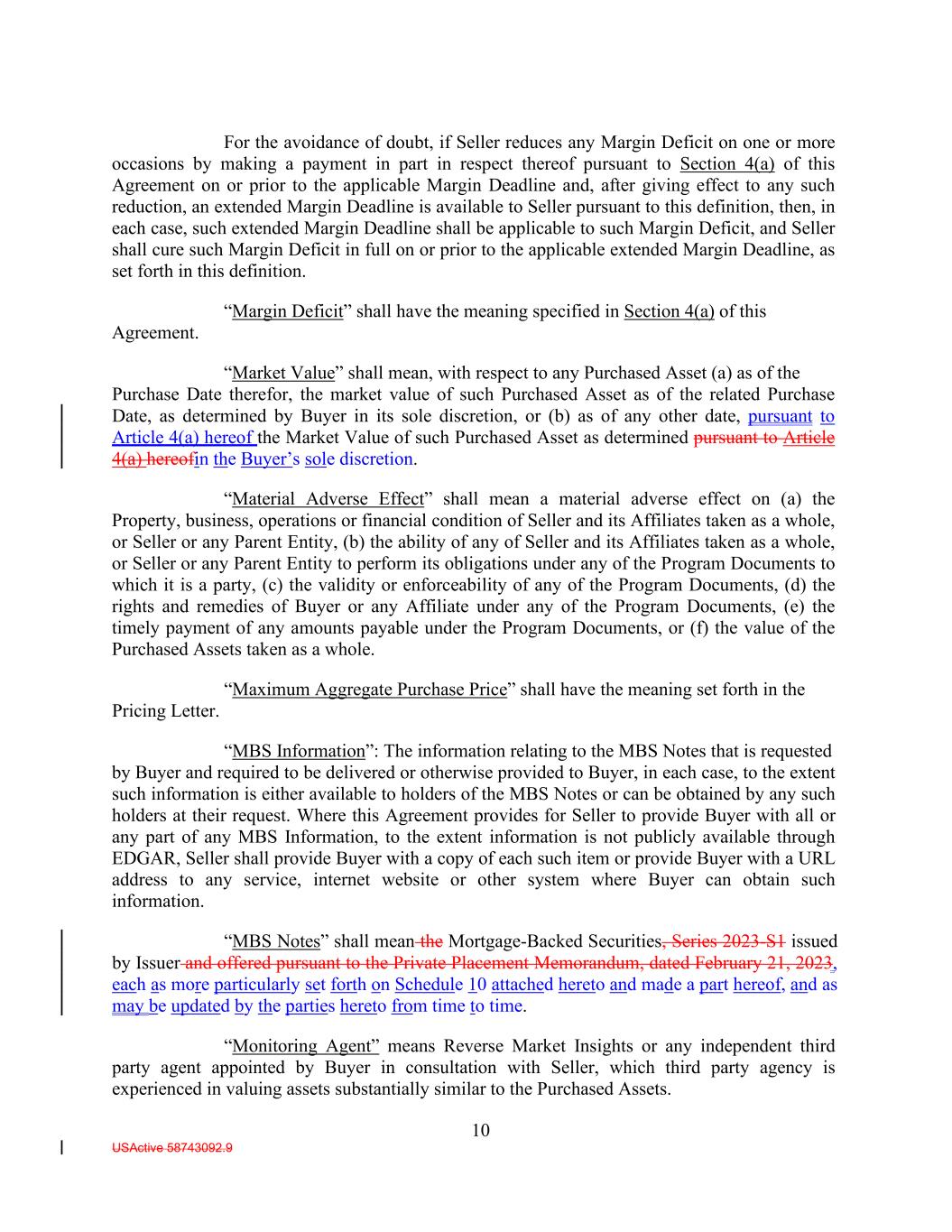 10 USActive 58743092.9 For the avoidance of doubt, if Seller reduces any Margin Deficit on one or more occasions by making a payment in part in respect thereof pursuant to Section 4(a) of this Agreement on or prior to the applicable Margin Deadline and, after giving effect to any such reduction, an extended Margin Deadline is available to Seller pursuant to this definition, then, in each case, such extended Margin Deadline shall be applicable to such Margin Deficit, and Seller shall cure such Margin Deficit in full on or prior to the applicable extended Margin Deadline, as set forth in this definition. “Margin Deficit” shall have the meaning specified in Section 4(a) of this Agreement. “Market Value” shall mean, with respect to any Purchased Asset (a) as of the Purchase Date therefor, the market value of such Purchased Asset as of the related Purchase Date, as determined by Buyer in its sole discretion, or (b) as of any other date, pursuant to Article 4(a) hereof the Market Value of such Purchased Asset as determined pursuant to Article 4(a) hereofin the Buyer’s sole discretion. “Material Adverse Effect” shall mean a material adverse effect on (a) the Property, business, operations or financial condition of Seller and its Affiliates taken as a whole, or Seller or any Parent Entity, (b) the ability of any of Seller and its Affiliates taken as a whole, or Seller or any Parent Entity to perform its obligations under any of the Program Documents to which it is a party, (c) the validity or enforceability of any of the Program Documents, (d) the rights and remedies of Buyer or any Affiliate under any of the Program Documents, (e) the timely payment of any amounts payable under the Program Documents, or (f) the value of the Purchased Assets taken as a whole. “Maximum Aggregate Purchase Price” shall have the meaning set forth in the Pricing Letter. “MBS Information”: The information relating to the MBS Notes that is requested by Buyer and required to be delivered or otherwise provided to Buyer, in each case, to the extent such information is either available to holders of the MBS Notes or can be obtained by any such holders at their request. Where this Agreement provides for Seller to provide Buyer with all or any part of any MBS Information, to the extent information is not publicly available through EDGAR, Seller shall provide Buyer with a copy of each such item or provide Buyer with a URL address to any service, internet website or other system where Buyer can obtain such information. “MBS Notes” shall mean the Mortgage-Backed Securities, Series 2023-S1 issued by Issuer and offered pursuant to the Private Placement Memorandum, dated February 21, 2023, each as more particularly set forth on Schedule 10 attached hereto and made a part hereof, and as may be updated by the parties hereto from time to time. “Monitoring Agent” means Reverse Market Insights or any independent third party agent appointed by Buyer in consultation with Seller, which third party agency is experienced in valuing assets substantially similar to the Purchased Assets.