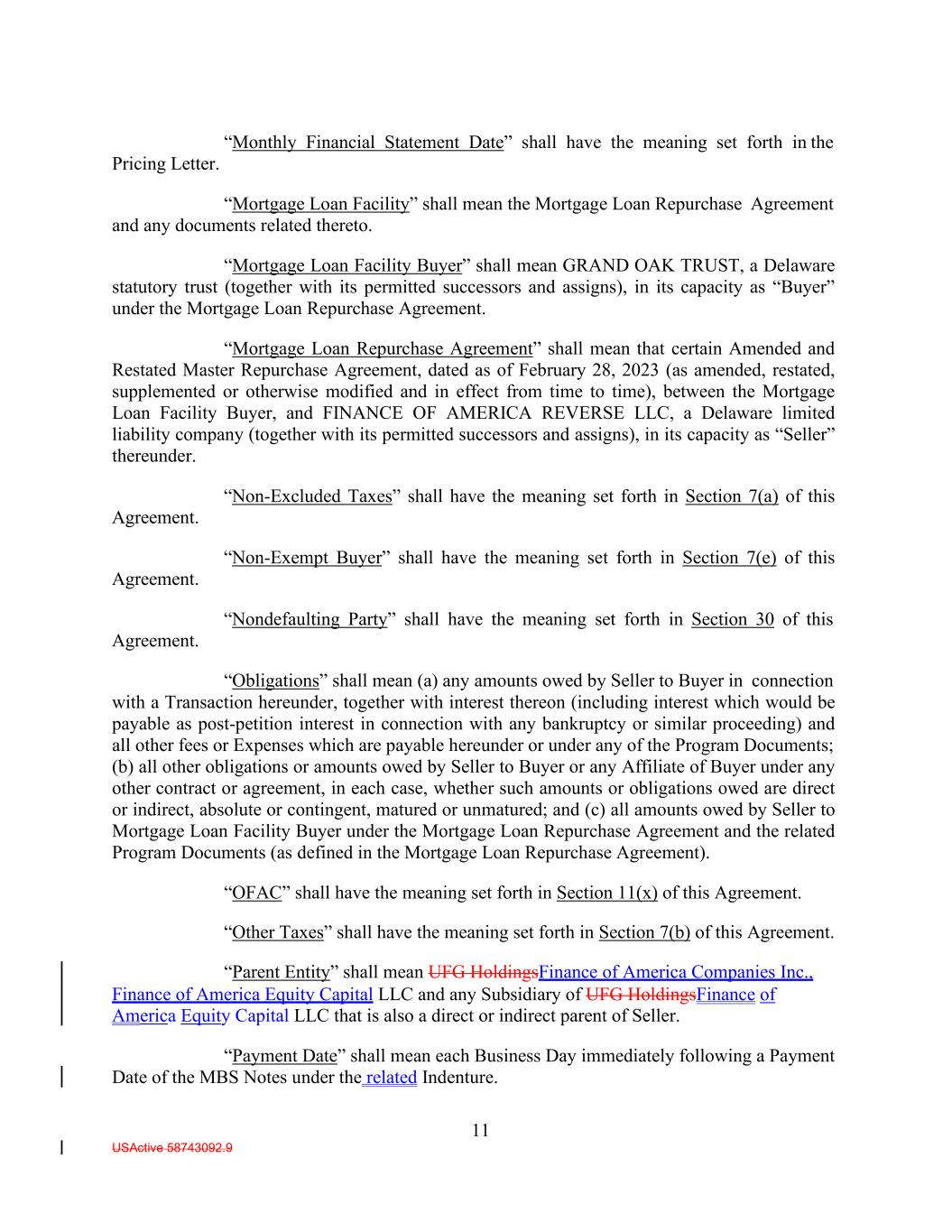 11 USActive 58743092.9 Pricing Letter. “Monthly Financial Statement Date” shall have the meaning set forth in the “Mortgage Loan Facility” shall mean the Mortgage Loan Repurchase Agreement and any documents related thereto. “Mortgage Loan Facility Buyer” shall mean GRAND OAK TRUST, a Delaware statutory trust (together with its permitted successors and assigns), in its capacity as “Buyer” under the Mortgage Loan Repurchase Agreement. “Mortgage Loan Repurchase Agreement” shall mean that certain Amended and Restated Master Repurchase Agreement, dated as of February 28, 2023 (as amended, restated, supplemented or otherwise modified and in effect from time to time), between the Mortgage Loan Facility Buyer, and FINANCE OF AMERICA REVERSE LLC, a Delaware limited liability company (together with its permitted successors and assigns), in its capacity as “Seller” thereunder. Agreement. Agreement. Agreement. “Non-Excluded Taxes” shall have the meaning set forth in Section 7(a) of this “Non-Exempt Buyer” shall have the meaning set forth in Section 7(e) of this “Nondefaulting Party” shall have the meaning set forth in Section 30 of this “Obligations” shall mean (a) any amounts owed by Seller to Buyer in connection with a Transaction hereunder, together with interest thereon (including interest which would be payable as post-petition interest in connection with any bankruptcy or similar proceeding) and all other fees or Expenses which are payable hereunder or under any of the Program Documents; (b) all other obligations or amounts owed by Seller to Buyer or any Affiliate of Buyer under any other contract or agreement, in each case, whether such amounts or obligations owed are direct or indirect, absolute or contingent, matured or unmatured; and (c) all amounts owed by Seller to Mortgage Loan Facility Buyer under the Mortgage Loan Repurchase Agreement and the related Program Documents (as defined in the Mortgage Loan Repurchase Agreement). “OFAC” shall have the meaning set forth in Section 11(x) of this Agreement. “Other Taxes” shall have the meaning set forth in Section 7(b) of this Agreement. “Parent Entity” shall mean UFG HoldingsFinance of America Companies Inc., Finance of America Equity Capital LLC and any Subsidiary of UFG HoldingsFinance of America Equity Capital LLC that is also a direct or indirect parent of Seller. “Payment Date” shall mean each Business Day immediately following a Payment Date of the MBS Notes under the related Indenture.