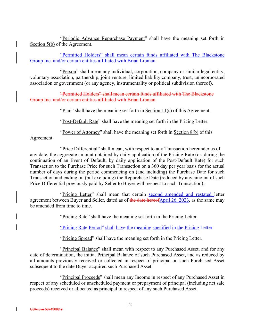 12 USActive 58743092.9 “Periodic Advance Repurchase Payment” shall have the meaning set forth in Section 5(b) of the Agreement. “Permitted Holders” shall mean certain funds affiliated with The Blackstone Group Inc. and/or certain entities affiliated with Brian Libman. “Person” shall mean any individual, corporation, company or similar legal entity, voluntary association, partnership, joint venture, limited liability company, trust, unincorporated association or government (or any agency, instrumentality or political subdivision thereof). “Permitted Holders” shall mean certain funds affiliated with The Blackstone Group Inc. and/or certain entities affiliated with Brian Libman. “Plan” shall have the meaning set forth in Section 11(s) of this Agreement. “Post-Default Rate” shall have the meaning set forth in the Pricing Letter. “Power of Attorney” shall have the meaning set forth in Section 8(b) of this Agreement. “Price Differential” shall mean, with respect to any Transaction hereunder as of any date, the aggregate amount obtained by daily application of the Pricing Rate (or, during the continuation of an Event of Default, by daily application of the Post-Default Rate) for such Transaction to the Purchase Price for such Transaction on a 360 day per year basis for the actual number of days during the period commencing on (and including) the Purchase Date for such Transaction and ending on (but excluding) the Repurchase Date (reduced by any amount of such Price Differential previously paid by Seller to Buyer with respect to such Transaction). “Pricing Letter” shall mean that certain second amended and restated letter agreement between Buyer and Seller, dated as of the date hereofApril 26, 2023, as the same may be amended from time to time. “Pricing Rate” shall have the meaning set forth in the Pricing Letter. “Pricing Rate Period” shall have the meaning specified in the Pricing Letter. “Pricing Spread” shall have the meaning set forth in the Pricing Letter. “Principal Balance” shall mean with respect to any Purchased Asset, and for any date of determination, the initial Principal Balance of such Purchased Asset, and as reduced by all amounts previously received or collected in respect of principal on such Purchased Asset subsequent to the date Buyer acquired such Purchased Asset. “Principal Proceeds” shall mean any Income in respect of any Purchased Asset in respect of any scheduled or unscheduled payment or prepayment of principal (including net sale proceeds) received or allocated as principal in respect of any such Purchased Asset.