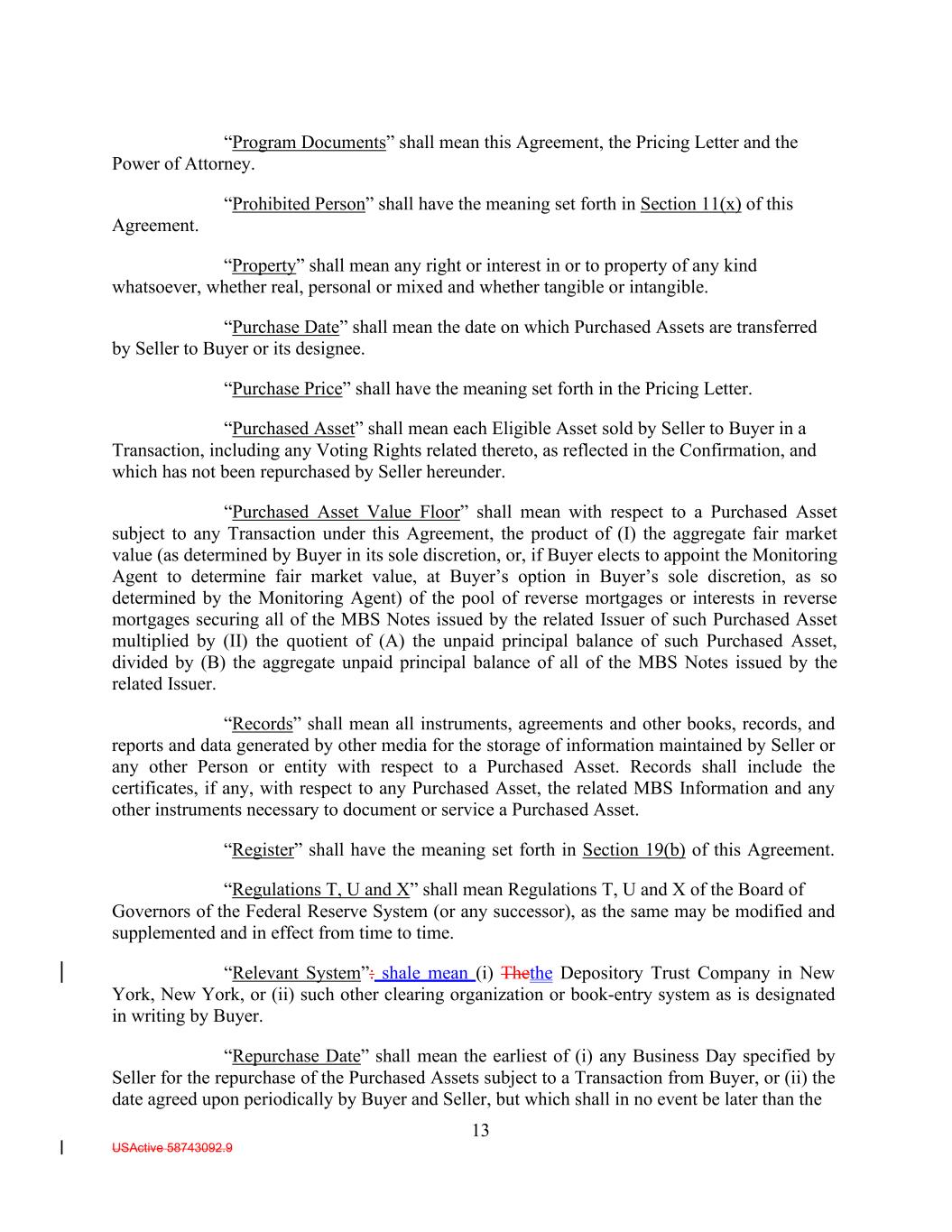 13 USActive 58743092.9 “Program Documents” shall mean this Agreement, the Pricing Letter and the Power of Attorney. “Prohibited Person” shall have the meaning set forth in Section 11(x) of this Agreement. “Property” shall mean any right or interest in or to property of any kind whatsoever, whether real, personal or mixed and whether tangible or intangible. “Purchase Date” shall mean the date on which Purchased Assets are transferred by Seller to Buyer or its designee. “Purchase Price” shall have the meaning set forth in the Pricing Letter. “Purchased Asset” shall mean each Eligible Asset sold by Seller to Buyer in a Transaction, including any Voting Rights related thereto, as reflected in the Confirmation, and which has not been repurchased by Seller hereunder. “Purchased Asset Value Floor” shall mean with respect to a Purchased Asset subject to any Transaction under this Agreement, the product of (I) the aggregate fair market value (as determined by Buyer in its sole discretion, or, if Buyer elects to appoint the Monitoring Agent to determine fair market value, at Buyer’s option in Buyer’s sole discretion, as so determined by the Monitoring Agent) of the pool of reverse mortgages or interests in reverse mortgages securing all of the MBS Notes issued by the related Issuer of such Purchased Asset multiplied by (II) the quotient of (A) the unpaid principal balance of such Purchased Asset, divided by (B) the aggregate unpaid principal balance of all of the MBS Notes issued by the related Issuer. “Records” shall mean all instruments, agreements and other books, records, and reports and data generated by other media for the storage of information maintained by Seller or any other Person or entity with respect to a Purchased Asset. Records shall include the certificates, if any, with respect to any Purchased Asset, the related MBS Information and any other instruments necessary to document or service a Purchased Asset. “Register” shall have the meaning set forth in Section 19(b) of this Agreement. “Regulations T, U and X” shall mean Regulations T, U and X of the Board of Governors of the Federal Reserve System (or any successor), as the same may be modified and supplemented and in effect from time to time. “Relevant System”: shale mean (i) Thethe Depository Trust Company in New York, New York, or (ii) such other clearing organization or book-entry system as is designated in writing by Buyer. “Repurchase Date” shall mean the earliest of (i) any Business Day specified by Seller for the repurchase of the Purchased Assets subject to a Transaction from Buyer, or (ii) the date agreed upon periodically by Buyer and Seller, but which shall in no event be later than the