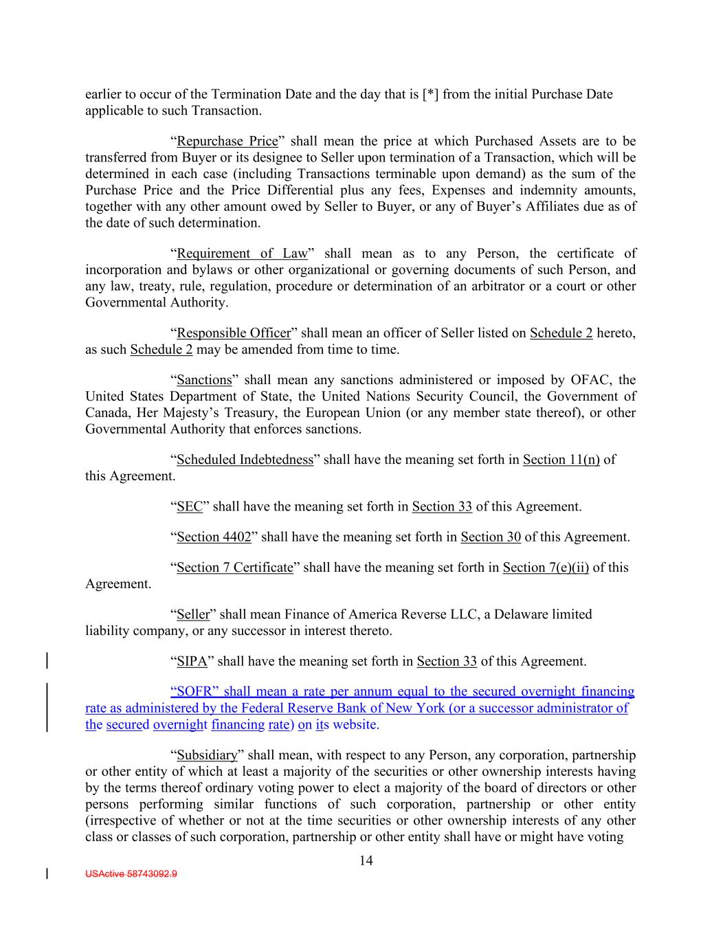 14 USActive 58743092.9 earlier to occur of the Termination Date and the day that is [*] from the initial Purchase Date applicable to such Transaction. “Repurchase Price” shall mean the price at which Purchased Assets are to be transferred from Buyer or its designee to Seller upon termination of a Transaction, which will be determined in each case (including Transactions terminable upon demand) as the sum of the Purchase Price and the Price Differential plus any fees, Expenses and indemnity amounts, together with any other amount owed by Seller to Buyer, or any of Buyer’s Affiliates due as of the date of such determination. “Requirement of Law” shall mean as to any Person, the certificate of incorporation and bylaws or other organizational or governing documents of such Person, and any law, treaty, rule, regulation, procedure or determination of an arbitrator or a court or other Governmental Authority. “Responsible Officer” shall mean an officer of Seller listed on Schedule 2 hereto, as such Schedule 2 may be amended from time to time. “Sanctions” shall mean any sanctions administered or imposed by OFAC, the United States Department of State, the United Nations Security Council, the Government of Canada, Her Majesty’s Treasury, the European Union (or any member state thereof), or other Governmental Authority that enforces sanctions. “Scheduled Indebtedness” shall have the meaning set forth in Section 11(n) of this Agreement. “SEC” shall have the meaning set forth in Section 33 of this Agreement. “Section 4402” shall have the meaning set forth in Section 30 of this Agreement. “Section 7 Certificate” shall have the meaning set forth in Section 7(e)(ii) of this Agreement. “Seller” shall mean Finance of America Reverse LLC, a Delaware limited liability company, or any successor in interest thereto. “SIPA” shall have the meaning set forth in Section 33 of this Agreement. “SOFR” shall mean a rate per annum equal to the secured overnight financing rate as administered by the Federal Reserve Bank of New York (or a successor administrator of the secured overnight financing rate) on its website. “Subsidiary” shall mean, with respect to any Person, any corporation, partnership or other entity of which at least a majority of the securities or other ownership interests having by the terms thereof ordinary voting power to elect a majority of the board of directors or other persons performing similar functions of such corporation, partnership or other entity (irrespective of whether or not at the time securities or other ownership interests of any other class or classes of such corporation, partnership or other entity shall have or might have voting
