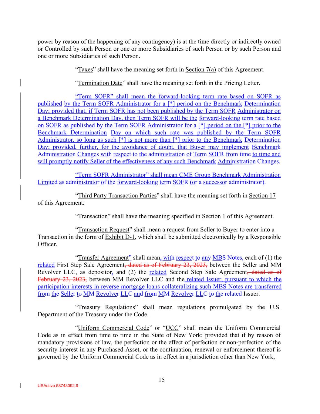 15 USActive 58743092.9 power by reason of the happening of any contingency) is at the time directly or indirectly owned or Controlled by such Person or one or more Subsidiaries of such Person or by such Person and one or more Subsidiaries of such Person. “Taxes” shall have the meaning set forth in Section 7(a) of this Agreement. “Termination Date” shall have the meaning set forth in the Pricing Letter. “Term SOFR” shall mean the forward-looking term rate based on SOFR as published by the Term SOFR Administrator for a [*] period on the Benchmark Determination Day; provided that, if Term SOFR has not been published by the Term SOFR Administrator on a Benchmark Determination Day, then Term SOFR will be the forward-looking term rate based on SOFR as published by the Term SOFR Administrator for a [*] period on the [*] prior to the Benchmark Determination Day on which such rate was published by the Term SOFR Administrator, so long as such [*] is not more than [*] prior to the Benchmark Determination Day; provided, further, for the avoidance of doubt, that Buyer may implement Benchmark Administration Changes with respect to the administration of Term SOFR from time to time and will promptly notify Seller of the effectiveness of any such Benchmark Administration Changes. “Term SOFR Administrator” shall mean CME Group Benchmark Administration Limited as administrator of the forward-looking term SOFR (or a successor administrator). “Third Party Transaction Parties” shall have the meaning set forth in Section 17 of this Agreement. “Transaction” shall have the meaning specified in Section 1 of this Agreement. “Transaction Request” shall mean a request from Seller to Buyer to enter into a Transaction in the form of Exhibit D-1, which shall be submitted electronically by a Responsible Officer. “Transfer Agreement” shall mean, with respect to any MBS Notes, each of (1) the related First Step Sale Agreement, dated as of February 23, 2023, between the Seller and MM Revolver LLC, as depositor, and (2) the related Second Step Sale Agreement, dated as of February 23, 2023, between MM Revolver LLC and the related Issuer, pursuant to which the participation interests in reverse mortgage loans collateralizing such MBS Notes are transferred from the Seller to MM Revolver LLC and from MM Revolver LLC to the related Issuer. “Treasury Regulations” shall mean regulations promulgated by the U.S. Department of the Treasury under the Code. “Uniform Commercial Code” or “UCC” shall mean the Uniform Commercial Code as in effect from time to time in the State of New York; provided that if by reason of mandatory provisions of law, the perfection or the effect of perfection or non-perfection of the security interest in any Purchased Asset, or the continuation, renewal or enforcement thereof is governed by the Uniform Commercial Code as in effect in a jurisdiction other than New York,