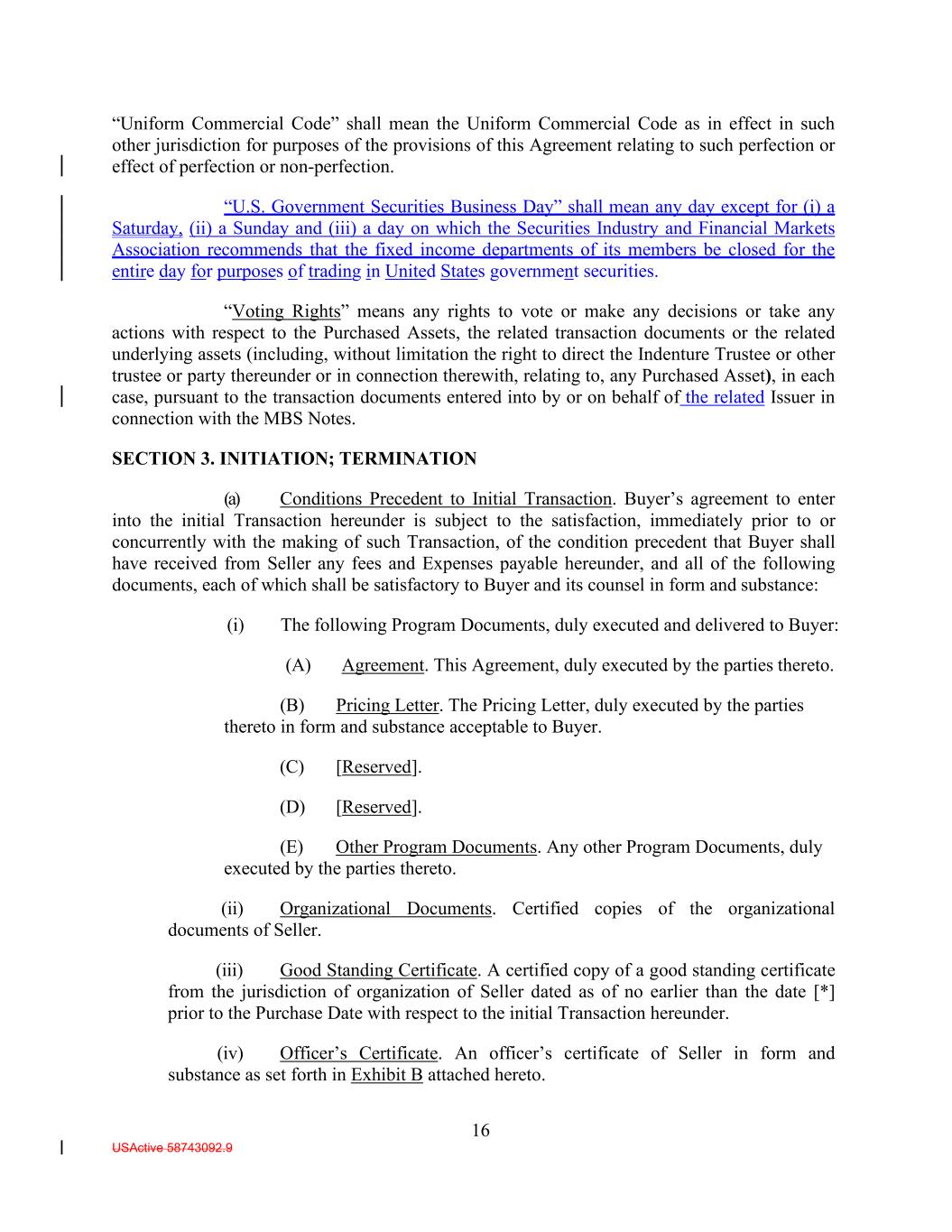 16 USActive 58743092.9 “Uniform Commercial Code” shall mean the Uniform Commercial Code as in effect in such other jurisdiction for purposes of the provisions of this Agreement relating to such perfection or effect of perfection or non-perfection. “U.S. Government Securities Business Day” shall mean any day except for (i) a Saturday, (ii) a Sunday and (iii) a day on which the Securities Industry and Financial Markets Association recommends that the fixed income departments of its members be closed for the entire day for purposes of trading in United States government securities. “Voting Rights” means any rights to vote or make any decisions or take any actions with respect to the Purchased Assets, the related transaction documents or the related underlying assets (including, without limitation the right to direct the Indenture Trustee or other trustee or party thereunder or in connection therewith, relating to, any Purchased Asset), in each case, pursuant to the transaction documents entered into by or on behalf of the related Issuer in connection with the MBS Notes. SECTION 3. INITIATION; TERMINATION (a) Conditions Precedent to Initial Transaction. Buyer’s agreement to enter into the initial Transaction hereunder is subject to the satisfaction, immediately prior to or concurrently with the making of such Transaction, of the condition precedent that Buyer shall have received from Seller any fees and Expenses payable hereunder, and all of the following documents, each of which shall be satisfactory to Buyer and its counsel in form and substance: (i) The following Program Documents, duly executed and delivered to Buyer: (A) Agreement. This Agreement, duly executed by the parties thereto. (B) Pricing Letter. The Pricing Letter, duly executed by the parties thereto in form and substance acceptable to Buyer. (C) [Reserved]. (D) [Reserved]. (E) Other Program Documents. Any other Program Documents, duly executed by the parties thereto. (ii) Organizational Documents. Certified copies of the organizational documents of Seller. (iii) Good Standing Certificate. A certified copy of a good standing certificate from the jurisdiction of organization of Seller dated as of no earlier than the date [*] prior to the Purchase Date with respect to the initial Transaction hereunder. (iv) Officer’s Certificate. An officer’s certificate of Seller in form and substance as set forth in Exhibit B attached hereto.