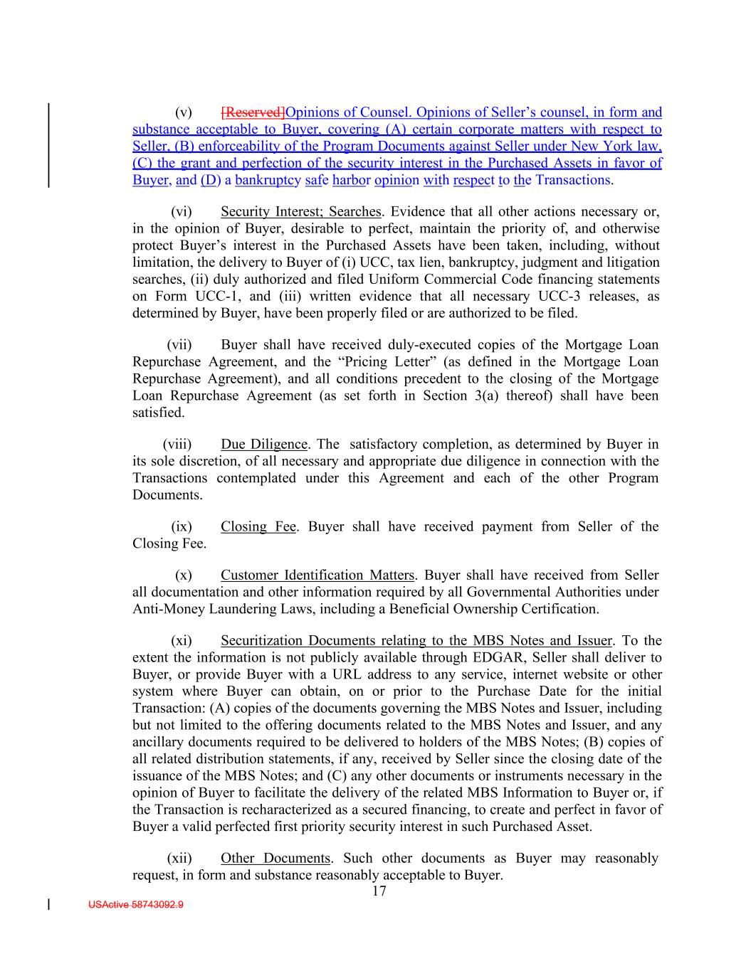 17 USActive 58743092.9 (v) [Reserved]Opinions of Counsel. Opinions of Seller’s counsel, in form and substance acceptable to Buyer, covering (A) certain corporate matters with respect to Seller, (B) enforceability of the Program Documents against Seller under New York law, (C) the grant and perfection of the security interest in the Purchased Assets in favor of Buyer, and (D) a bankruptcy safe harbor opinion with respect to the Transactions. (vi) Security Interest; Searches. Evidence that all other actions necessary or, in the opinion of Buyer, desirable to perfect, maintain the priority of, and otherwise protect Buyer’s interest in the Purchased Assets have been taken, including, without limitation, the delivery to Buyer of (i) UCC, tax lien, bankruptcy, judgment and litigation searches, (ii) duly authorized and filed Uniform Commercial Code financing statements on Form UCC-1, and (iii) written evidence that all necessary UCC-3 releases, as determined by Buyer, have been properly filed or are authorized to be filed. (vii) Buyer shall have received duly-executed copies of the Mortgage Loan Repurchase Agreement, and the “Pricing Letter” (as defined in the Mortgage Loan Repurchase Agreement), and all conditions precedent to the closing of the Mortgage Loan Repurchase Agreement (as set forth in Section 3(a) thereof) shall have been satisfied. (viii) Due Diligence. The satisfactory completion, as determined by Buyer in its sole discretion, of all necessary and appropriate due diligence in connection with the Transactions contemplated under this Agreement and each of the other Program Documents. (ix) Closing Fee. Buyer shall have received payment from Seller of the Closing Fee. (x) Customer Identification Matters. Buyer shall have received from Seller all documentation and other information required by all Governmental Authorities under Anti-Money Laundering Laws, including a Beneficial Ownership Certification. (xi) Securitization Documents relating to the MBS Notes and Issuer. To the extent the information is not publicly available through EDGAR, Seller shall deliver to Buyer, or provide Buyer with a URL address to any service, internet website or other system where Buyer can obtain, on or prior to the Purchase Date for the initial Transaction: (A) copies of the documents governing the MBS Notes and Issuer, including but not limited to the offering documents related to the MBS Notes and Issuer, and any ancillary documents required to be delivered to holders of the MBS Notes; (B) copies of all related distribution statements, if any, received by Seller since the closing date of the issuance of the MBS Notes; and (C) any other documents or instruments necessary in the opinion of Buyer to facilitate the delivery of the related MBS Information to Buyer or, if the Transaction is recharacterized as a secured financing, to create and perfect in favor of Buyer a valid perfected first priority security interest in such Purchased Asset. (xii) Other Documents. Such other documents as Buyer may reasonably request, in form and substance reasonably acceptable to Buyer.