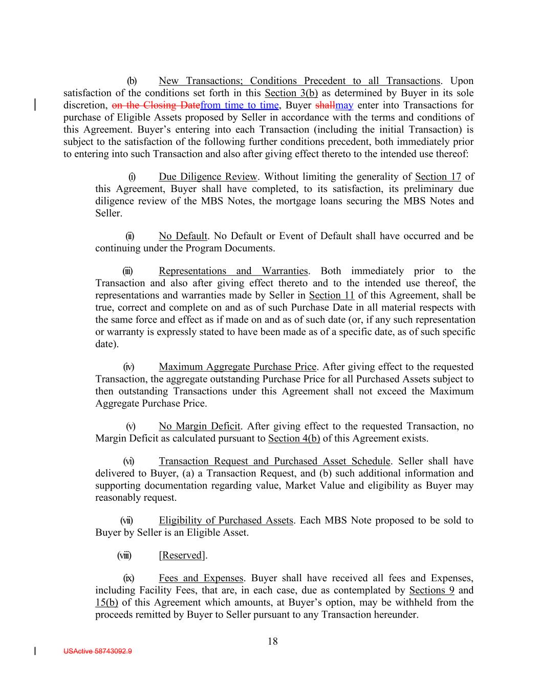 18 USActive 58743092.9 (b) New Transactions; Conditions Precedent to all Transactions. Upon satisfaction of the conditions set forth in this Section 3(b) as determined by Buyer in its sole discretion, on the Closing Datefrom time to time, Buyer shallmay enter into Transactions for purchase of Eligible Assets proposed by Seller in accordance with the terms and conditions of this Agreement. Buyer’s entering into each Transaction (including the initial Transaction) is subject to the satisfaction of the following further conditions precedent, both immediately prior to entering into such Transaction and also after giving effect thereto to the intended use thereof: (i) Due Diligence Review. Without limiting the generality of Section 17 of this Agreement, Buyer shall have completed, to its satisfaction, its preliminary due diligence review of the MBS Notes, the mortgage loans securing the MBS Notes and Seller. (ii) No Default. No Default or Event of Default shall have occurred and be continuing under the Program Documents. (iii) Representations and Warranties. Both immediately prior to the Transaction and also after giving effect thereto and to the intended use thereof, the representations and warranties made by Seller in Section 11 of this Agreement, shall be true, correct and complete on and as of such Purchase Date in all material respects with the same force and effect as if made on and as of such date (or, if any such representation or warranty is expressly stated to have been made as of a specific date, as of such specific date). (iv) Maximum Aggregate Purchase Price. After giving effect to the requested Transaction, the aggregate outstanding Purchase Price for all Purchased Assets subject to then outstanding Transactions under this Agreement shall not exceed the Maximum Aggregate Purchase Price. (v) No Margin Deficit. After giving effect to the requested Transaction, no Margin Deficit as calculated pursuant to Section 4(b) of this Agreement exists. (vi) Transaction Request and Purchased Asset Schedule. Seller shall have delivered to Buyer, (a) a Transaction Request, and (b) such additional information and supporting documentation regarding value, Market Value and eligibility as Buyer may reasonably request. (vii) Eligibility of Purchased Assets. Each MBS Note proposed to be sold to Buyer by Seller is an Eligible Asset. (viii) [Reserved]. (ix) Fees and Expenses. Buyer shall have received all fees and Expenses, including Facility Fees, that are, in each case, due as contemplated by Sections 9 and 15(b) of this Agreement which amounts, at Buyer’s option, may be withheld from the proceeds remitted by Buyer to Seller pursuant to any Transaction hereunder.