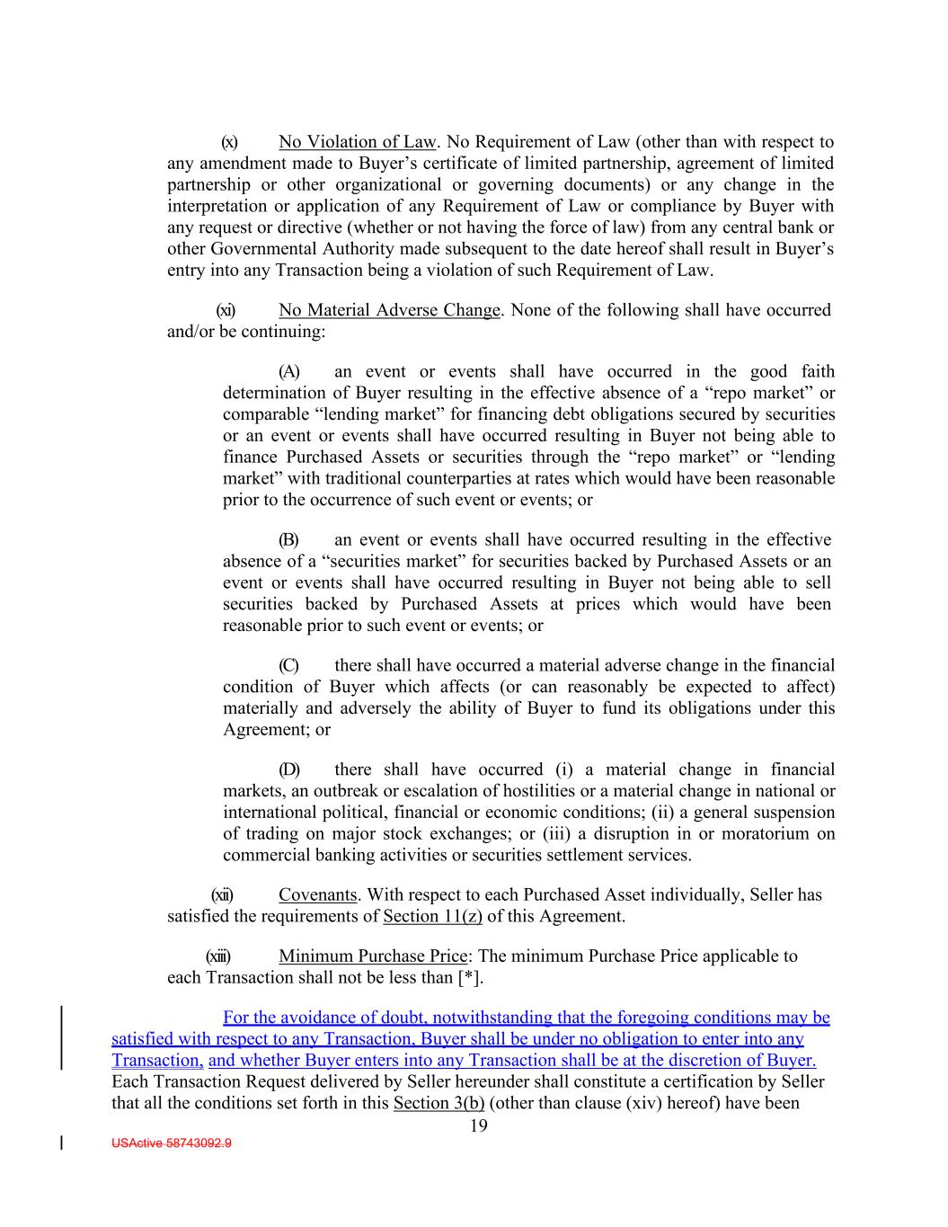 19 USActive 58743092.9 (x) No Violation of Law. No Requirement of Law (other than with respect to any amendment made to Buyer’s certificate of limited partnership, agreement of limited partnership or other organizational or governing documents) or any change in the interpretation or application of any Requirement of Law or compliance by Buyer with any request or directive (whether or not having the force of law) from any central bank or other Governmental Authority made subsequent to the date hereof shall result in Buyer’s entry into any Transaction being a violation of such Requirement of Law. (xi) No Material Adverse Change. None of the following shall have occurred and/or be continuing: (A) an event or events shall have occurred in the good faith determination of Buyer resulting in the effective absence of a “repo market” or comparable “lending market” for financing debt obligations secured by securities or an event or events shall have occurred resulting in Buyer not being able to finance Purchased Assets or securities through the “repo market” or “lending market” with traditional counterparties at rates which would have been reasonable prior to the occurrence of such event or events; or (B) an event or events shall have occurred resulting in the effective absence of a “securities market” for securities backed by Purchased Assets or an event or events shall have occurred resulting in Buyer not being able to sell securities backed by Purchased Assets at prices which would have been reasonable prior to such event or events; or (C) there shall have occurred a material adverse change in the financial condition of Buyer which affects (or can reasonably be expected to affect) materially and adversely the ability of Buyer to fund its obligations under this Agreement; or (D) there shall have occurred (i) a material change in financial markets, an outbreak or escalation of hostilities or a material change in national or international political, financial or economic conditions; (ii) a general suspension of trading on major stock exchanges; or (iii) a disruption in or moratorium on commercial banking activities or securities settlement services. (xii) Covenants. With respect to each Purchased Asset individually, Seller has satisfied the requirements of Section 11(z) of this Agreement. (xiii) Minimum Purchase Price: The minimum Purchase Price applicable to each Transaction shall not be less than [*]. For the avoidance of doubt, notwithstanding that the foregoing conditions may be satisfied with respect to any Transaction, Buyer shall be under no obligation to enter into any Transaction, and whether Buyer enters into any Transaction shall be at the discretion of Buyer. Each Transaction Request delivered by Seller hereunder shall constitute a certification by Seller that all the conditions set forth in this Section 3(b) (other than clause (xiv) hereof) have been